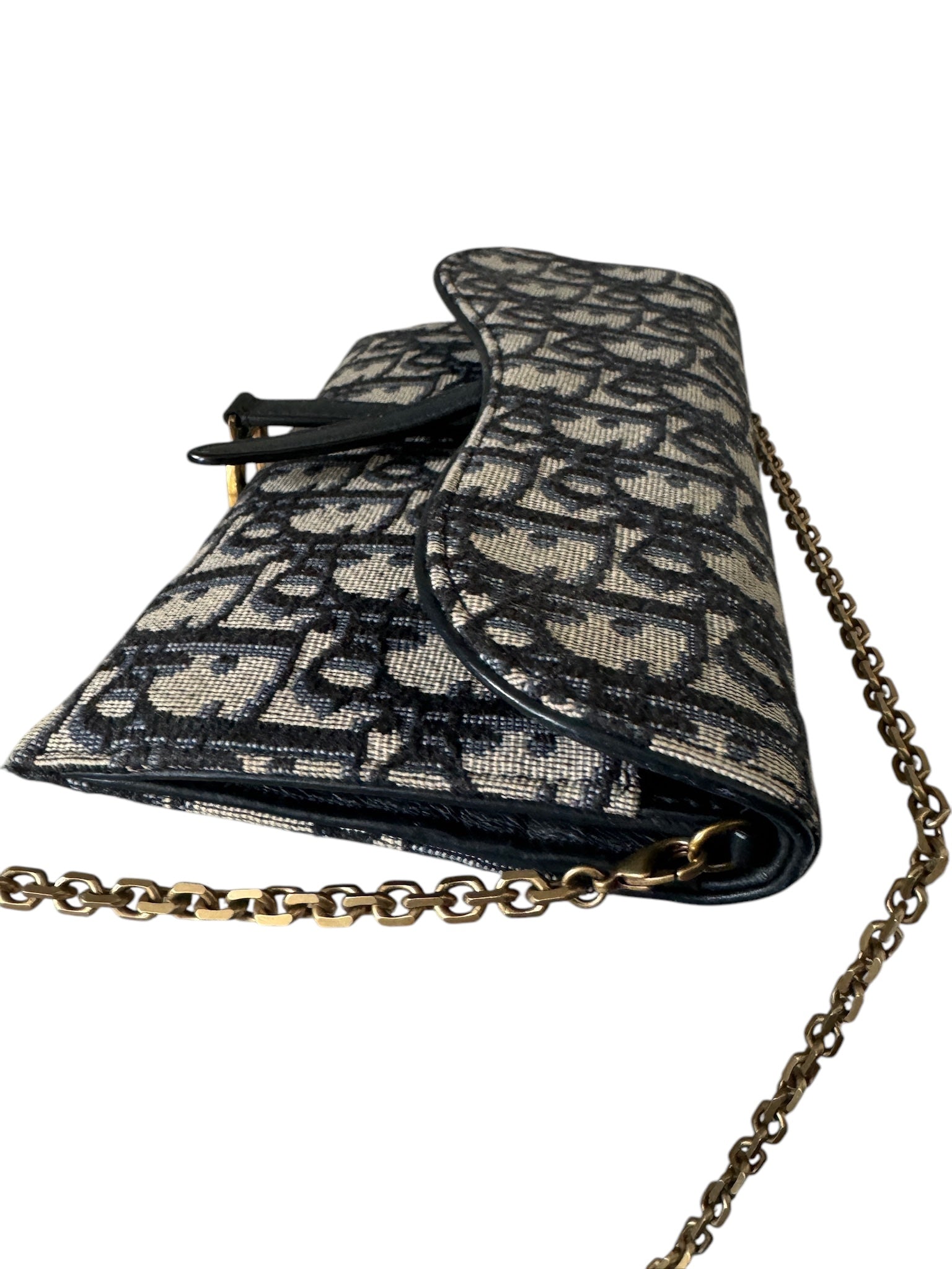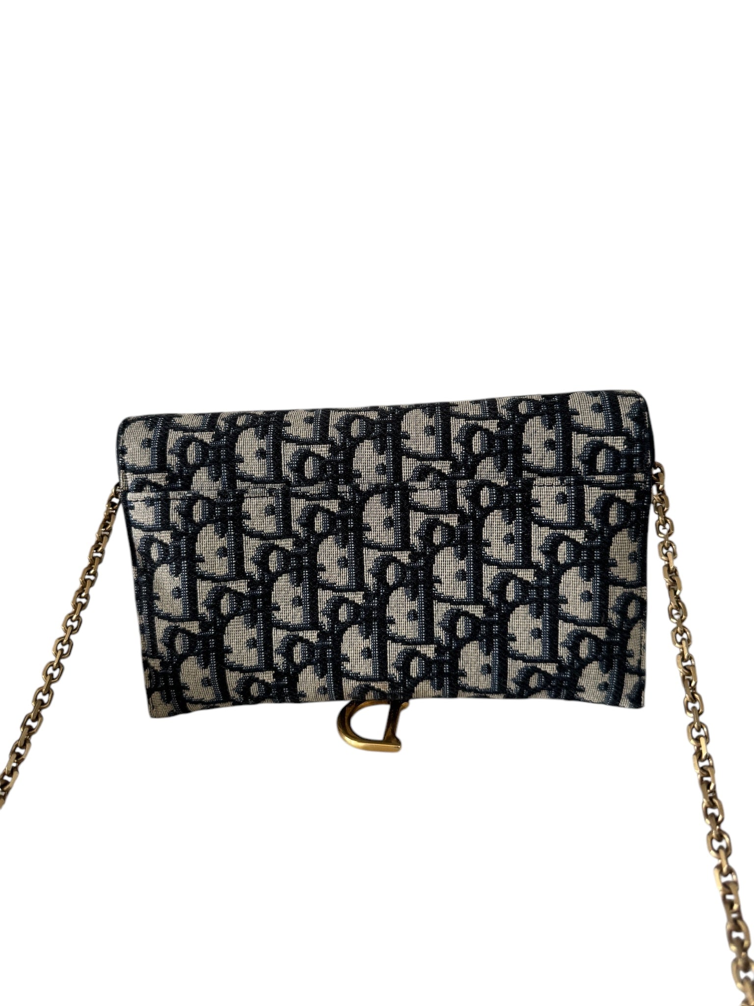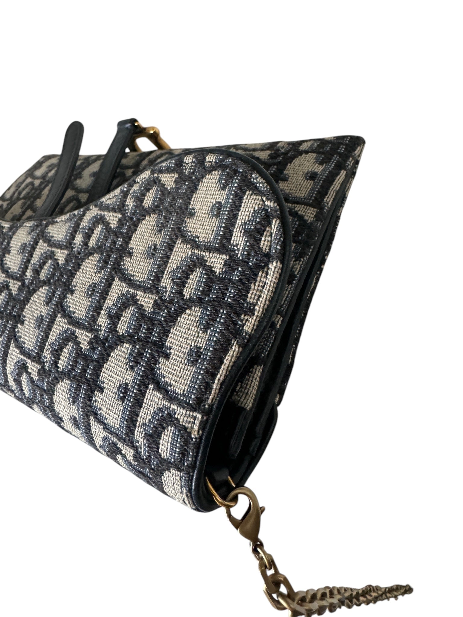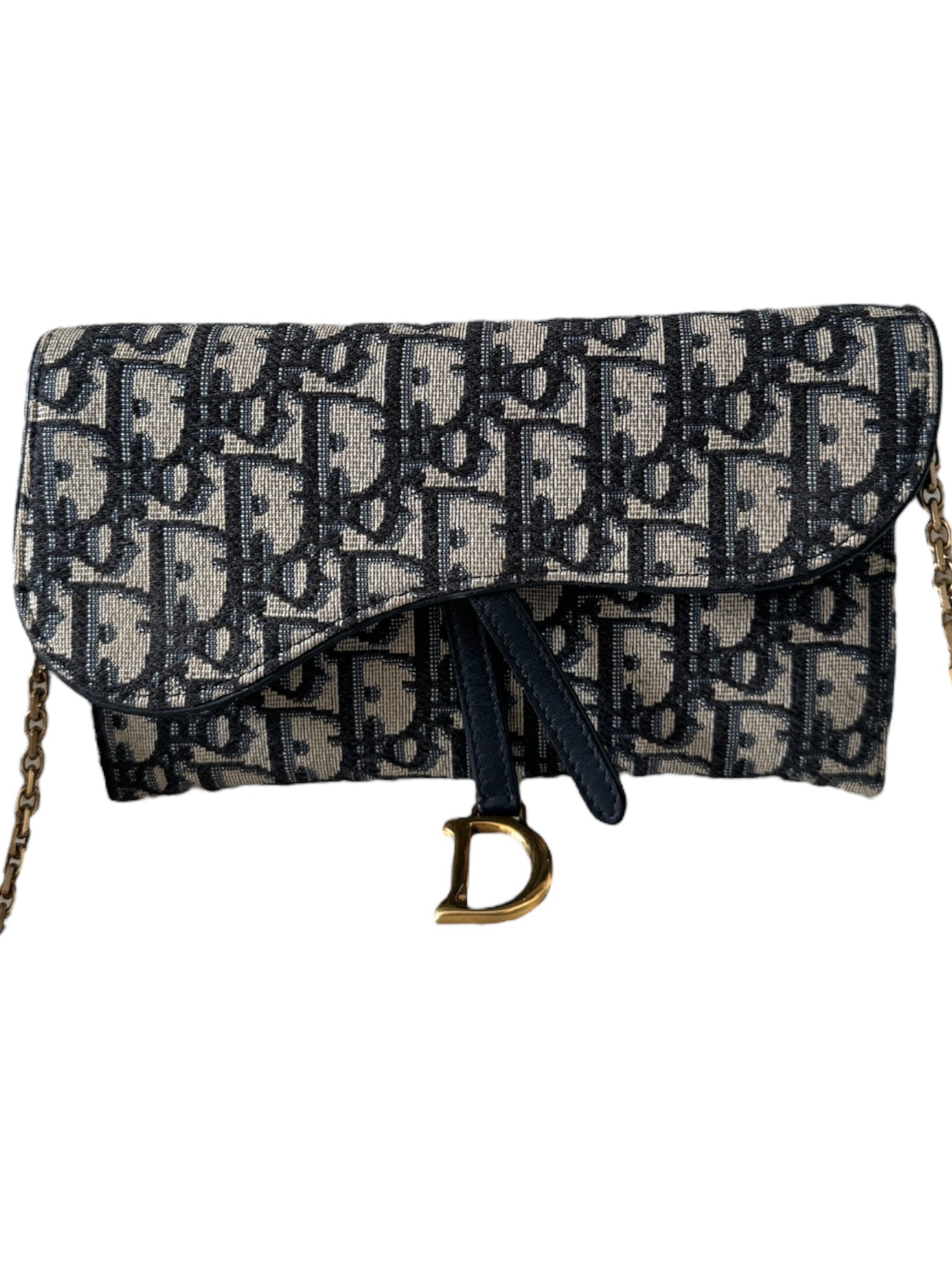 Experimente la mejor combinación de estilo y conveniencia con nuestra billetera con cadena para CD de USO PREVIO. Con herrajes en tono dorado y medidas de 7,25'' x 1'' x 4,3'', este accesorio versátil y elegante es perfecto para cualquier estilo de vida en movimiento. ¡Agregue un toque de lujo a su rutina diaria y actualice su billetera de lona azul Saddle Oblique hoy mismo!