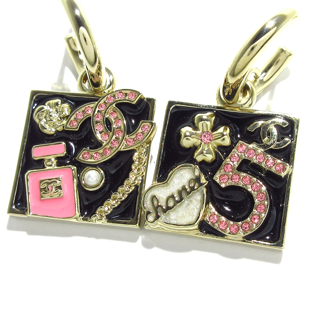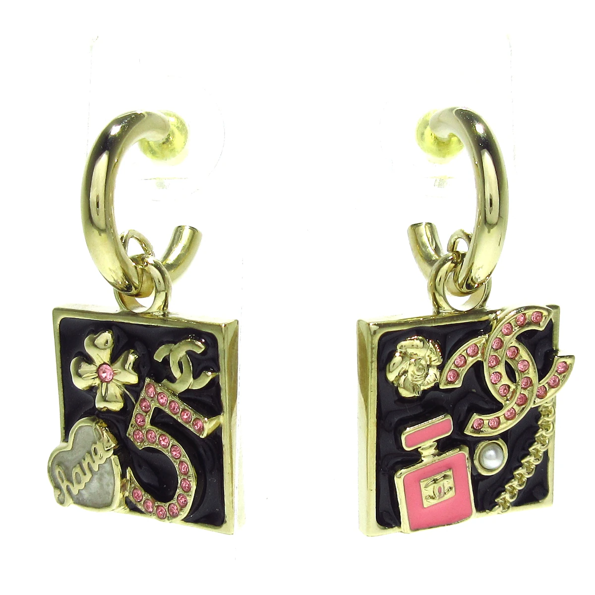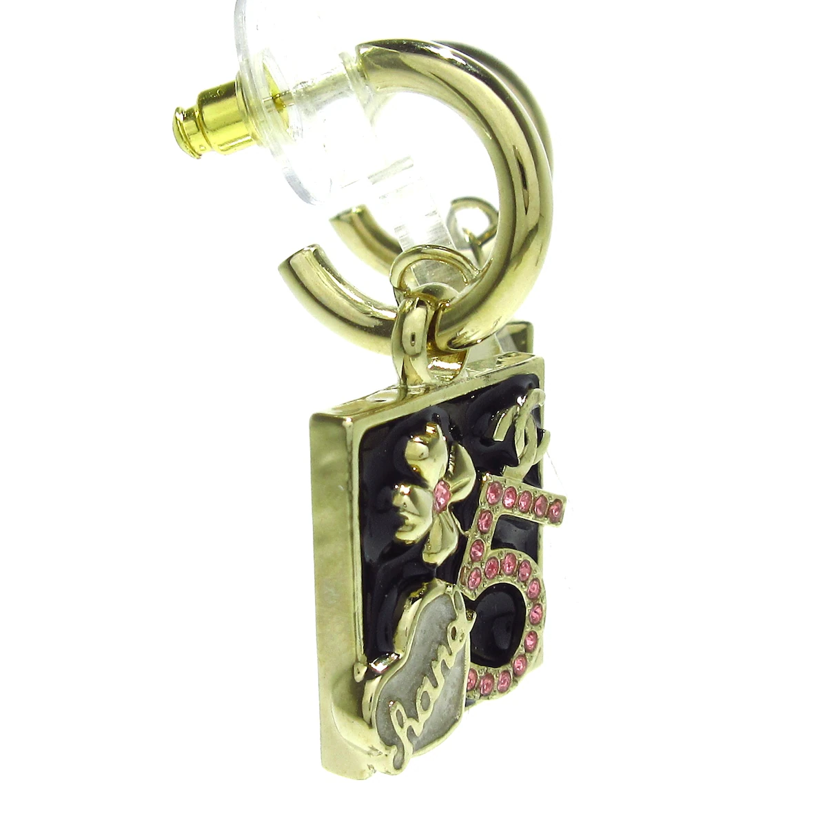 Realza tu estilo con estos impresionantes pendientes Coco Mark/Camellia/No.5 de Chanel Gold Black Hardware Rhinestones usados. En muy buen estado, añaden un toque de glamour a cualquier atuendo. Los pequeños rayones y la falta de brillo solo se suman a su encanto único. Haz una declaración con estos pendientes únicos.