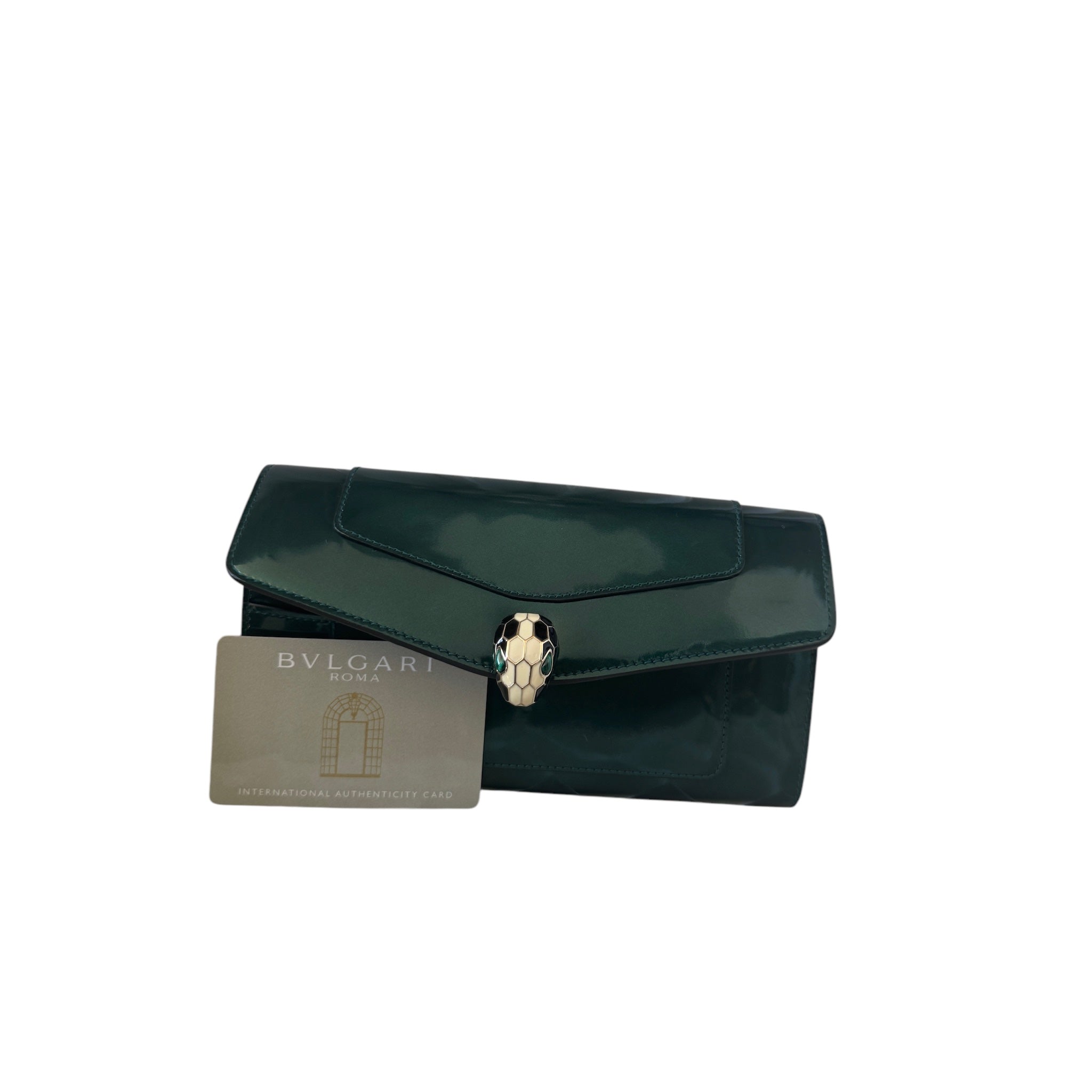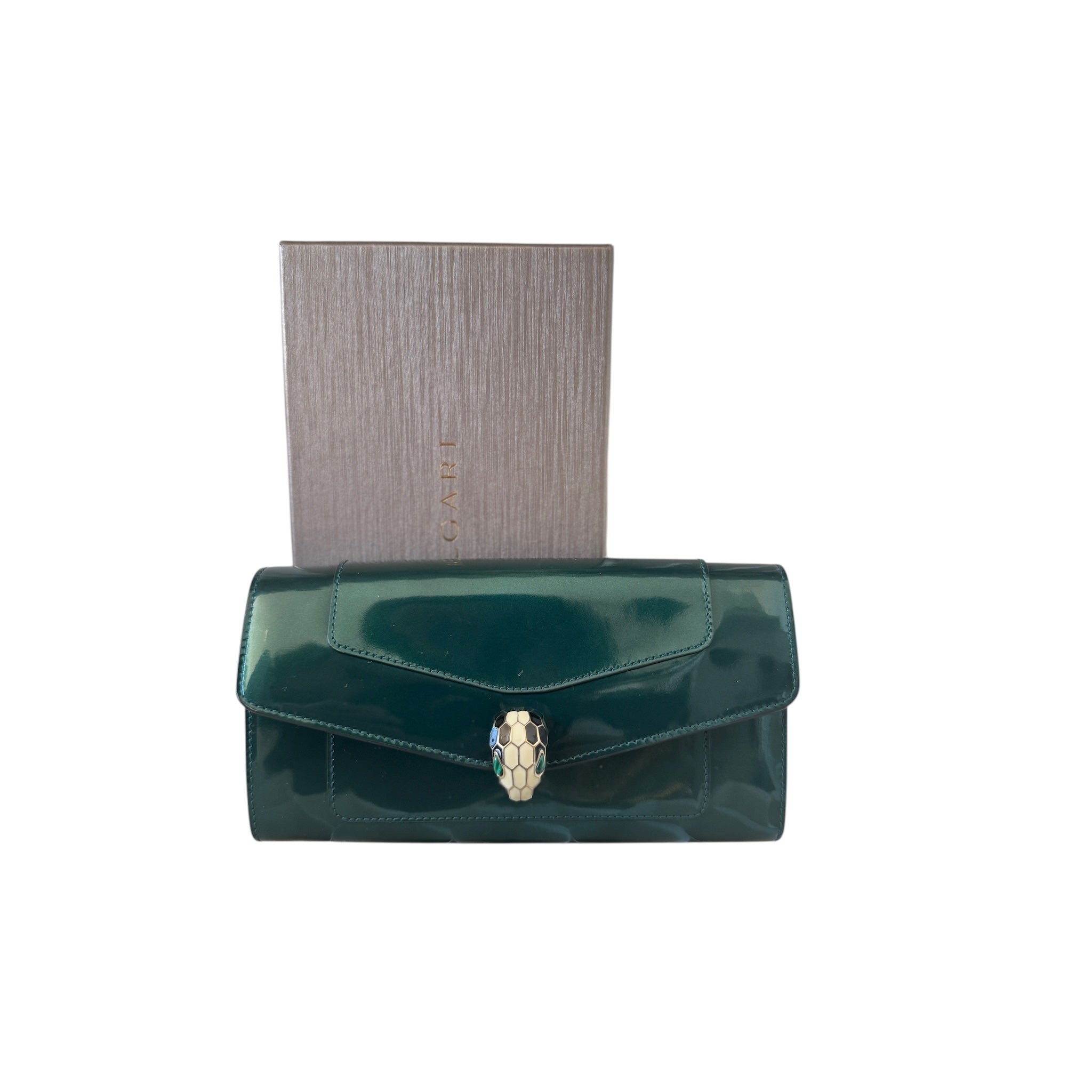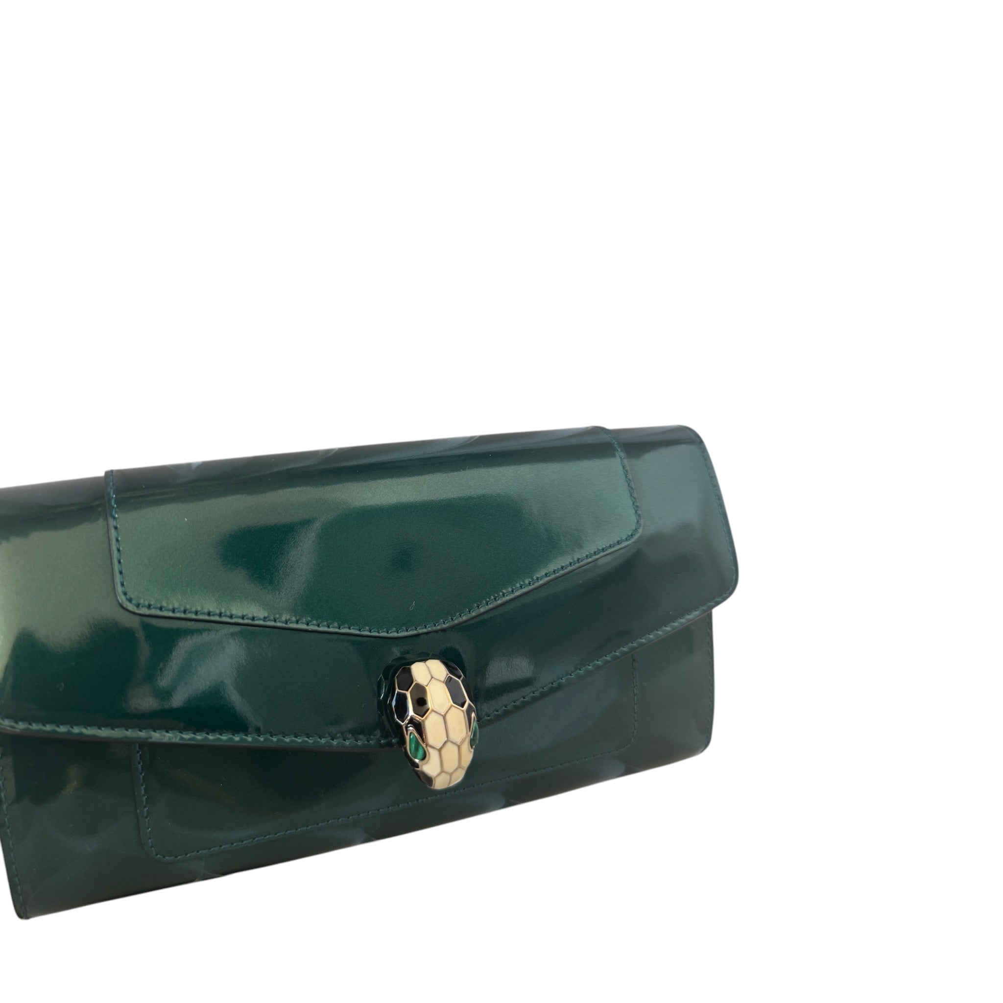 Añade un toque de elegancia a tu colección con la cartera BVLGARI - Serpenti Forever de cuero verde metalizado.