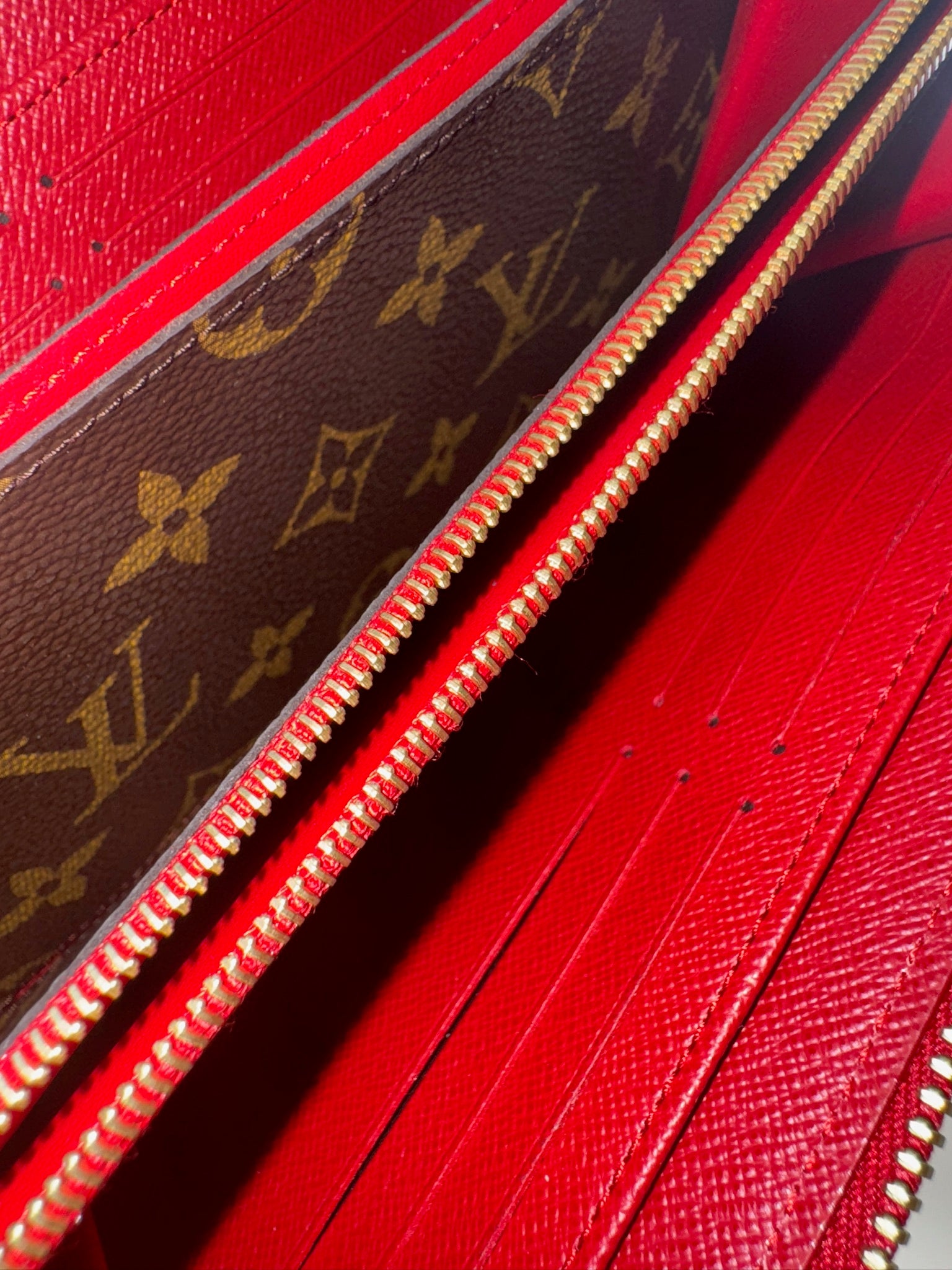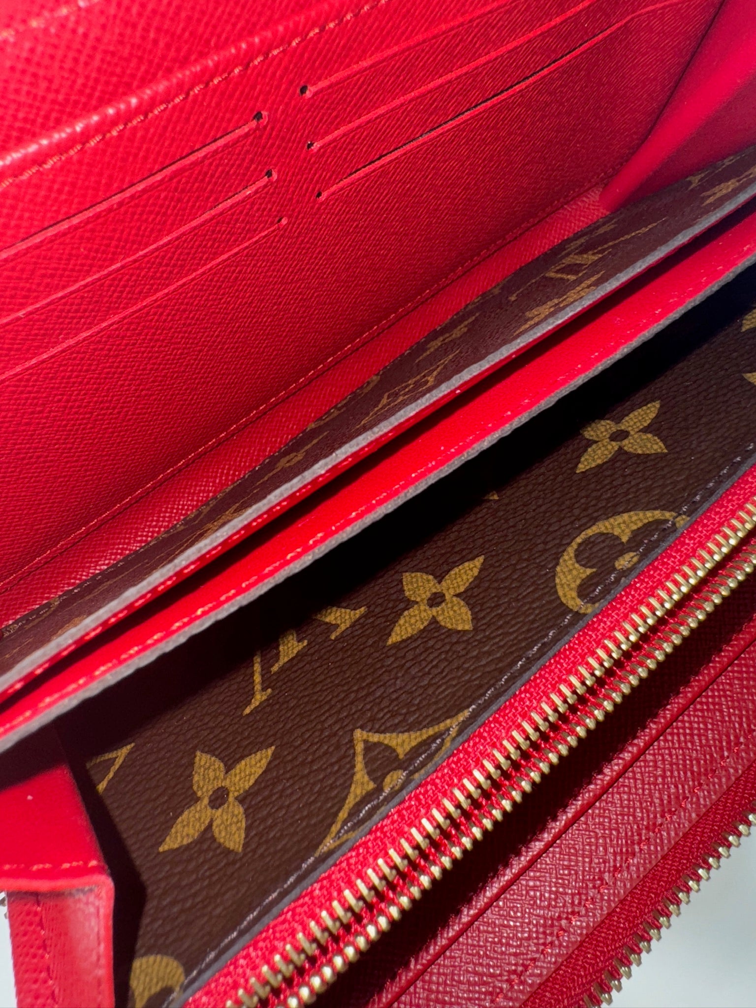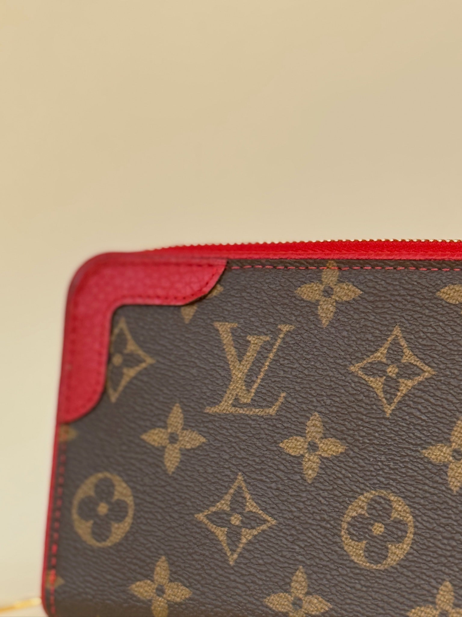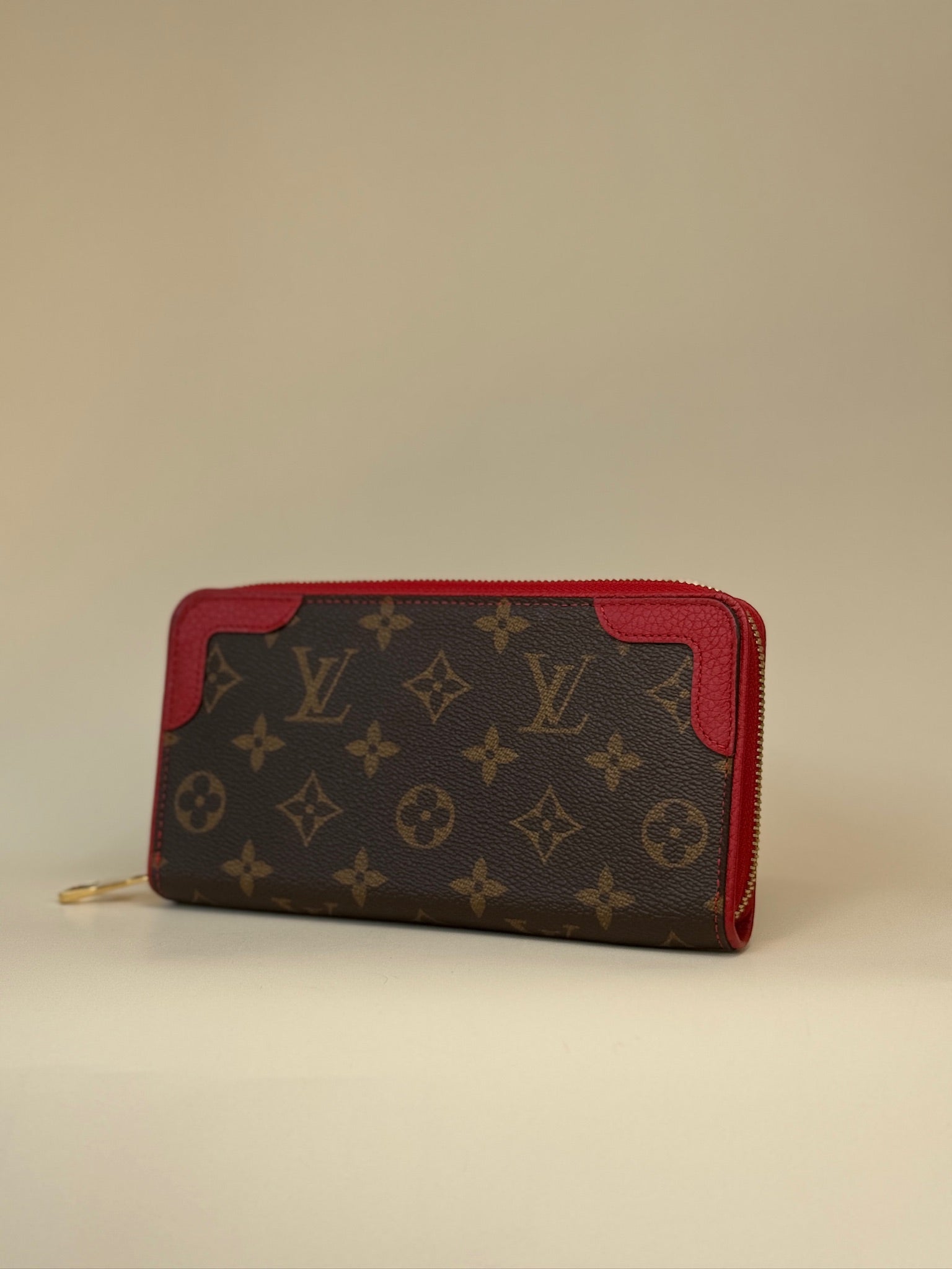 La cartera Retiro Zippy de LOUIS VUITTON combina un llamativo tono rojo cereza con el icónico lienzo con monograma. Esta cartera combina a la perfección estilo y funcionalidad.