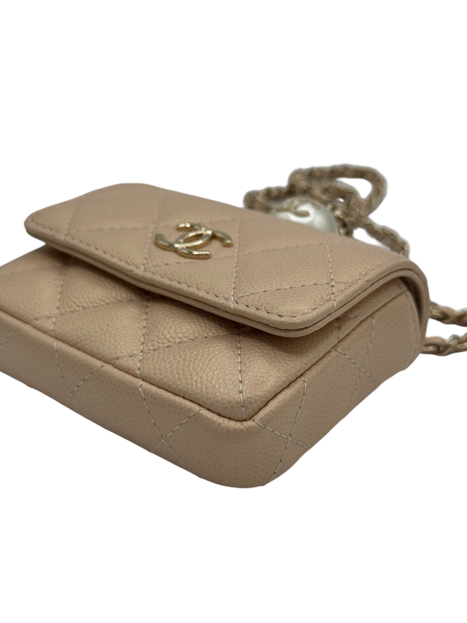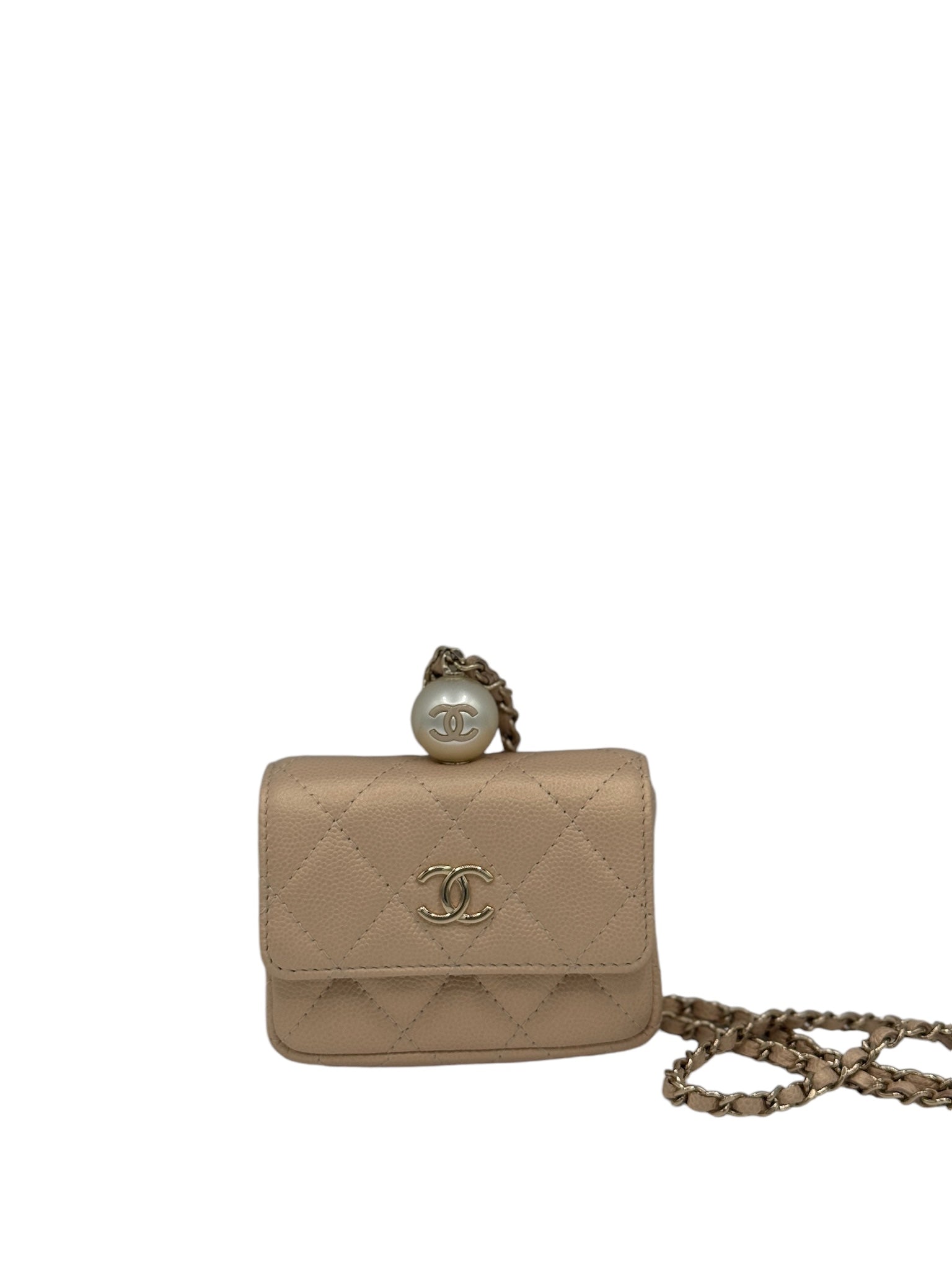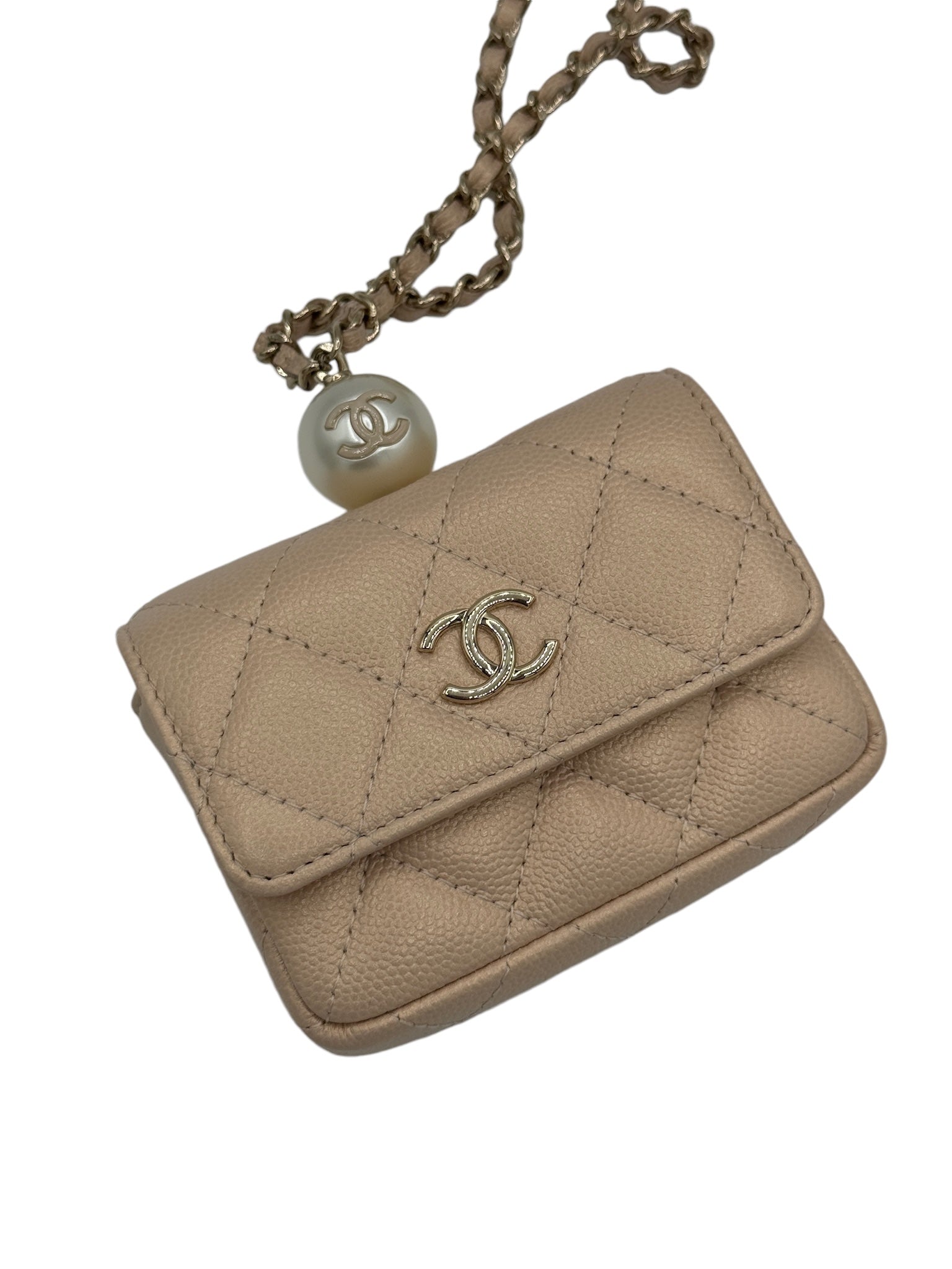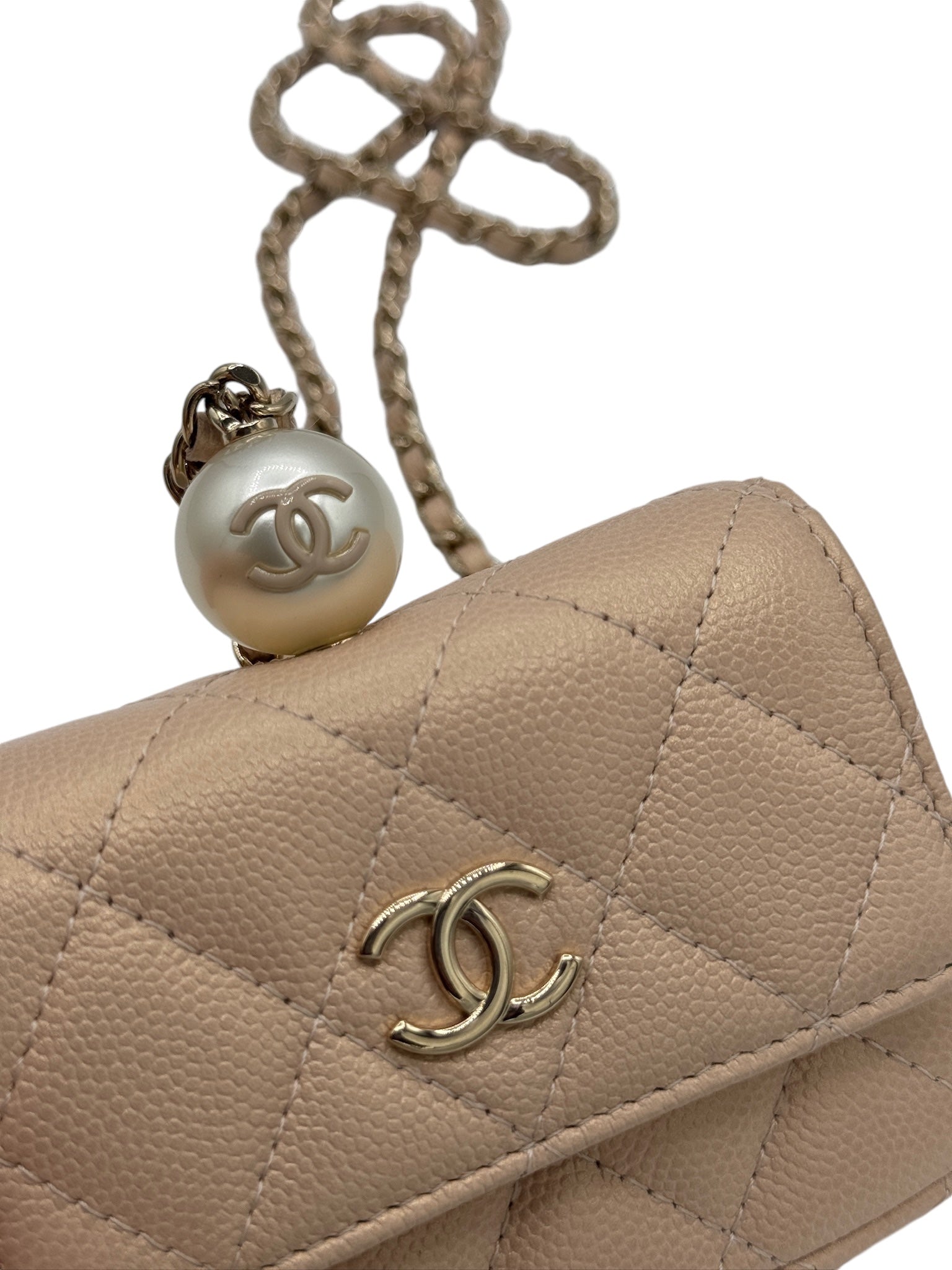 Tarjetero acolchado con cadena CC Pearl Beige iridiscente de caviar USADO