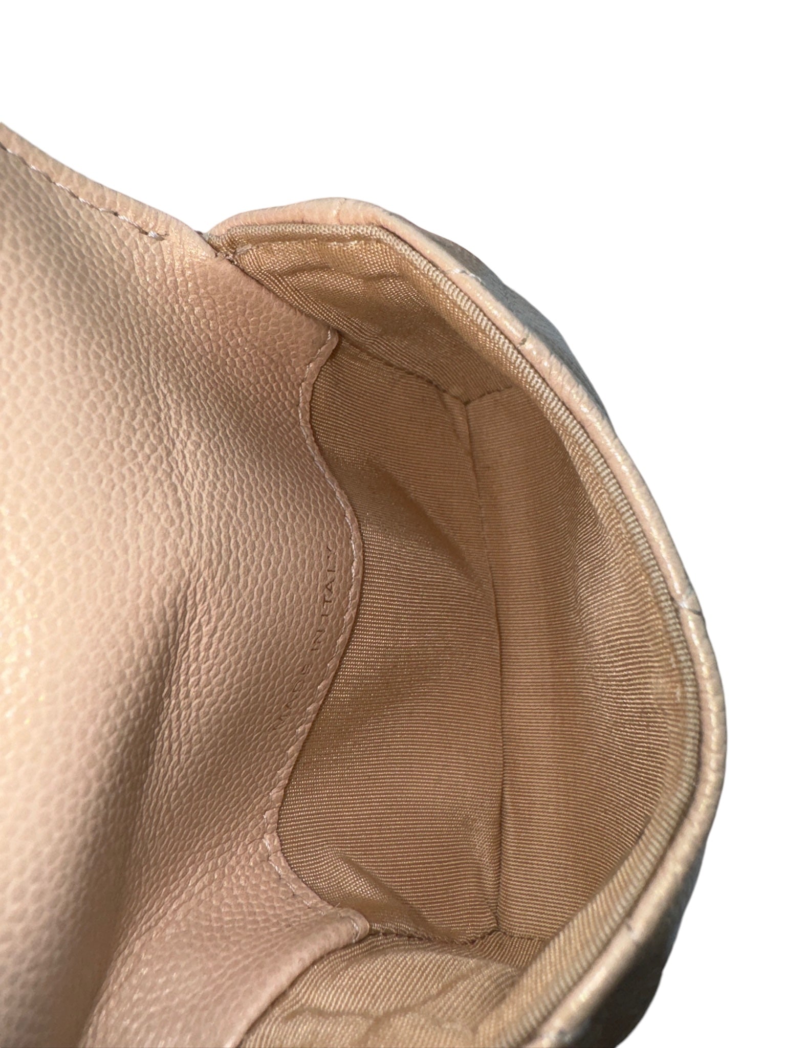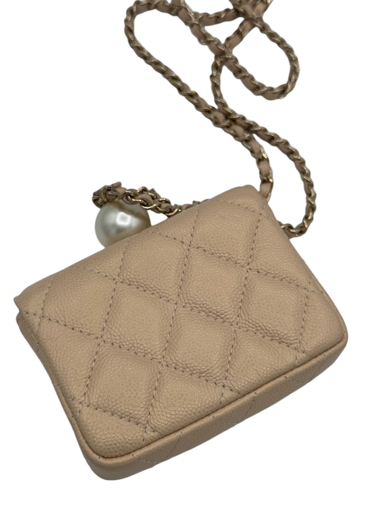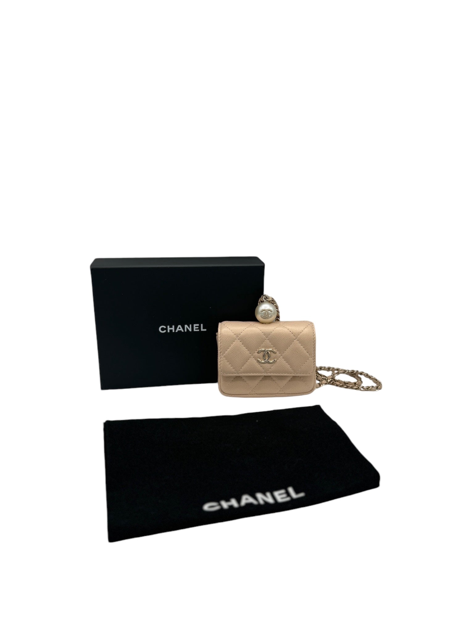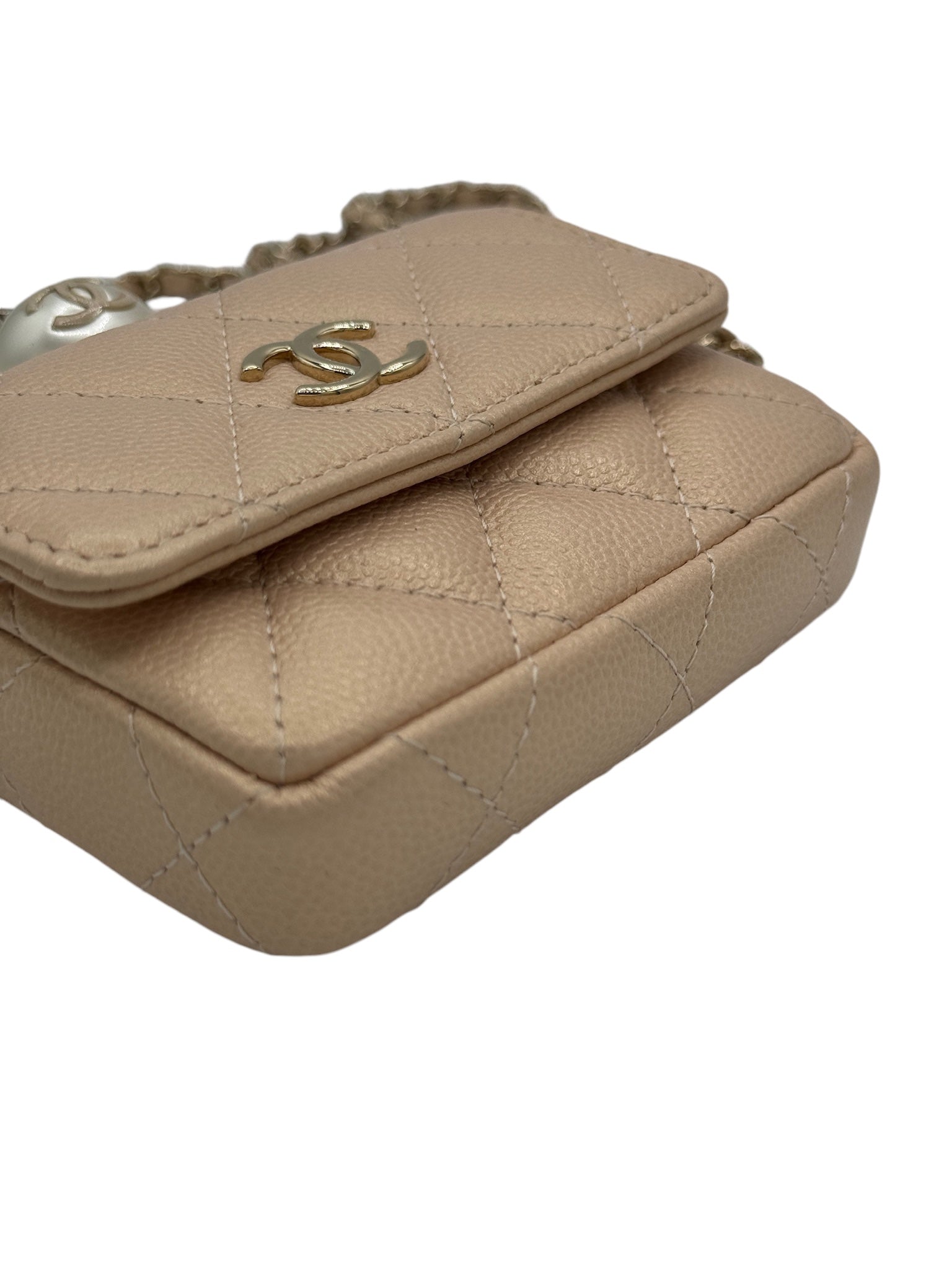 Tarjetero acolchado con cadena CC Pearl Beige iridiscente de caviar USADO