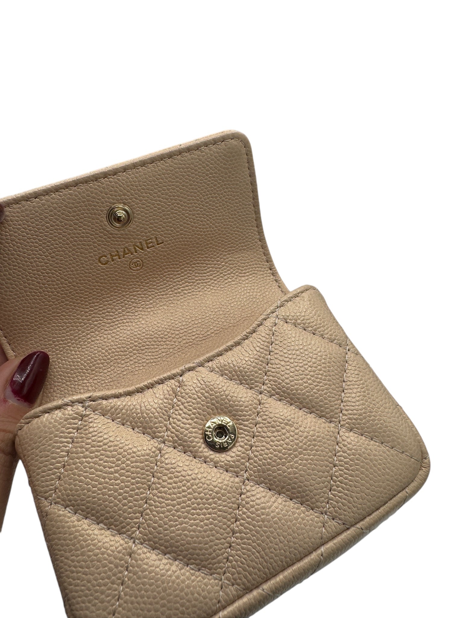 Este tarjetero acolchado caviar iridiscente beige perla de CHANEL usado con cadena es un lujoso artículo de cuero pequeño en excelentes condiciones, perfecto para agregar un toque de elegancia a su colección de accesorios.