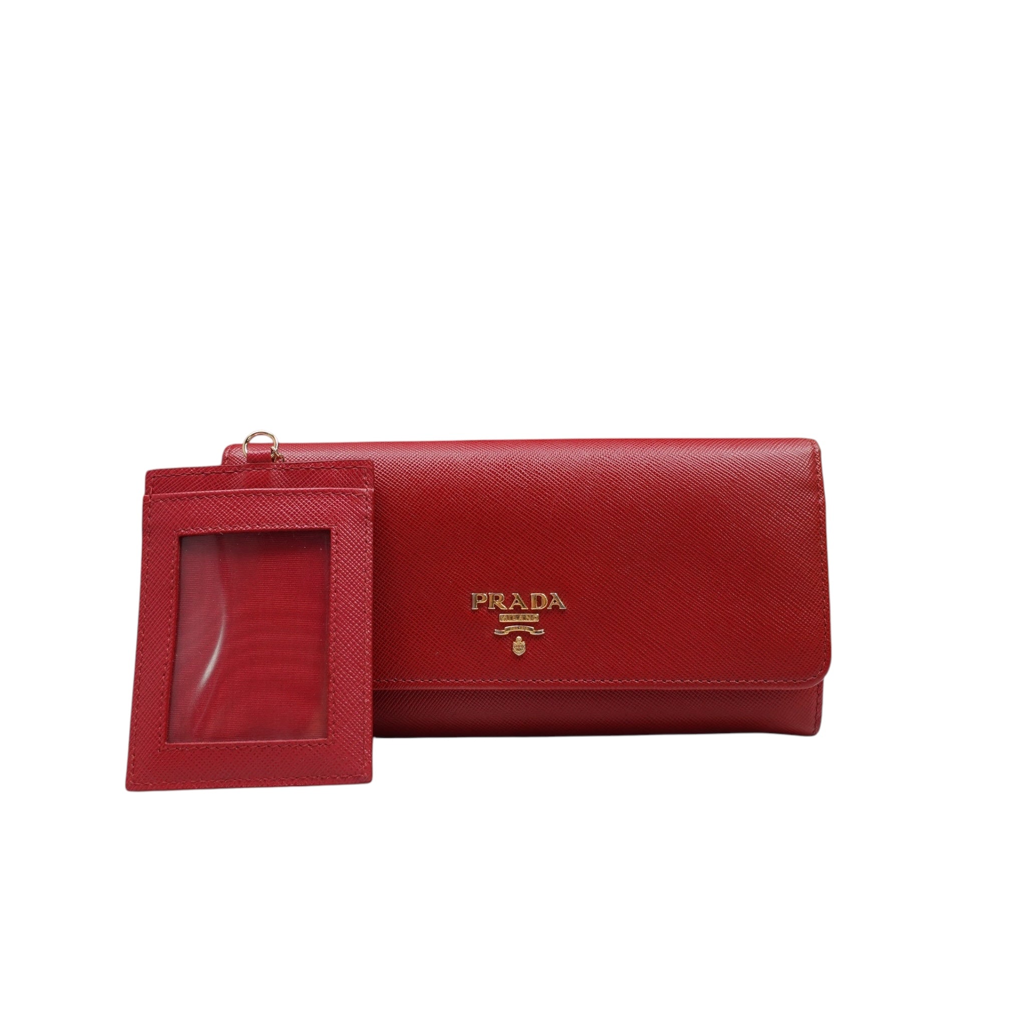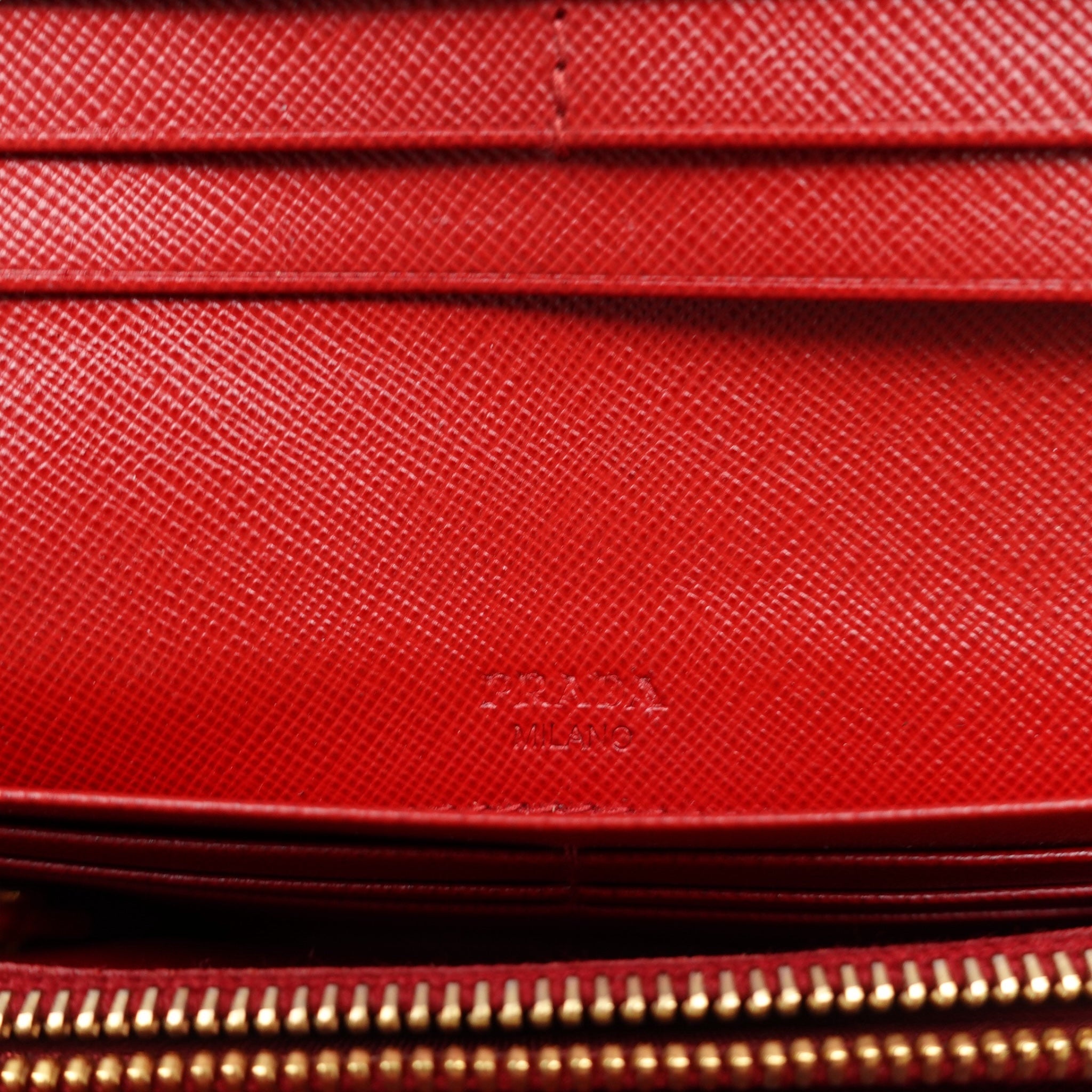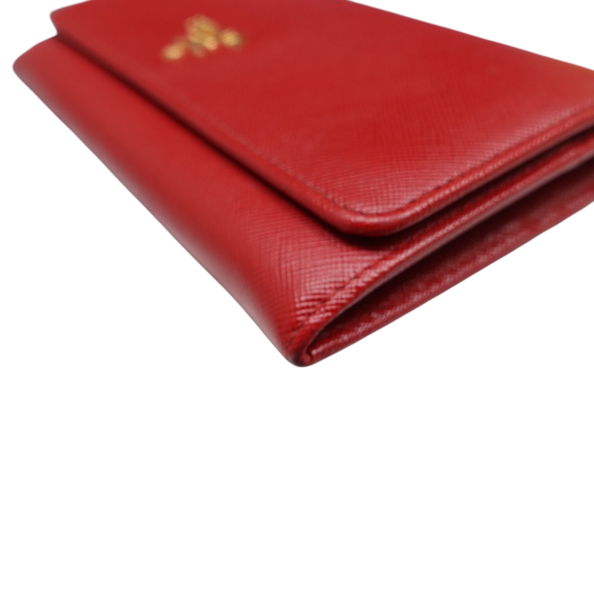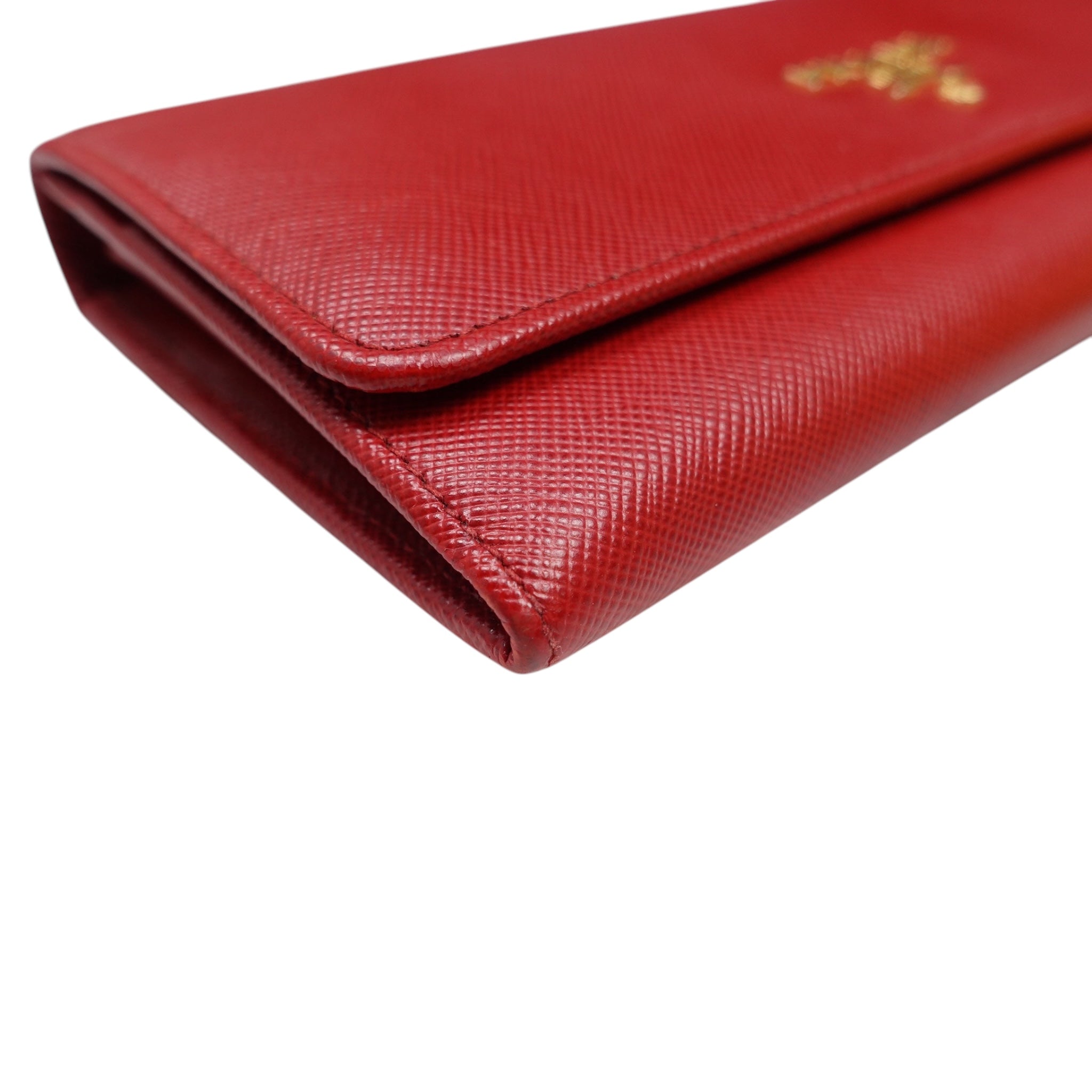 Mejore sus accesorios con la billetera larga continental de cuero saffiano rojo de PRADA, donde el lujo se combina con la practicidad.