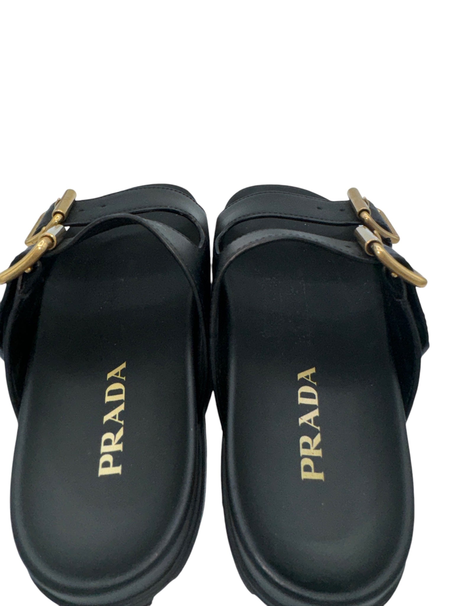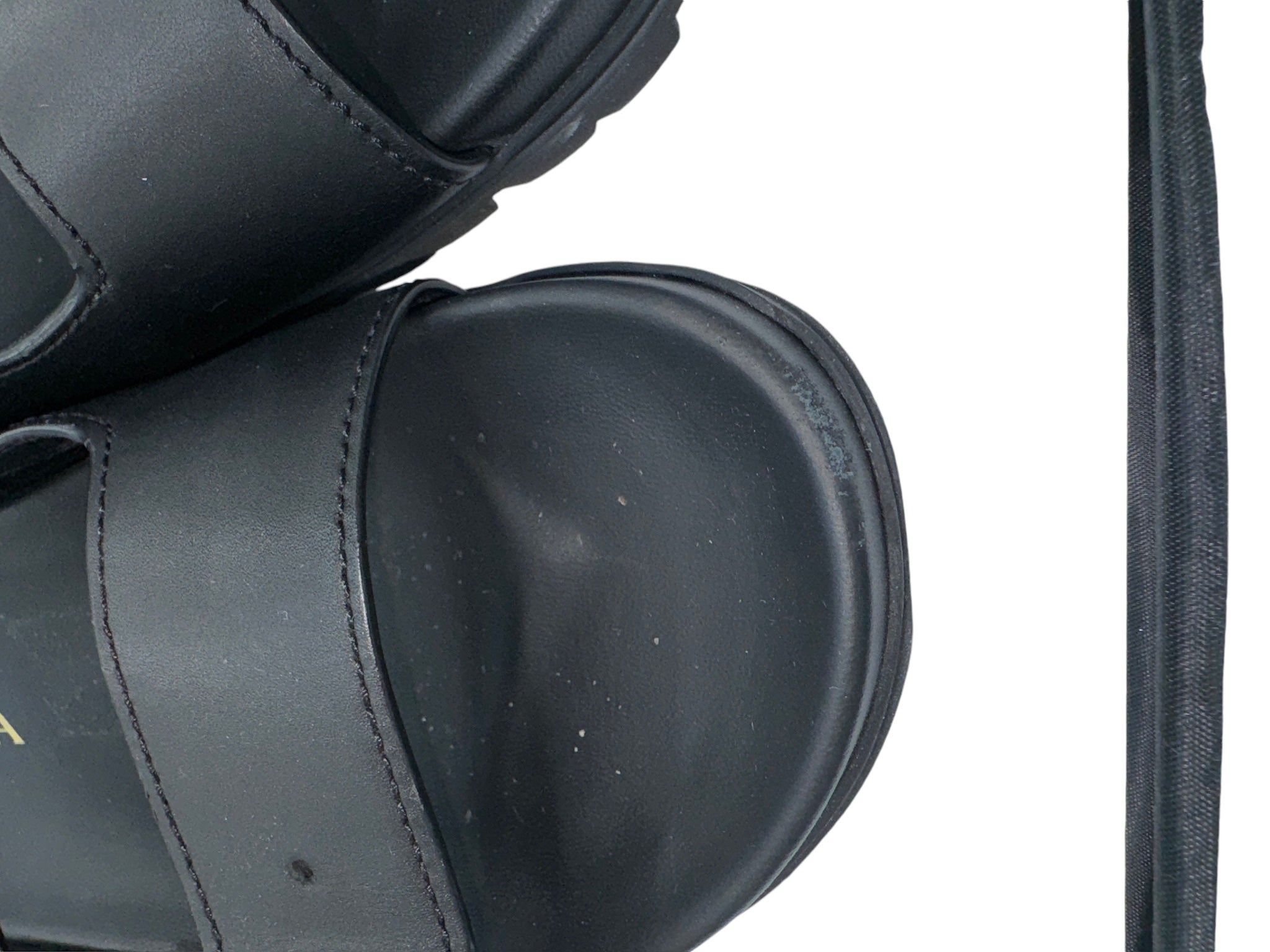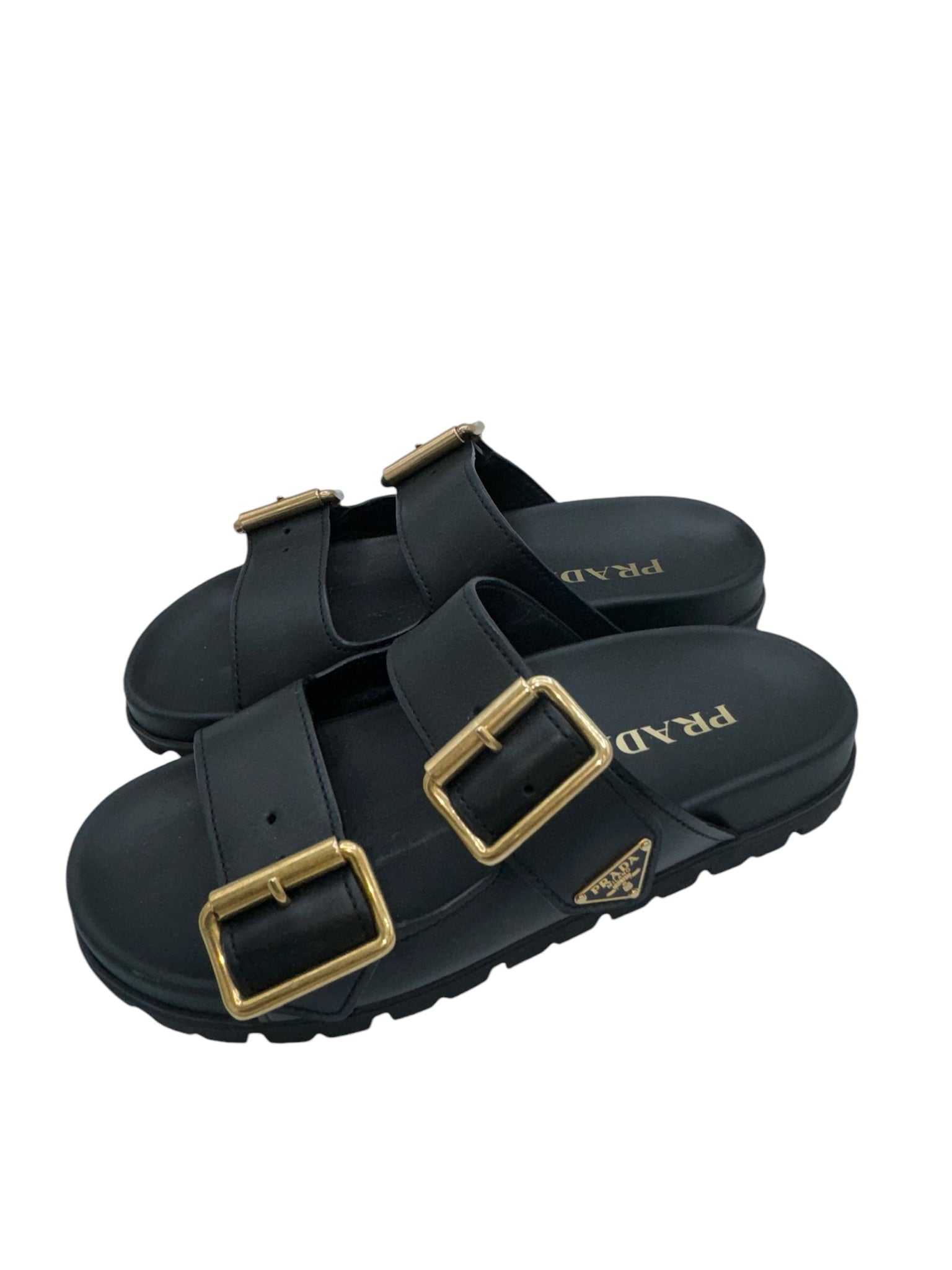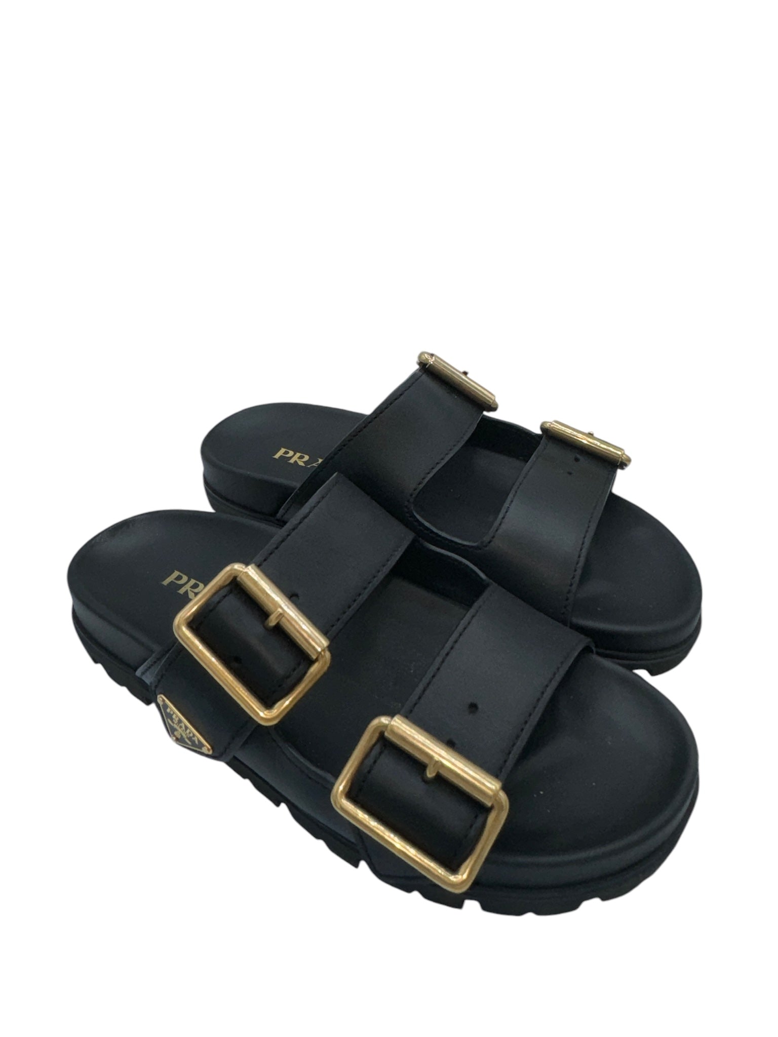 Realza tu estilo con estas sandalias PRADA de segunda mano en piel negra. En buen estado y con su caja original. Fabricadas con materiales de calidad, el exterior puede mostrar un ligero desgaste, pero aún así mantiene su forma. Perfectas para una talla 37 (EE. UU. 6.5) y listas para usar en cualquier ocasión.
