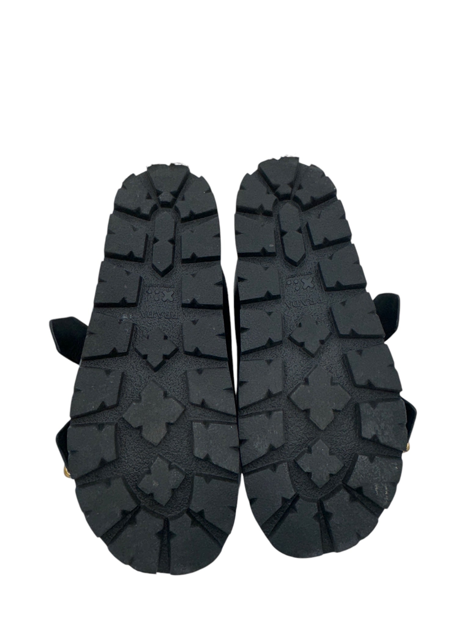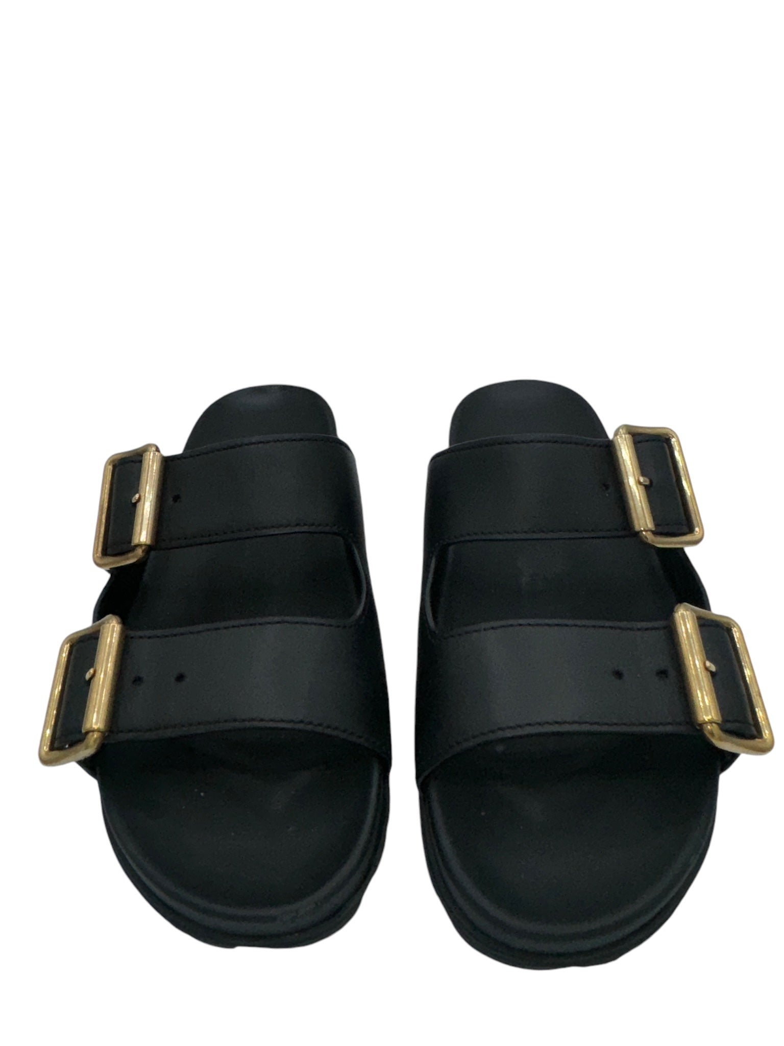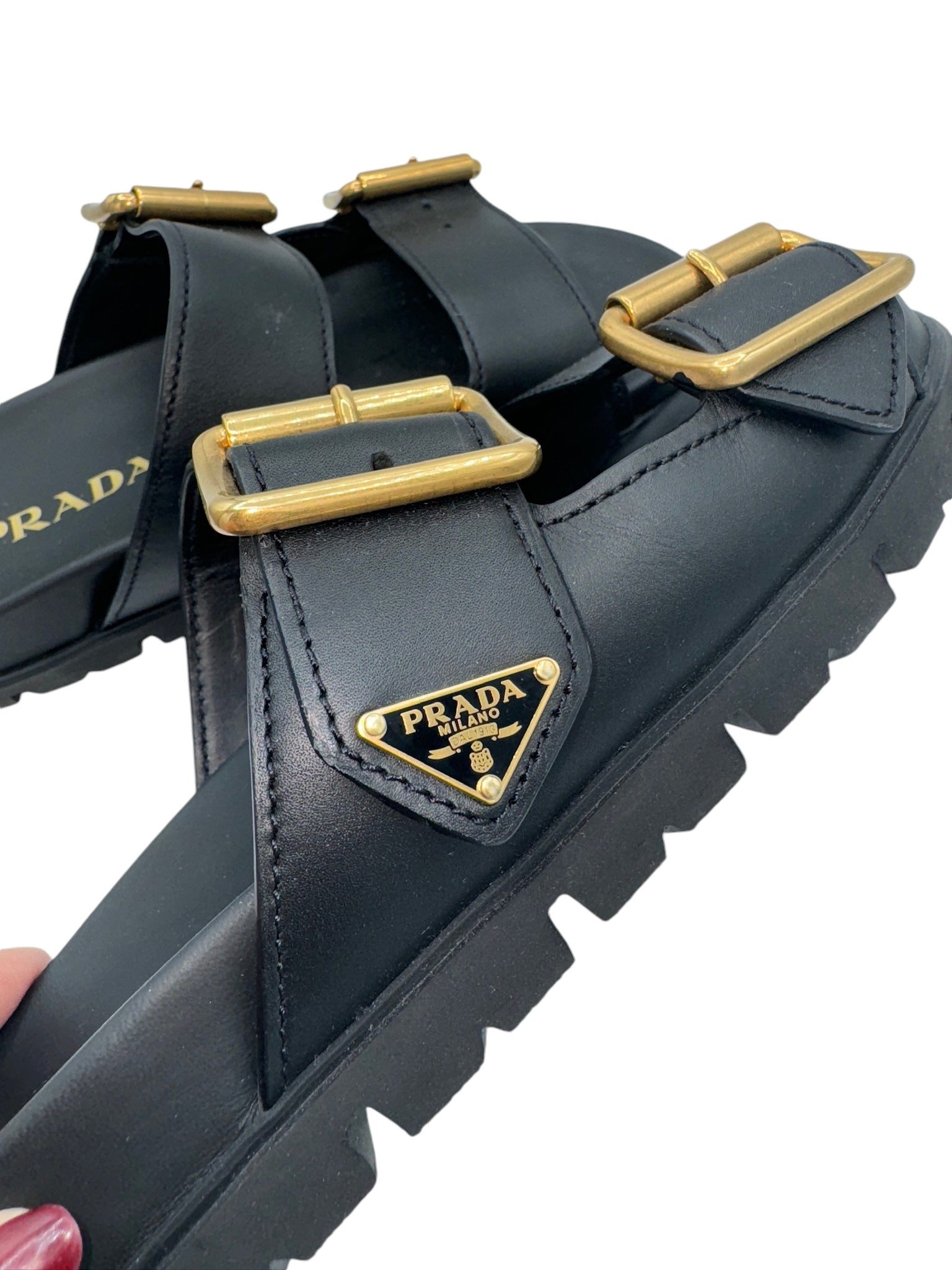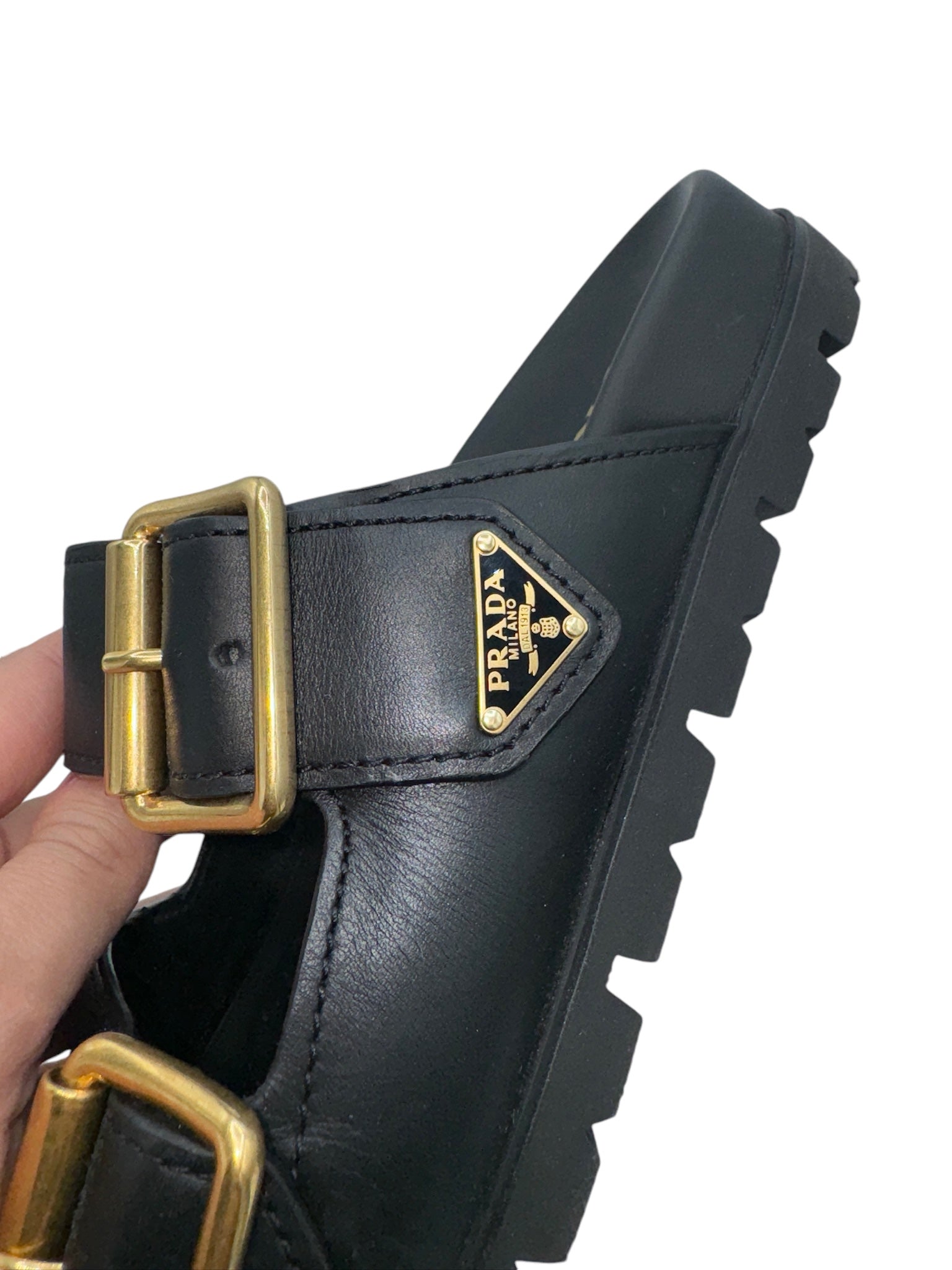 Realza tu estilo con estas sandalias PRADA de segunda mano en piel negra. En buen estado y con su caja original. Fabricadas con materiales de calidad, el exterior puede mostrar un ligero desgaste, pero aún así mantiene su forma. Perfectas para una talla 37 (EE. UU. 6.5) y listas para usar en cualquier ocasión.