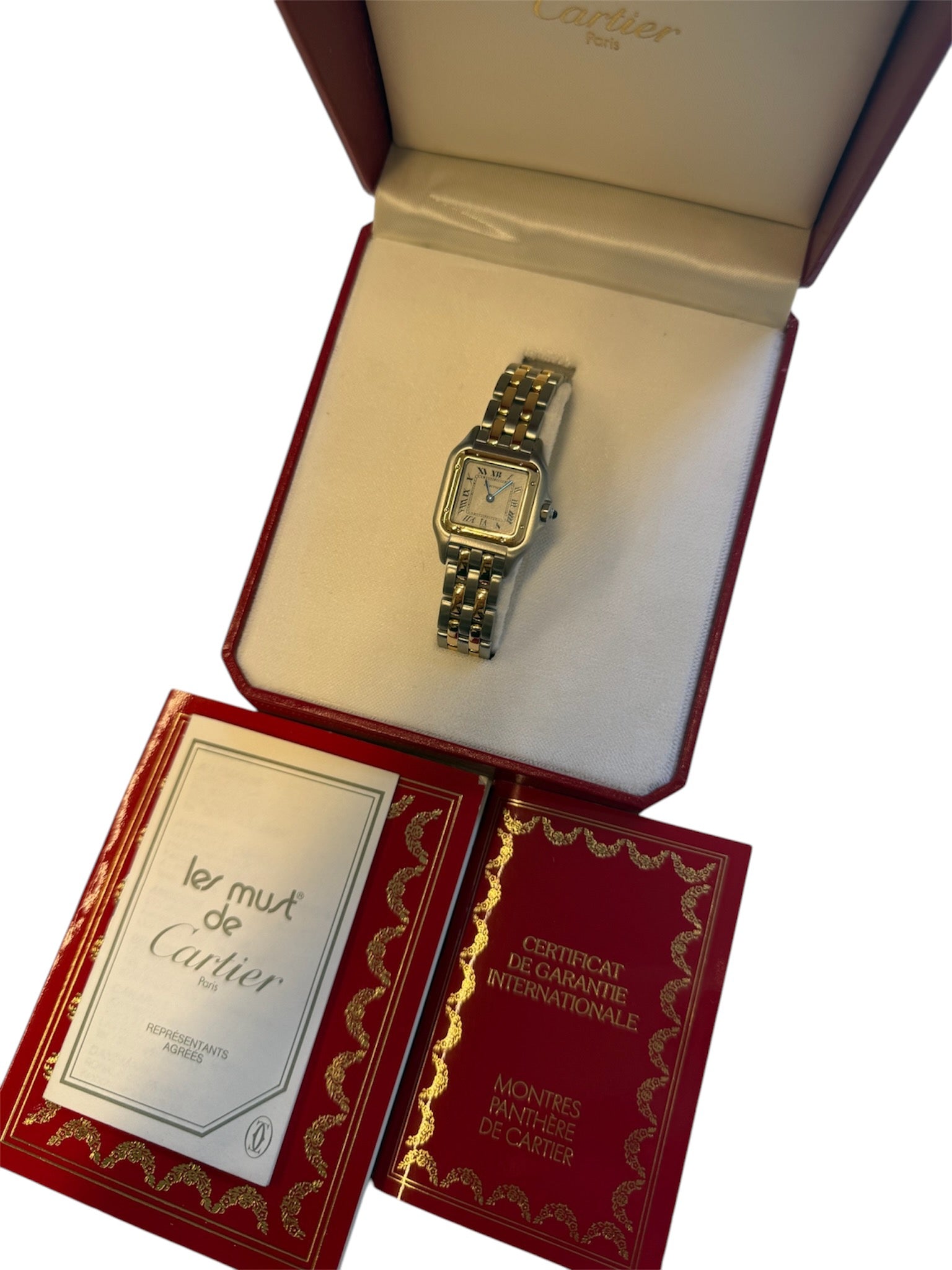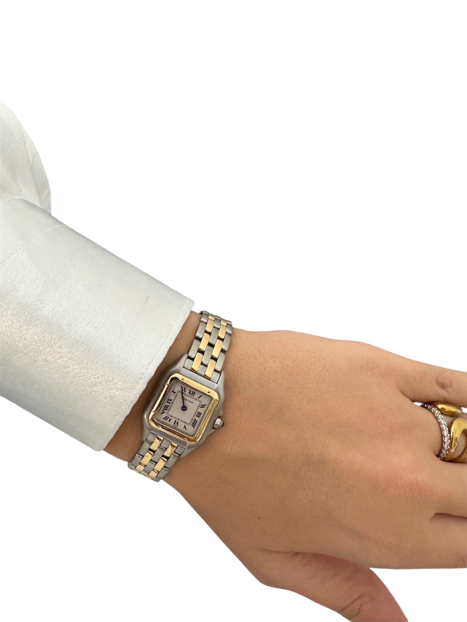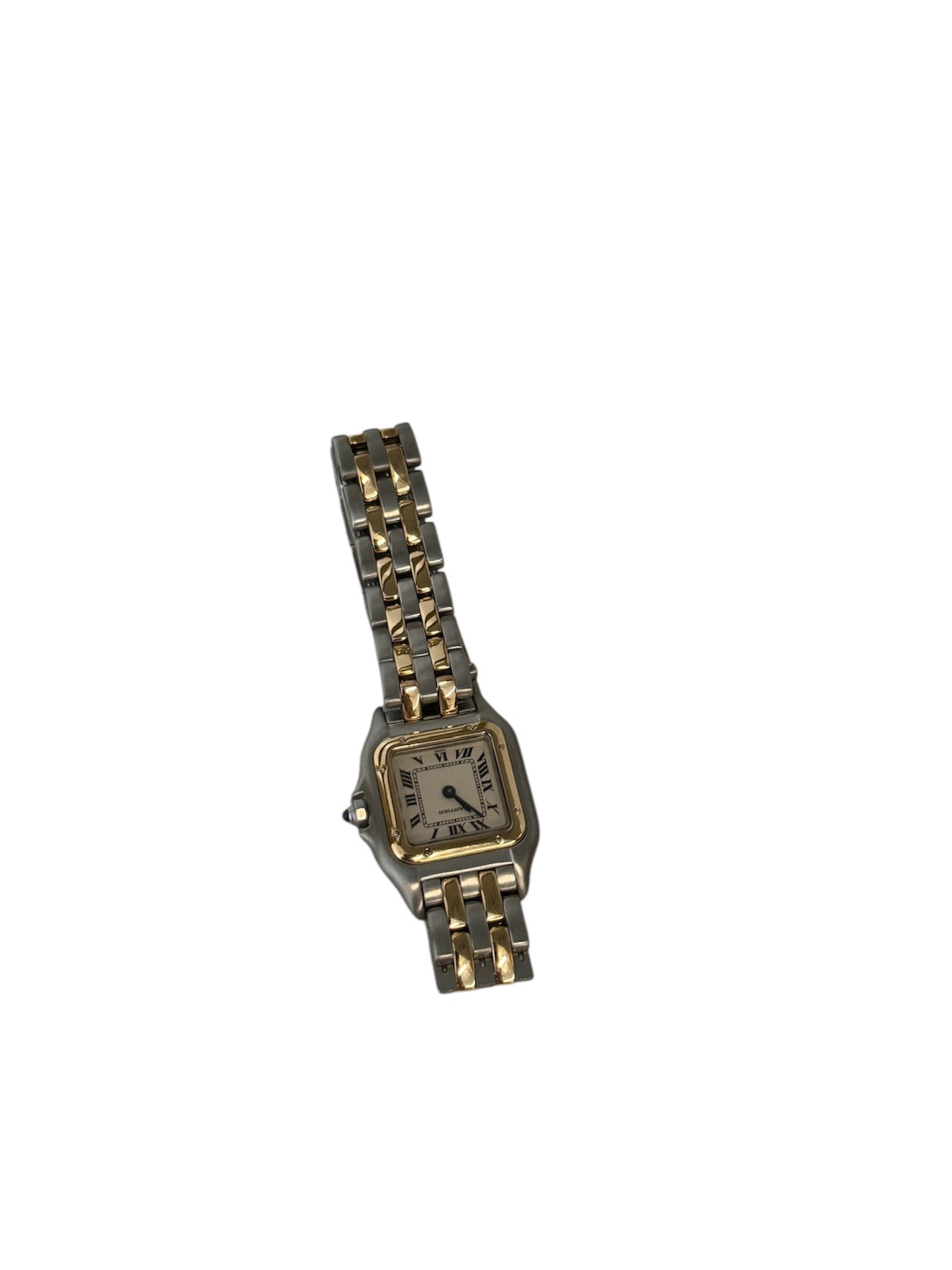 Realza tu estilo con este reloj de cuarzo Panthere de Cartier en acero inoxidable y oro amarillo de 18 quilates usado. En excelentes condiciones, este reloj irradia sofisticación y lujo. Mantiene la hora con precisión gracias a su movimiento de cuarzo y marca la diferencia con su diseño en acero inoxidable y oro amarillo de 18 quilates. No dejes pasar esta oportunidad de añadir un toque de elegancia a tu guardarropa.