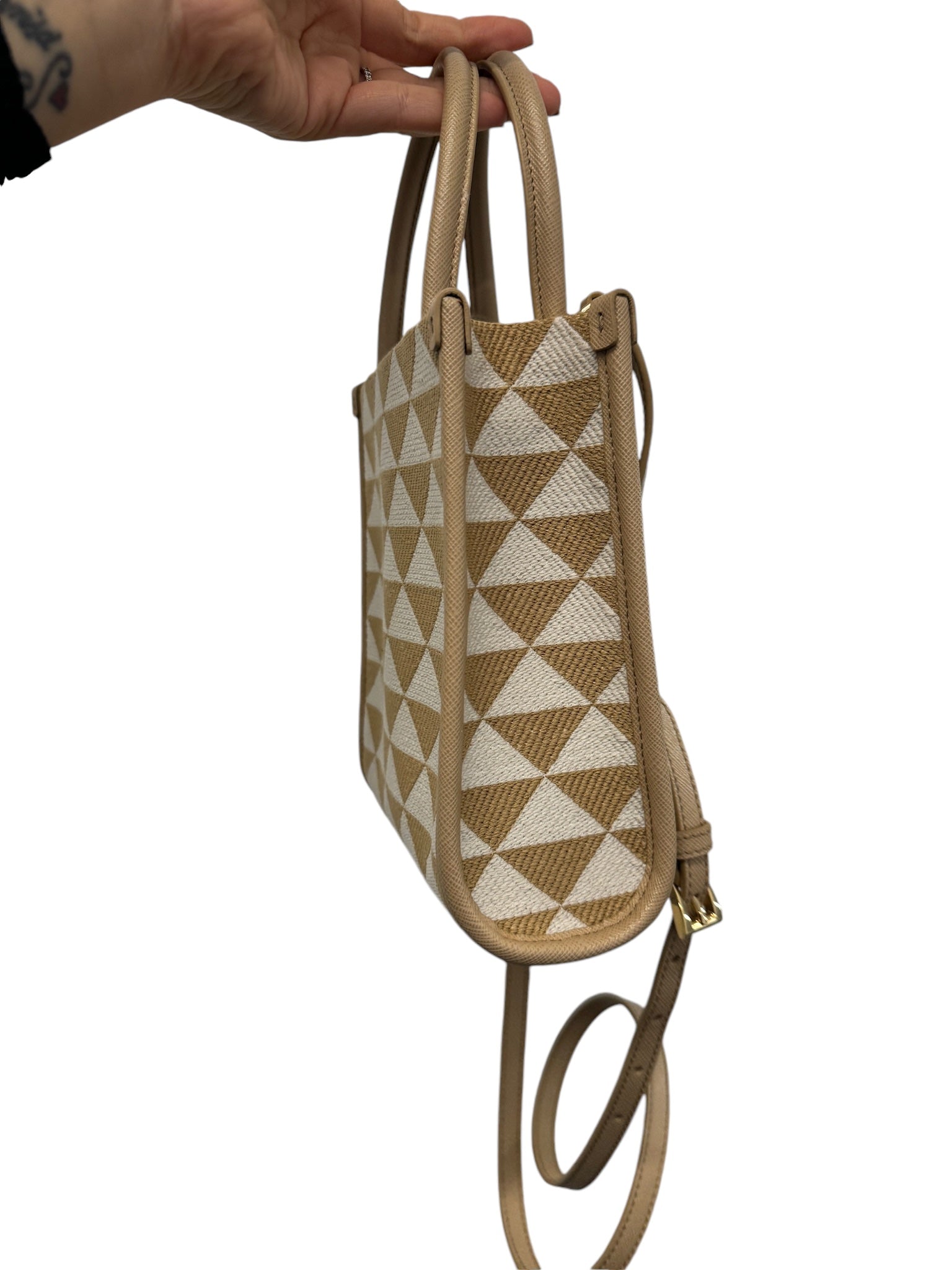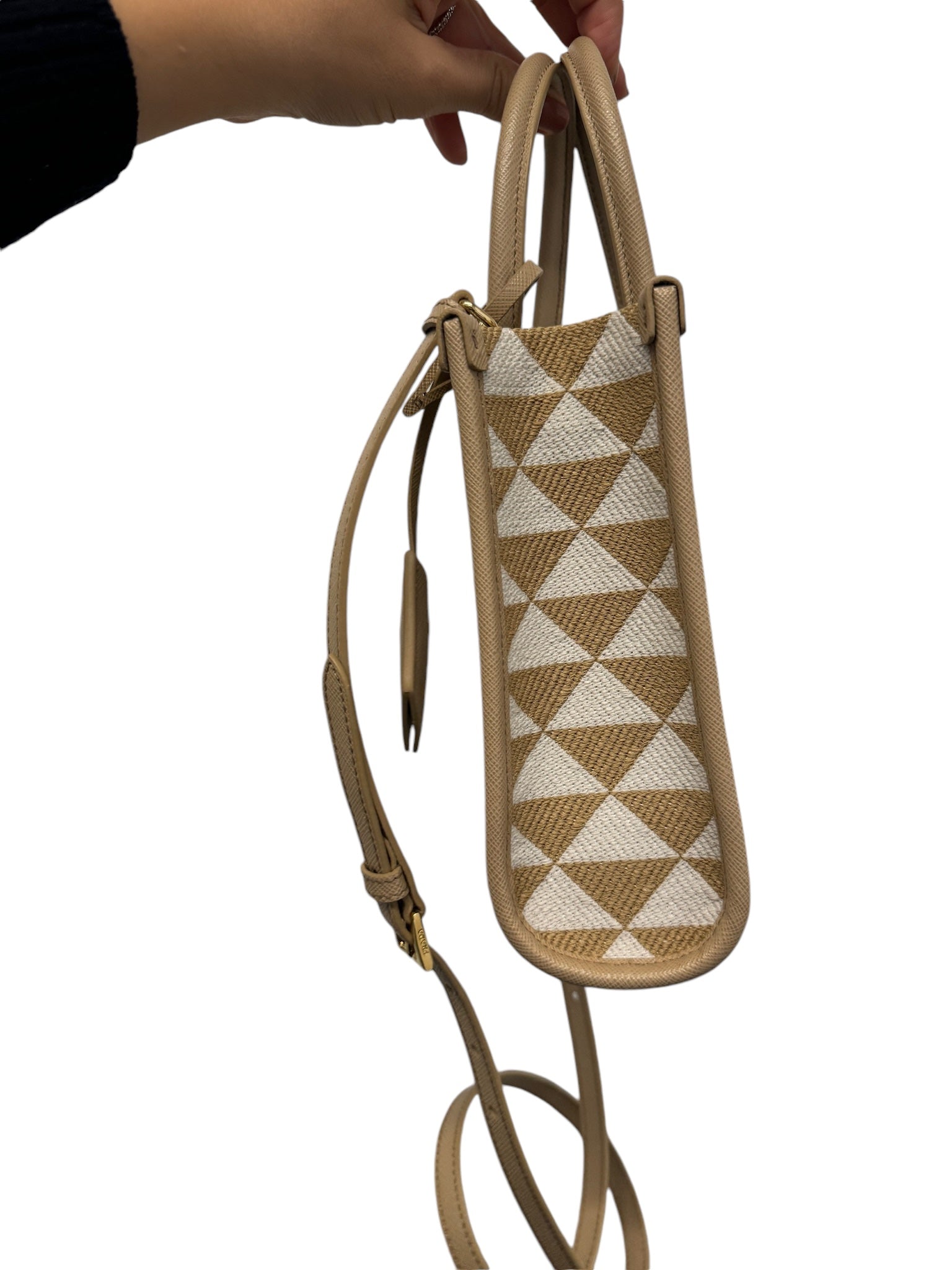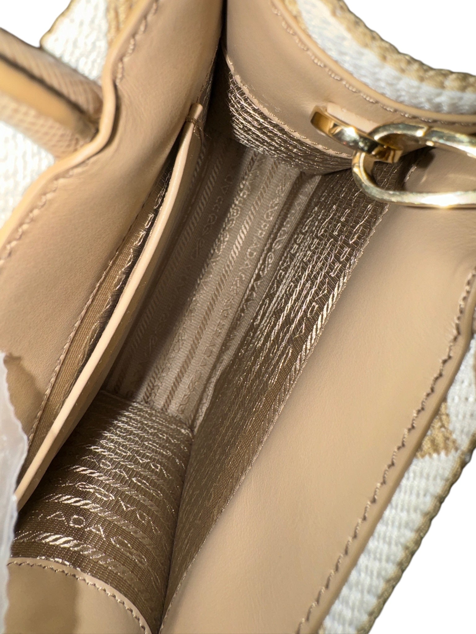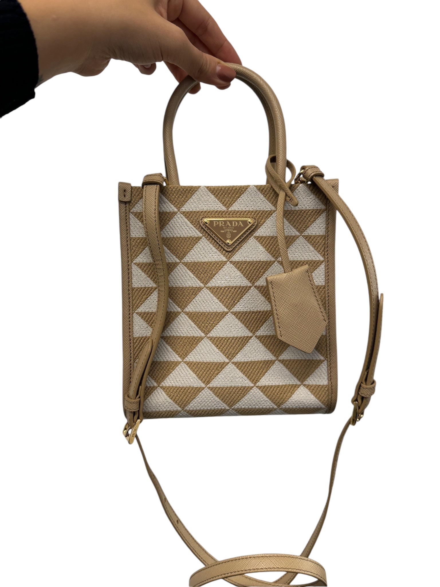 Este bolso bandolera mini PRADA Symbole Shopper Tote Jacquard es un accesorio elegante y versátil, perfecto para el uso diario.