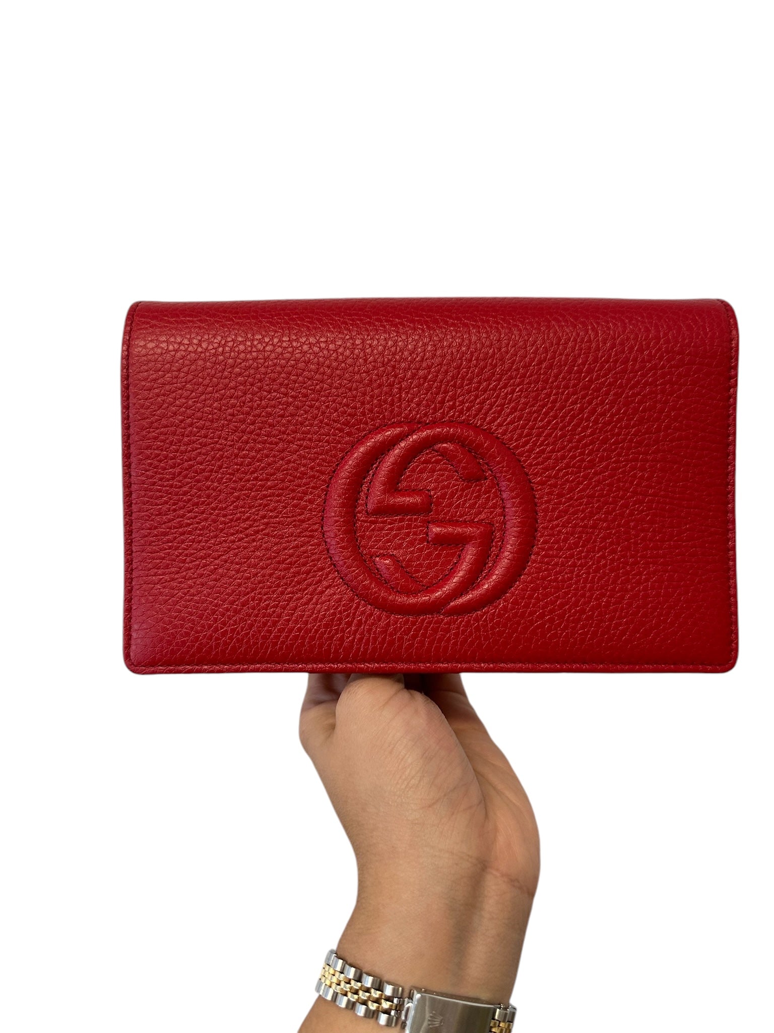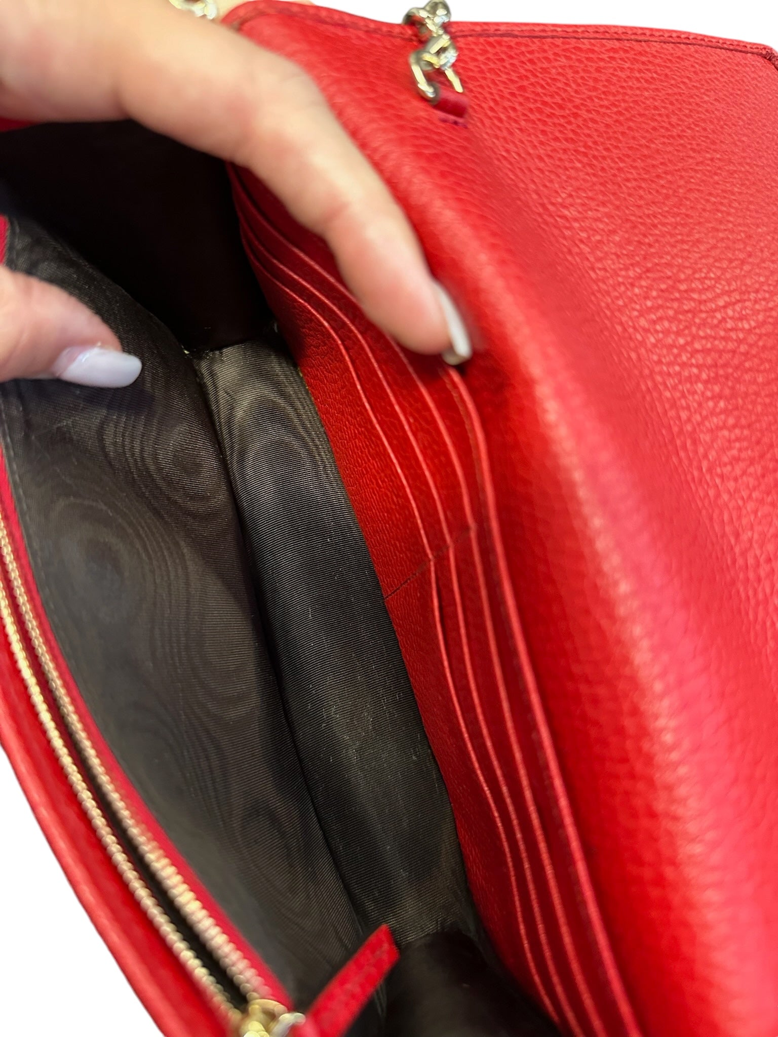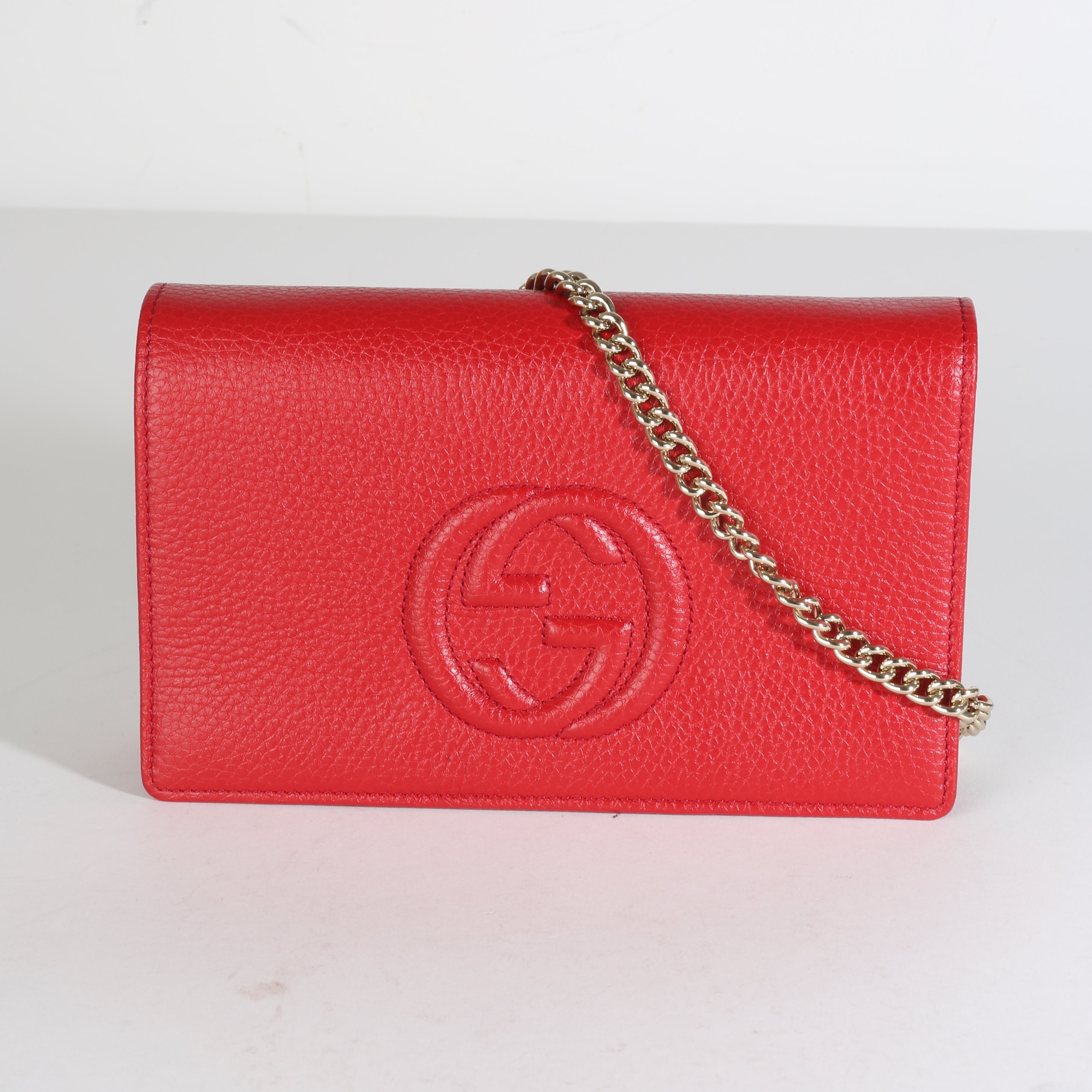 Esta exquisita cartera con cadena GUCCI Soho de piel de becerro granulada de color rojo intenso es un artículo imprescindible para cualquier entusiasta de la moda. Tiene un tamaño compacto, perfecto para el uso diario y está en excelentes condiciones, lo que la convierte en una valiosa incorporación a su colección. La cartera también viene con una caja, un folleto de cuidados y correas extraíbles para una mayor funcionalidad. Fabricada en Italia con la mejor artesanía, la cartera tiene unas dimensiones de 8 x 5 x 1,25 y está elaborada con piel de lujo. No pierda la oportunidad de poseer esta pieza atemporal.