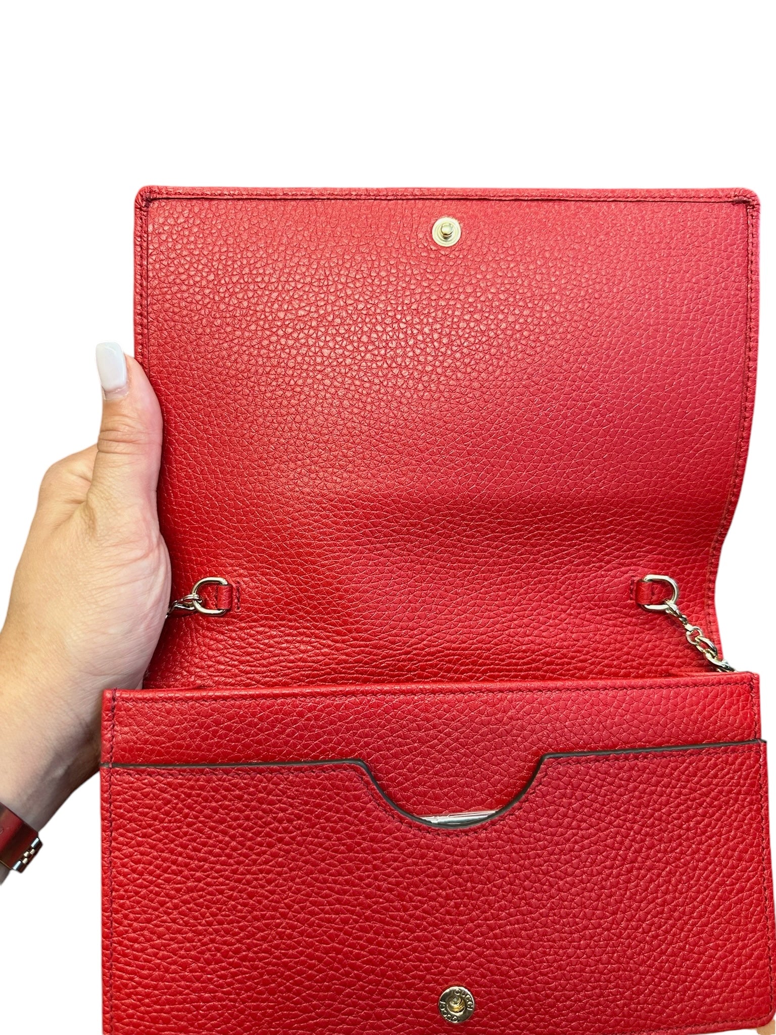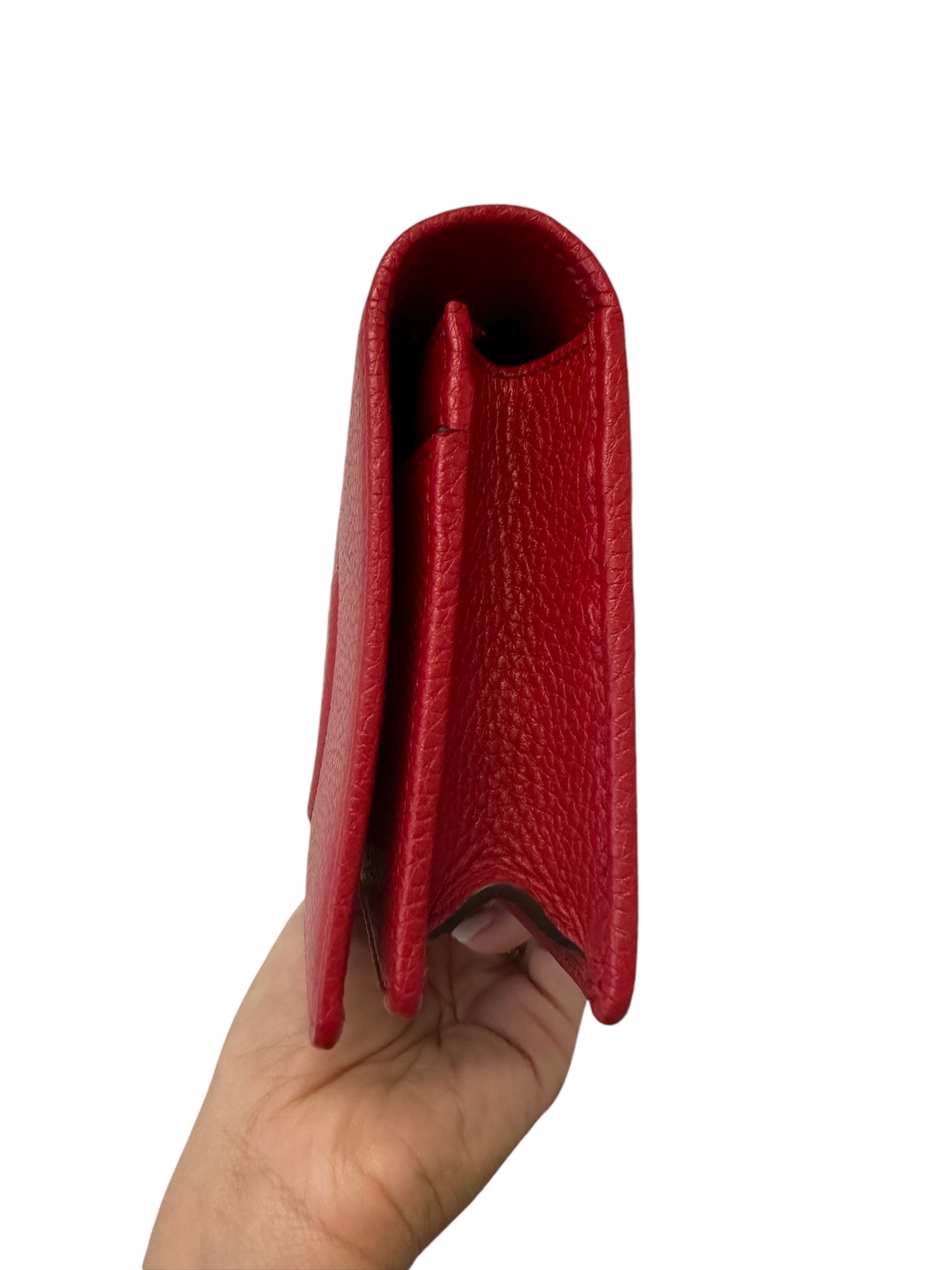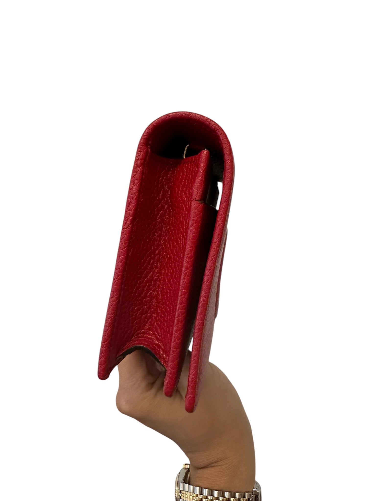 Esta exquisita cartera con cadena GUCCI Soho de piel de becerro granulada de color rojo intenso es un artículo imprescindible para cualquier entusiasta de la moda. Tiene un tamaño compacto, perfecto para el uso diario y está en excelentes condiciones, lo que la convierte en una valiosa incorporación a su colección. La cartera también viene con una caja, un folleto de cuidados y correas extraíbles para una mayor funcionalidad. Fabricada en Italia con la mejor artesanía, la cartera tiene unas dimensiones de 8 x 5 x 1,25 y está elaborada con piel de lujo. No pierda la oportunidad de poseer esta pieza atemporal.