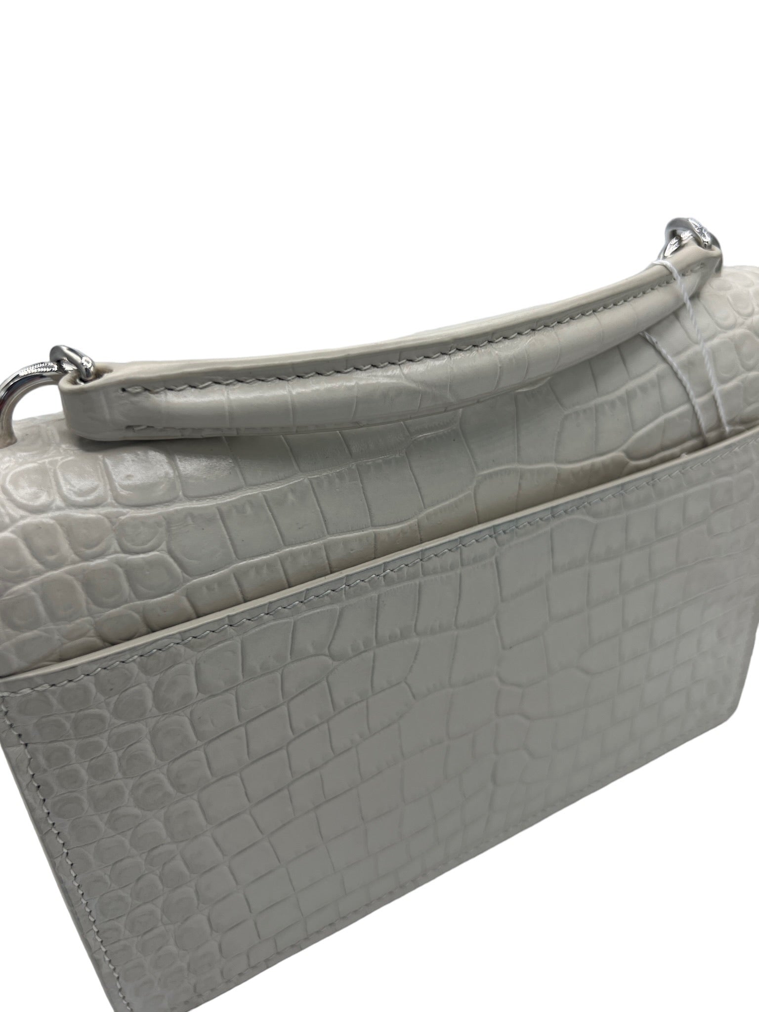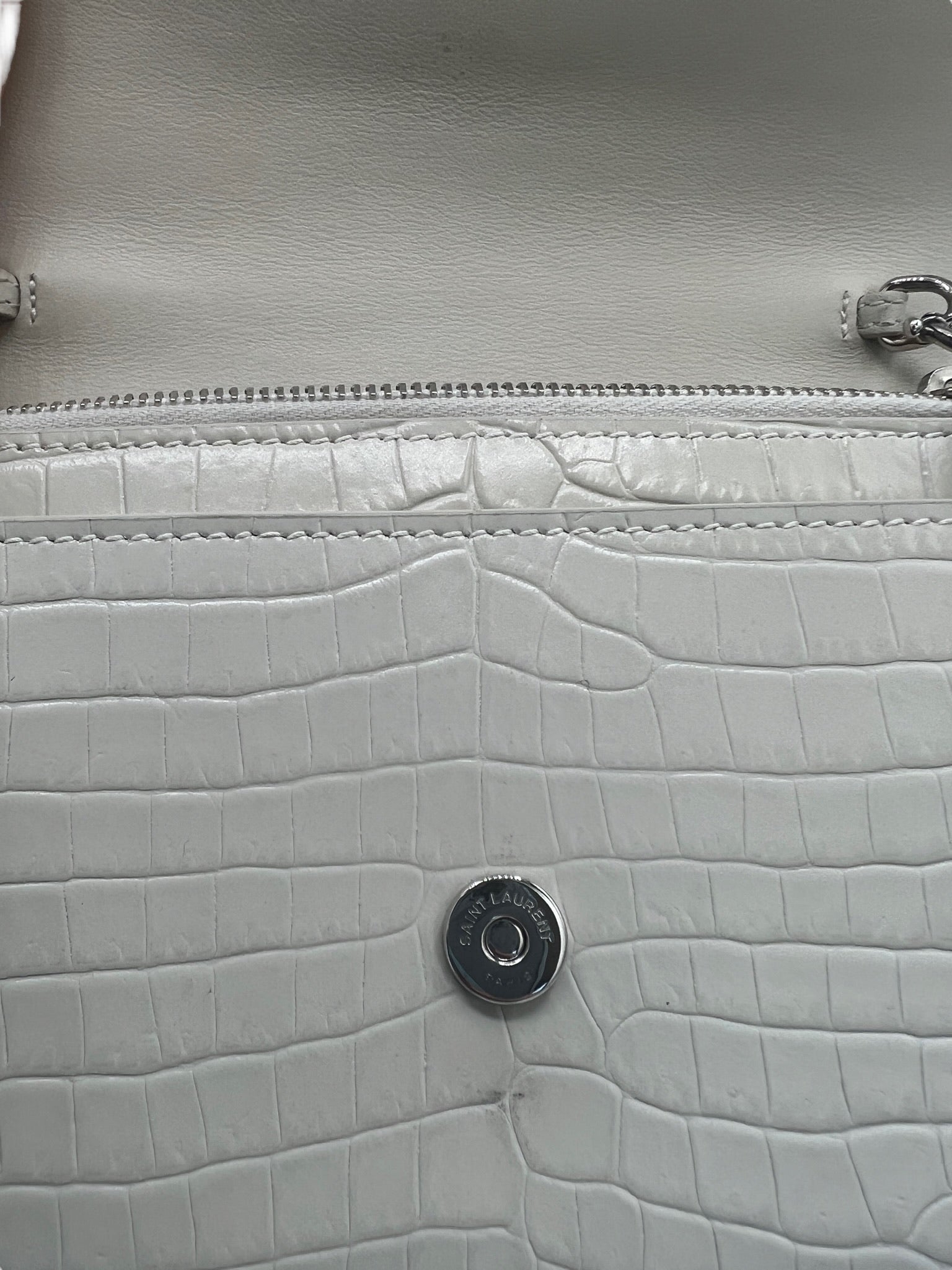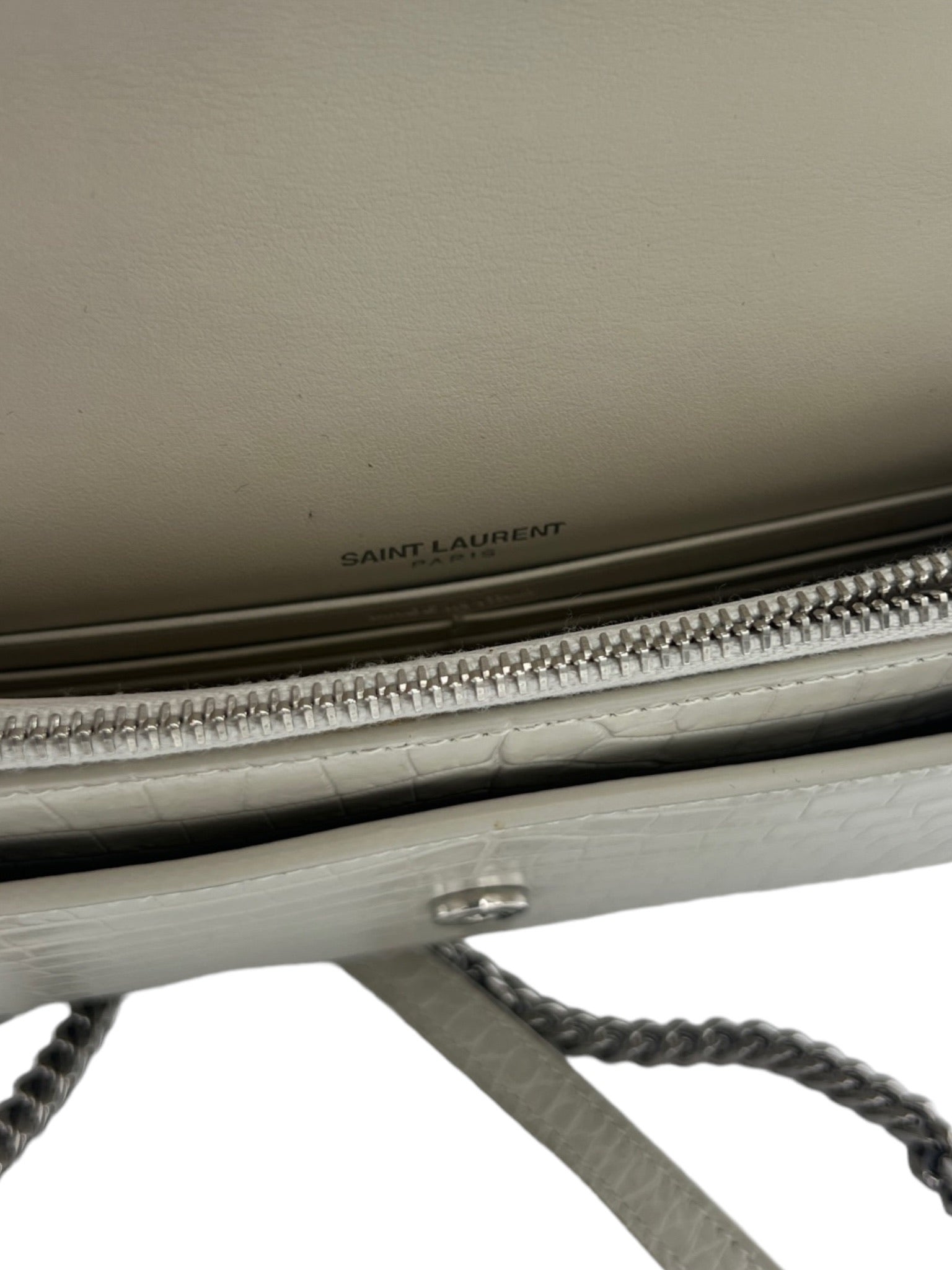 Este bolso de piel de becerro con relieve de cocodrilo Blanc Vintage de SAINT LAURENT de segunda mano es un bolso bandolera impresionante que hará que cualquier atuendo destaque. El color blanco del bolso y el diseño con relieve de cocodrilo le dan un aspecto lujoso y elegante que llamará la atención.