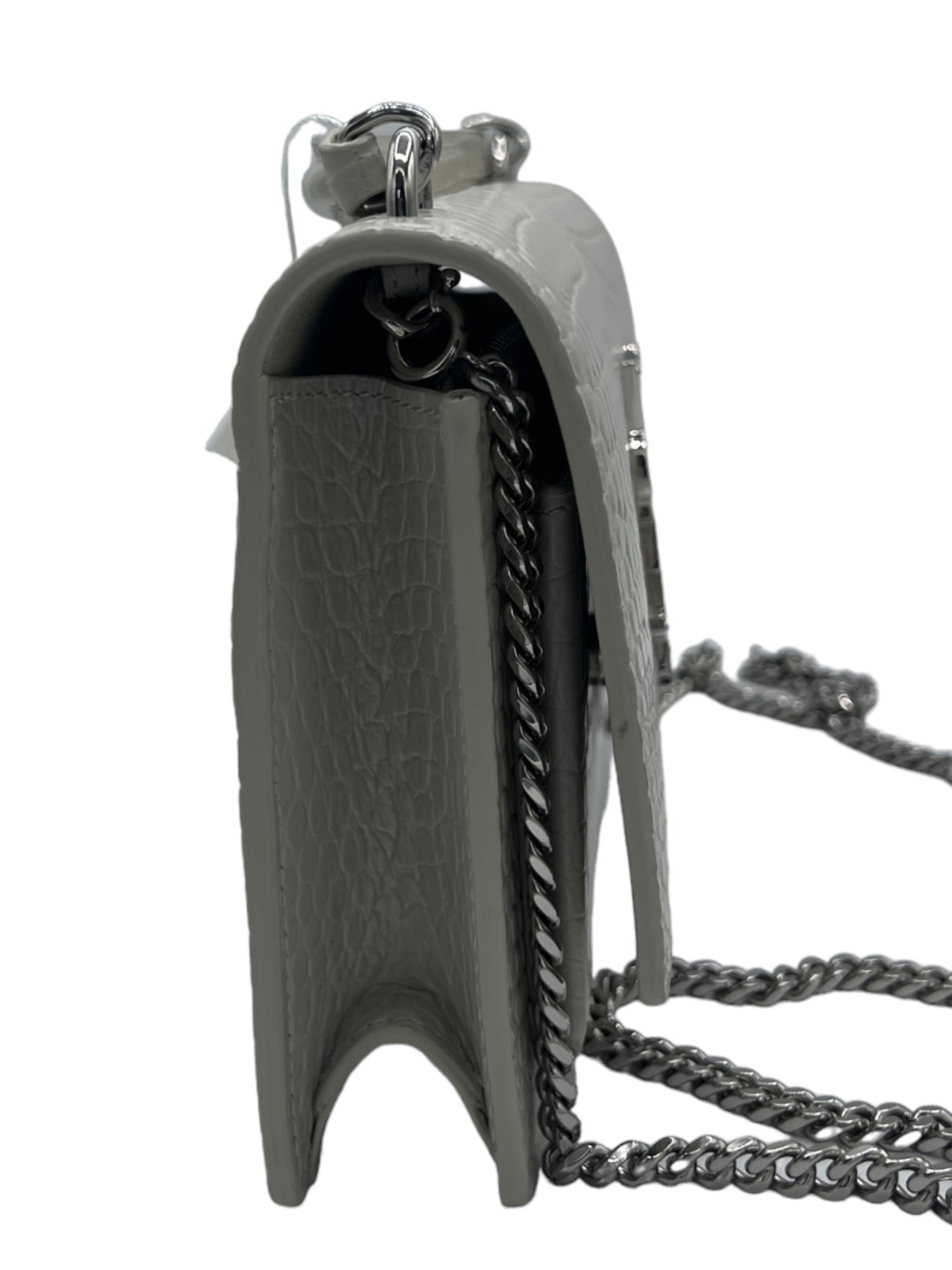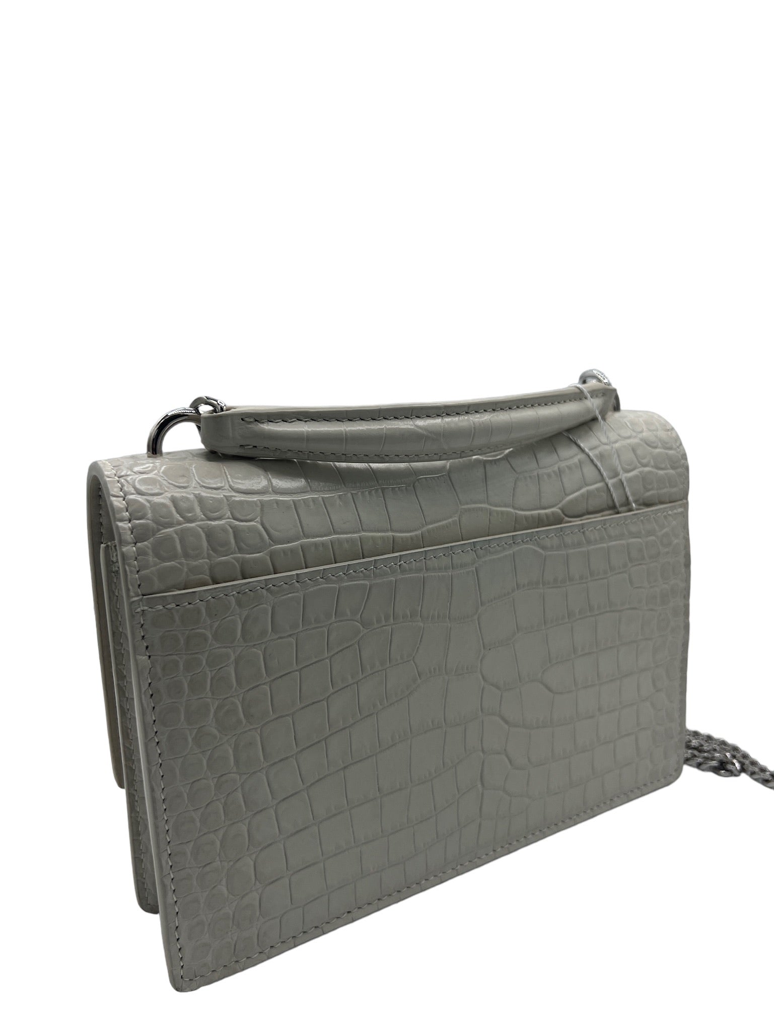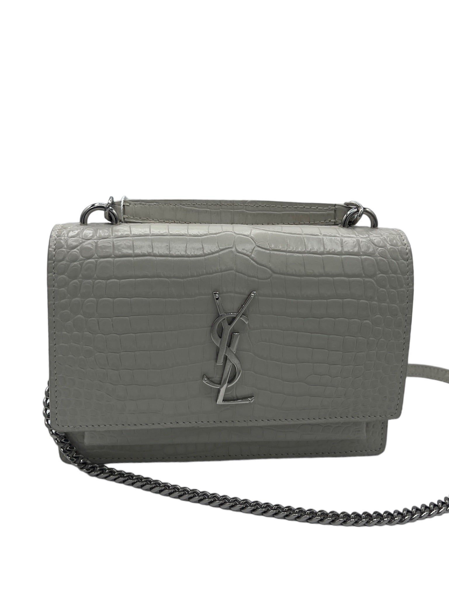 Este bolso de piel de becerro con relieve de cocodrilo Blanc Vintage de SAINT LAURENT de segunda mano es un bolso bandolera impresionante que hará que cualquier atuendo destaque. El color blanco del bolso y el diseño con relieve de cocodrilo le dan un aspecto lujoso y elegante que llamará la atención.
