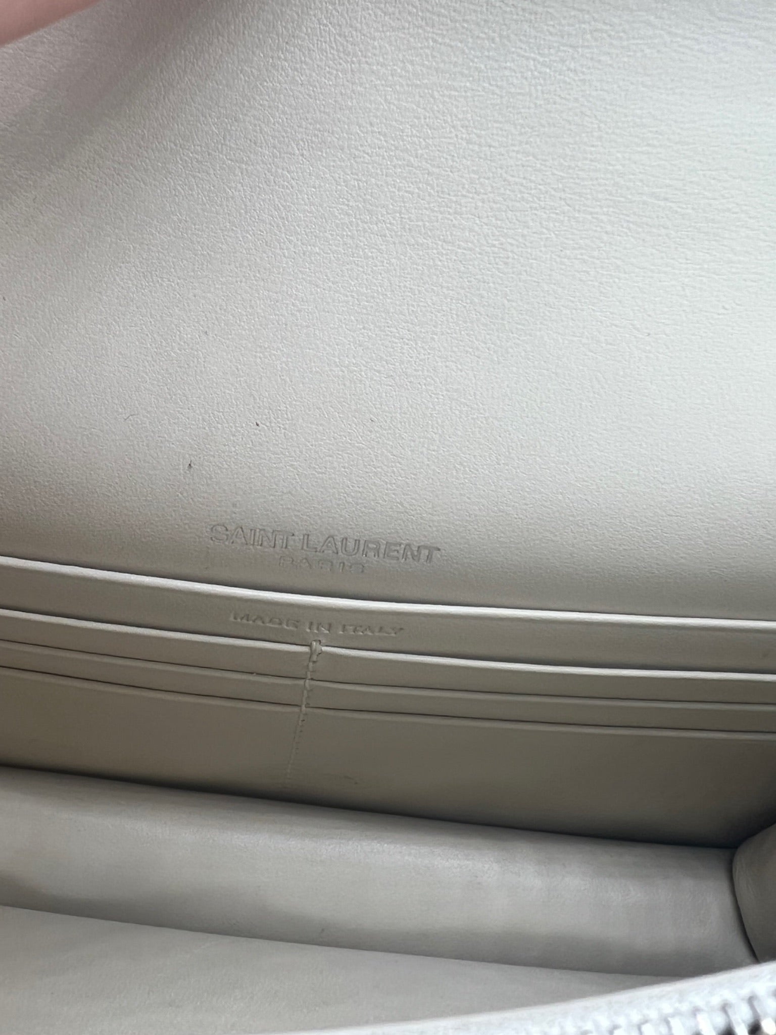 - Descripción y tipo de estado: El bolso de piel de becerro con relieve de cocodrilo Blanc Vintage de SAINT LAURENT de tamaño mediano es "Excelente", lo que significa que se ha usado pero muestra signos muy leves de desgaste. Viene con funda guardapolvo