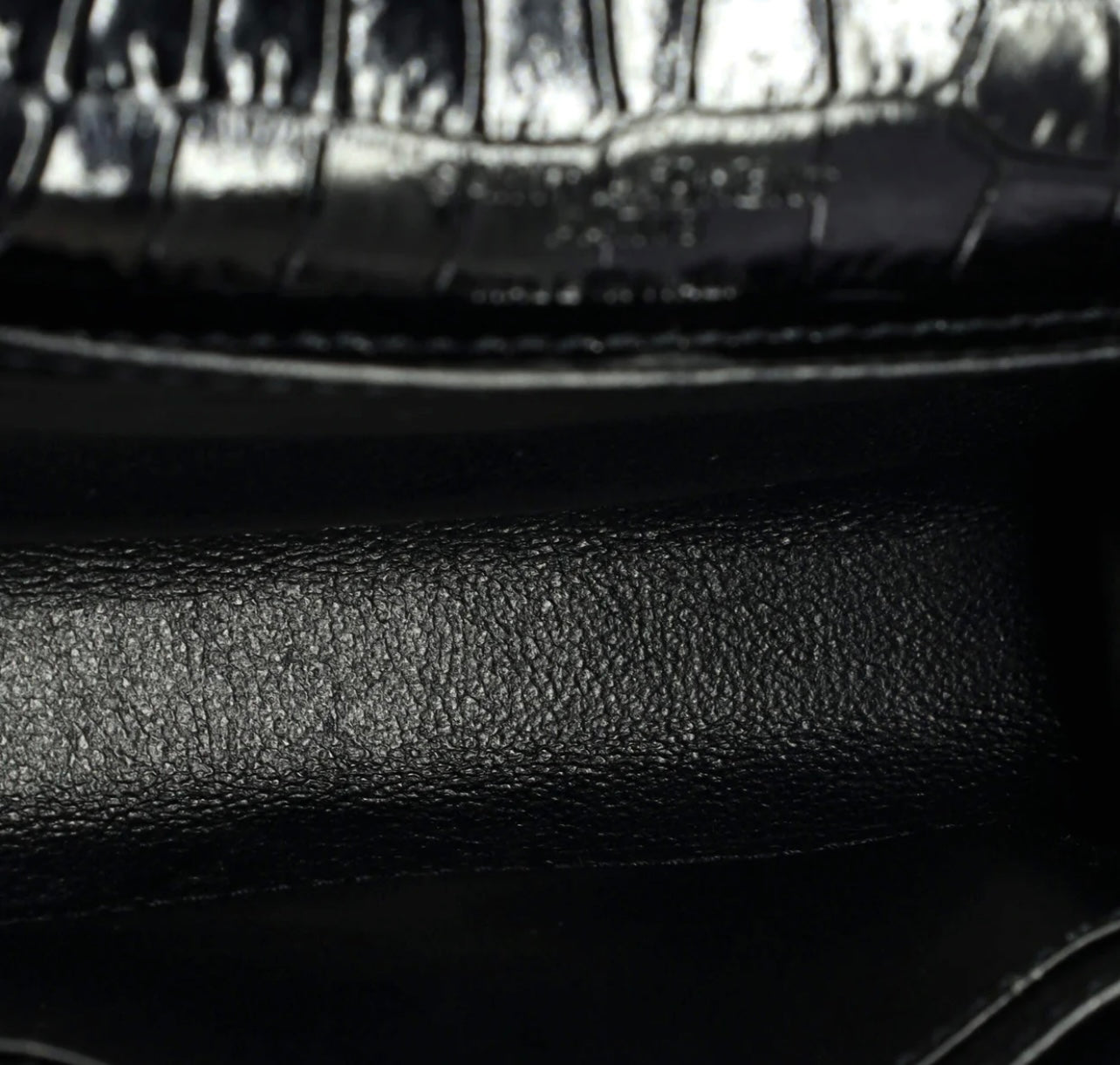 El bolso con cinturón Kate Classic Monogram de SAINT LAURENT, elaborado por expertos en piel de cocodrilo y adornado con herrajes dorados, irradia lujo y sofisticación. Con una correa arrugada y pequeñas grietas en los bordes encerados de la solapa, cada marca le aporta carácter a la pieza. El espacioso interior presenta un desgaste mínimo, lo que lo convierte en el accesorio perfecto para cualquier ocasión.