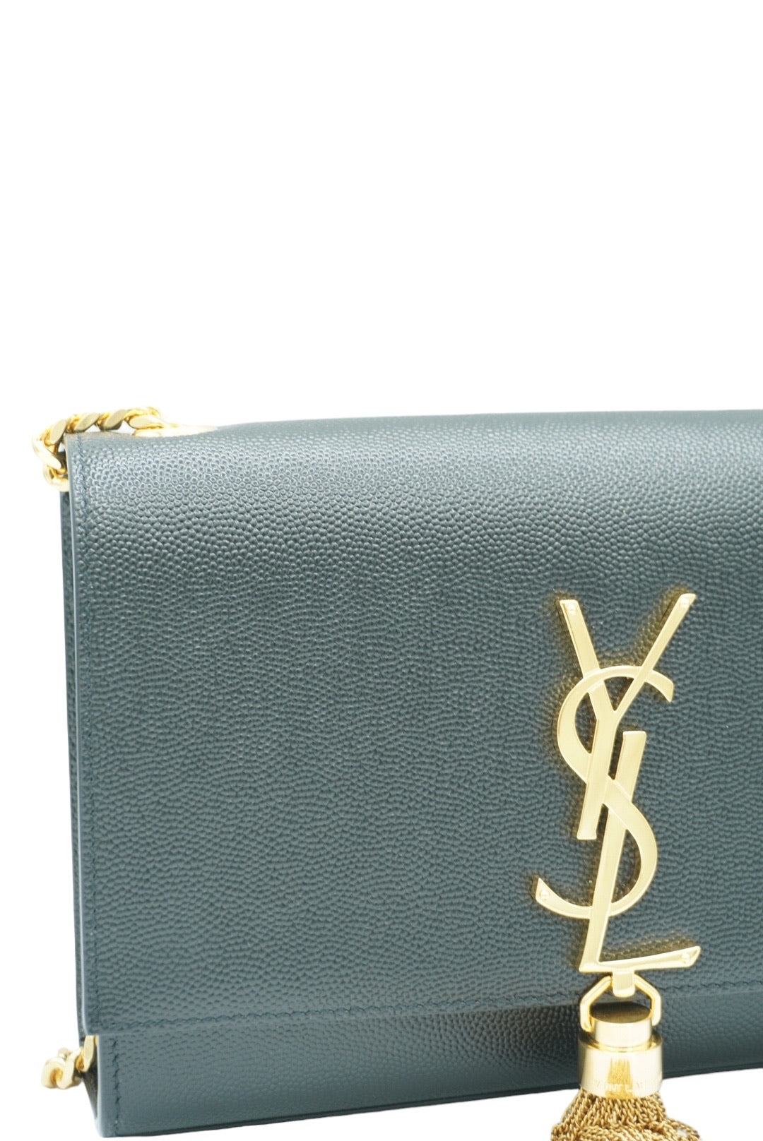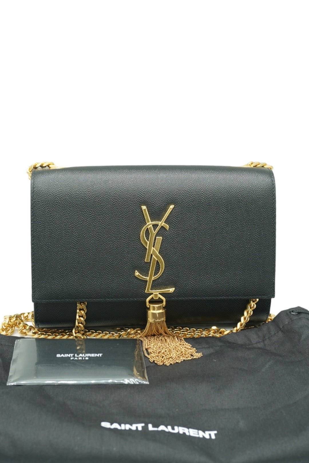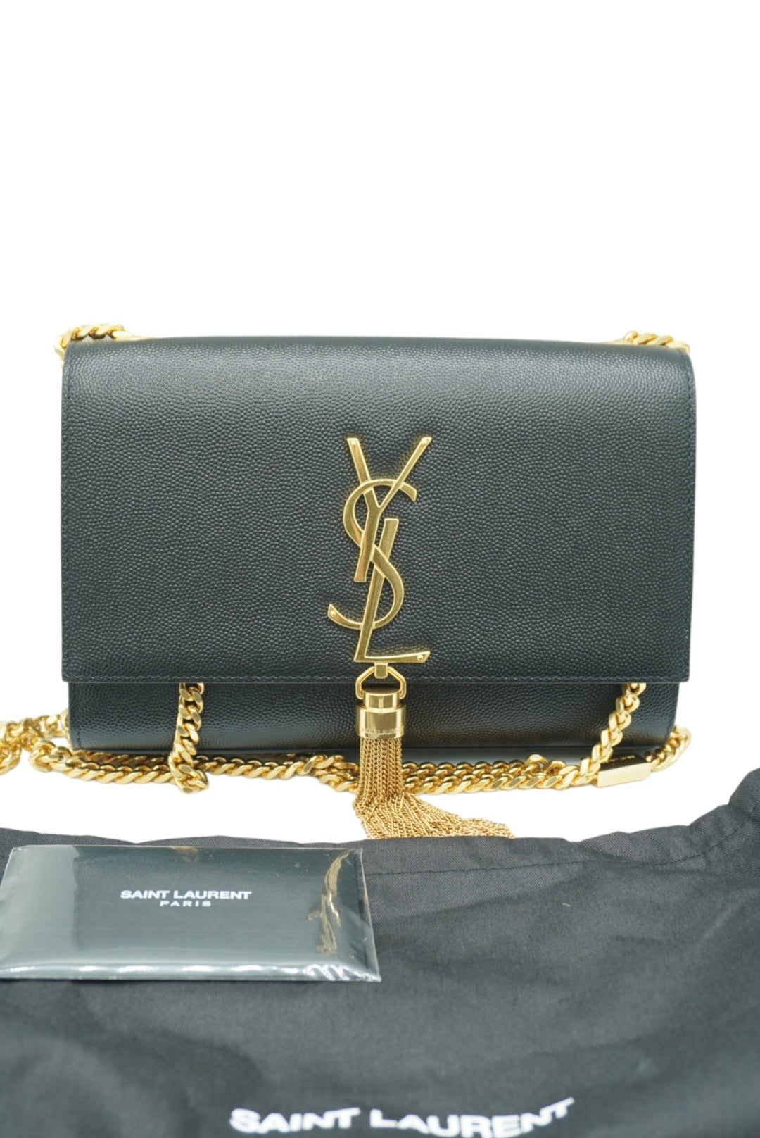 Disfrute de la lujosa artesanía italiana con este bolso de cadena Kate de Saint Laurent en color Nero. El exterior de tela con una rica textura se complementa con un forro de cuero, lo que eleva su calidad y durabilidad. Elegante y sin esfuerzo, la parte superior plegable cuenta con un cierre de botón magnético y se abre para revelar un compartimento principal con un solo bolsillo plano y 6 ranuras para tarjetas, así como un práctico compartimento con cremallera. Completo con herrajes YSL entrelazados y una borla de metal en la parte delantera, este bolso irradia sofisticación y clase. La correa de hombro de cadena de eslabones reforzada con cuero agrega versatilidad, lo que permite una opción de manos libres.