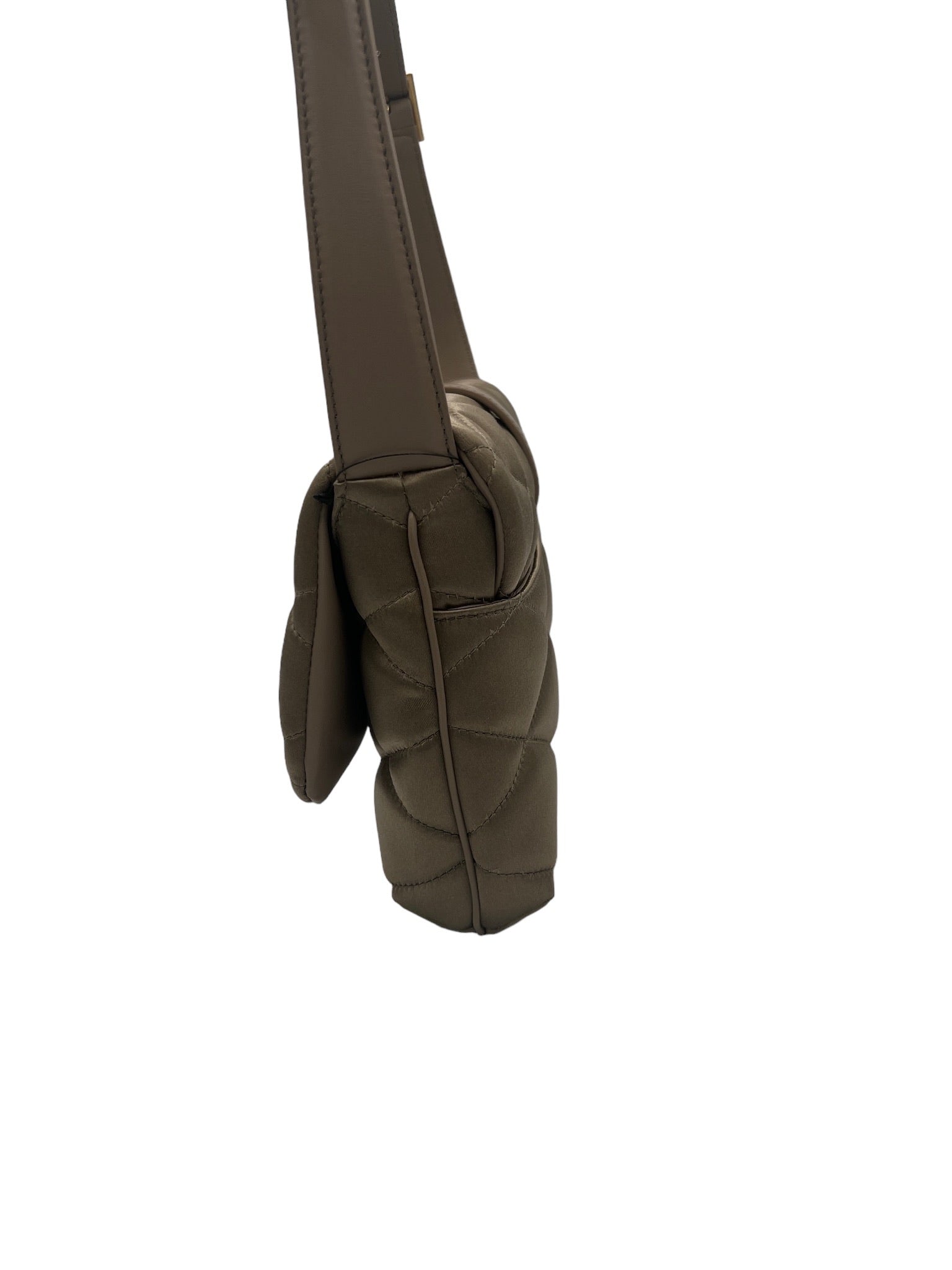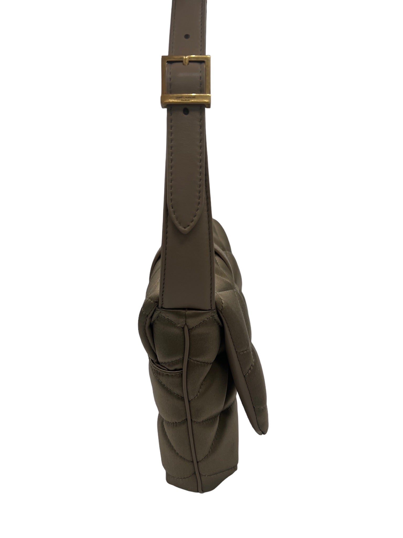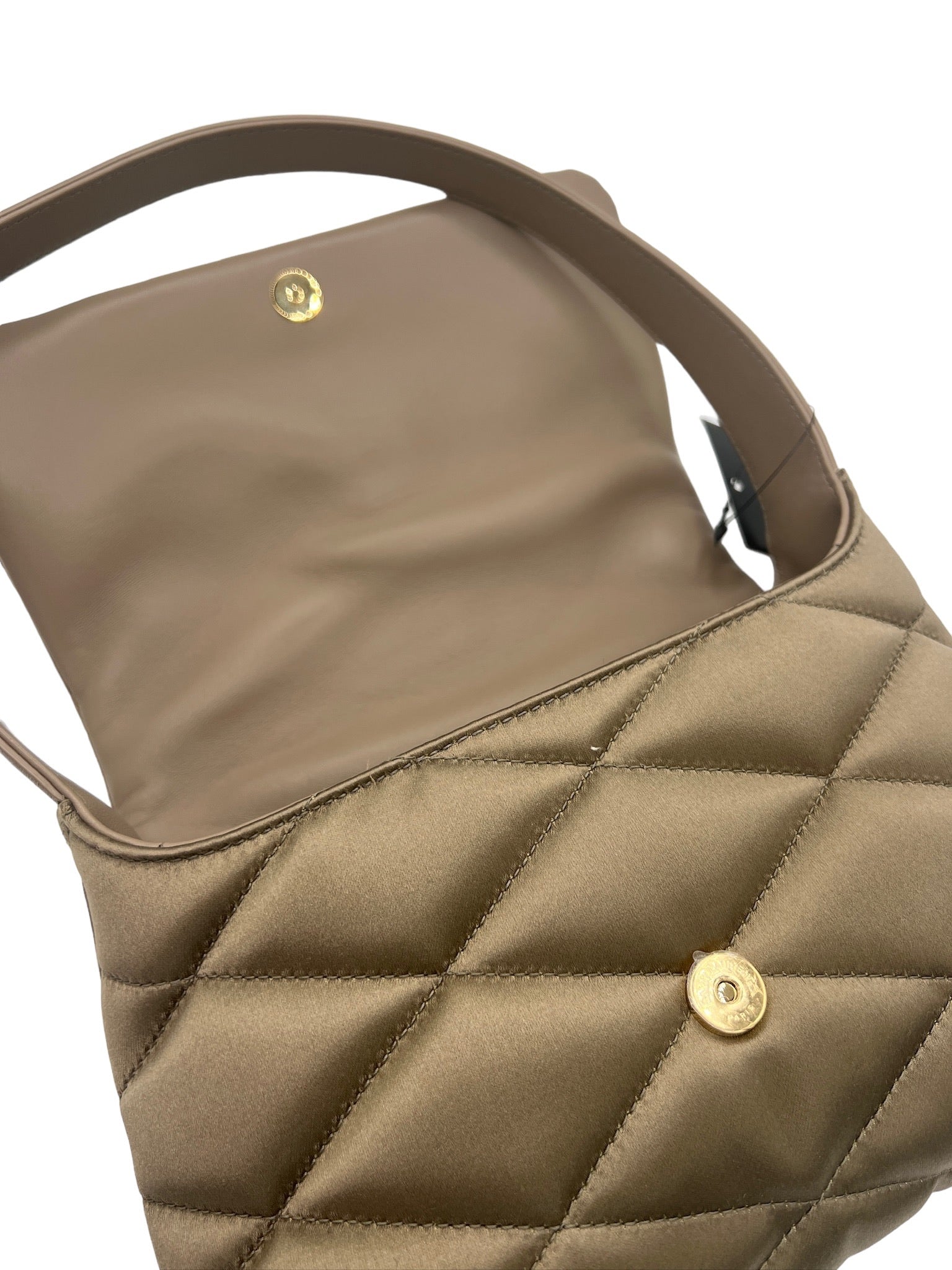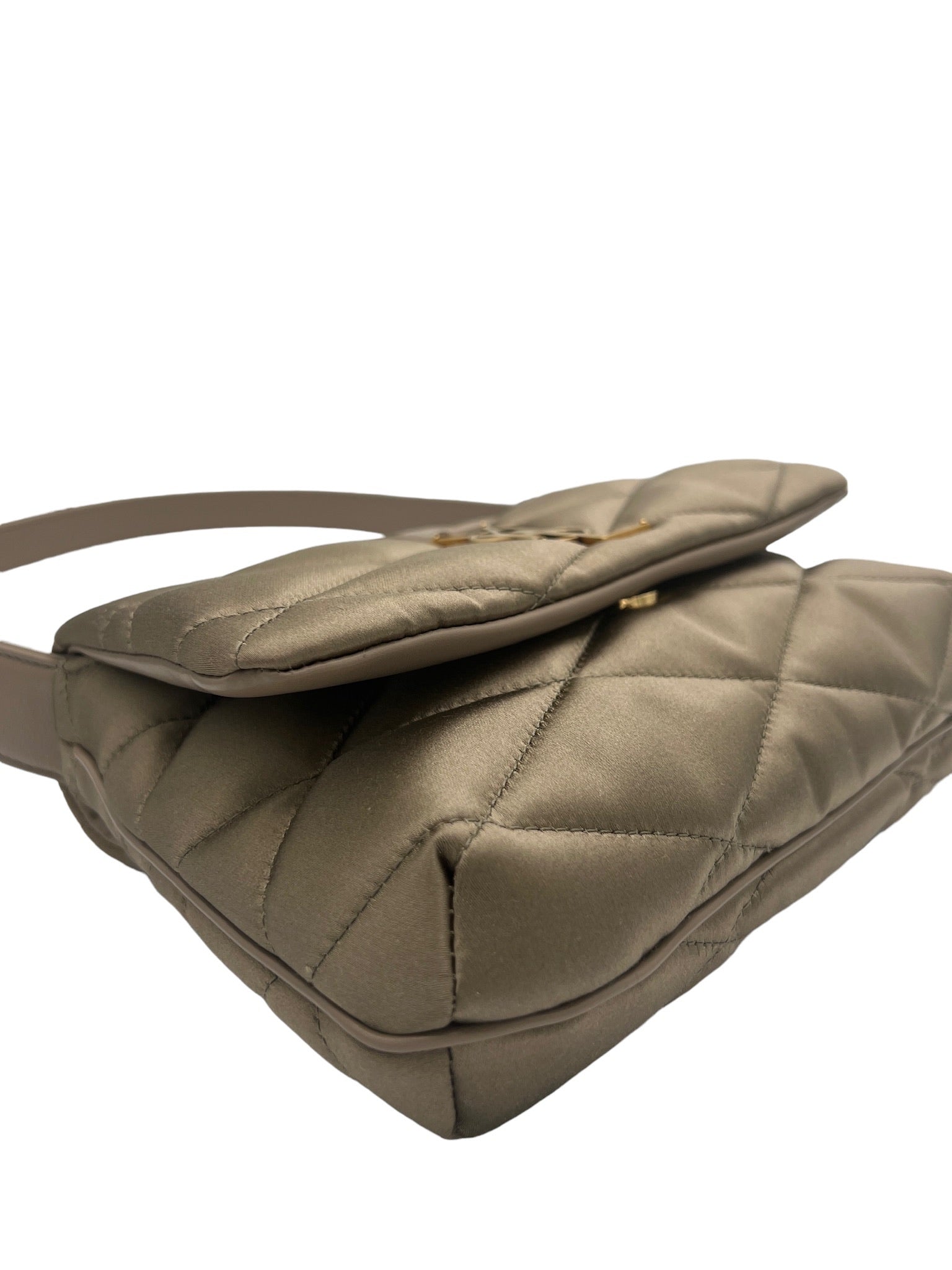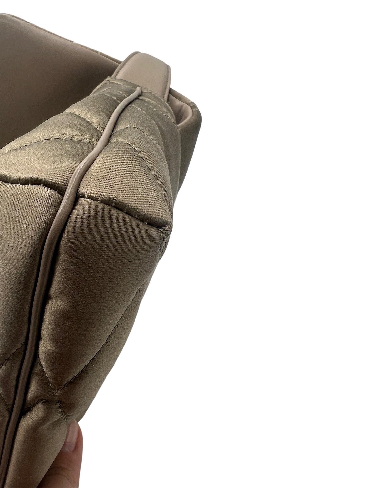 Fabricado en Italia, este elegante bolso de hombro presenta un satén acolchado con detalles de cuero y forrado con gamuza lujosa.