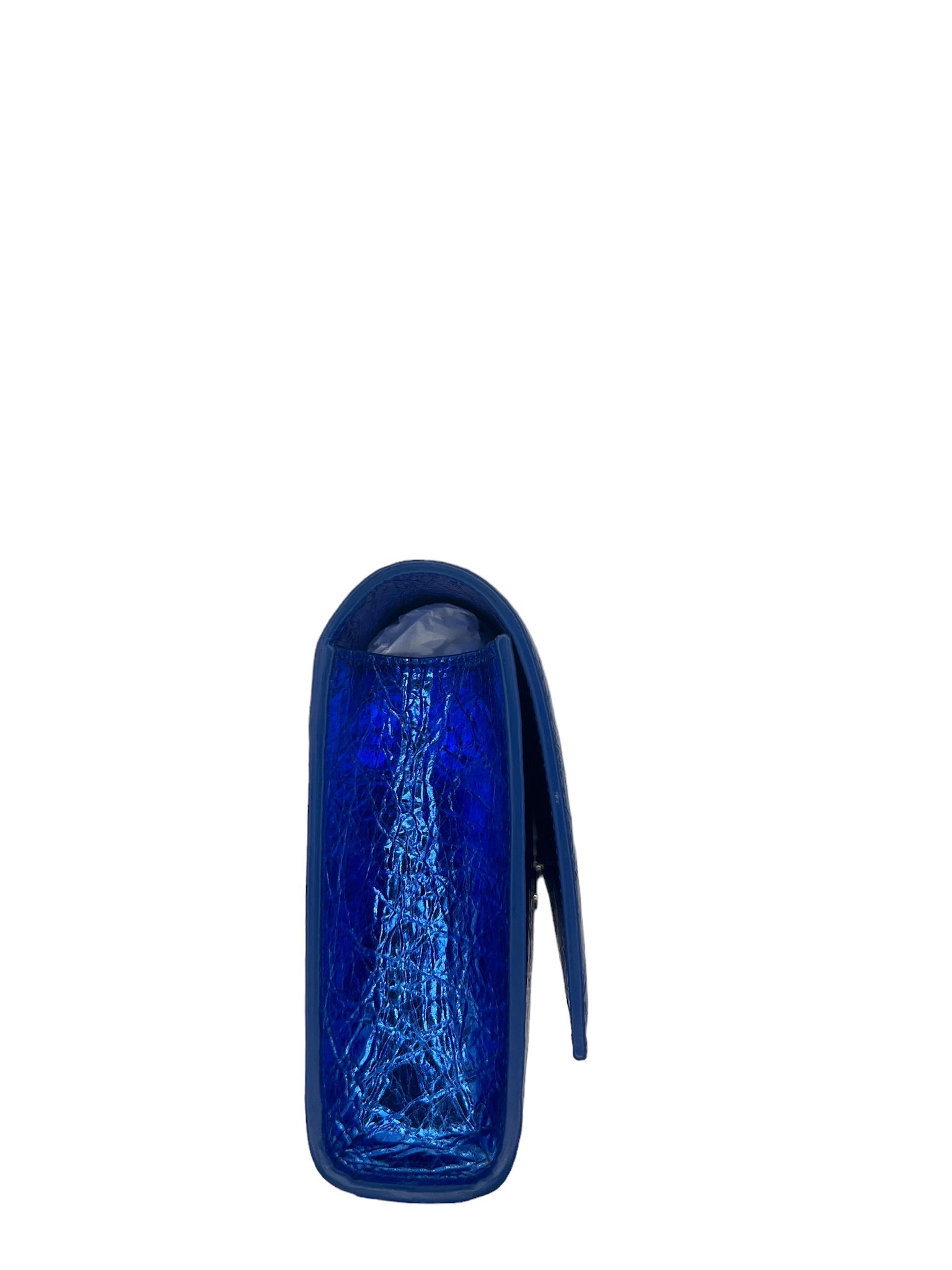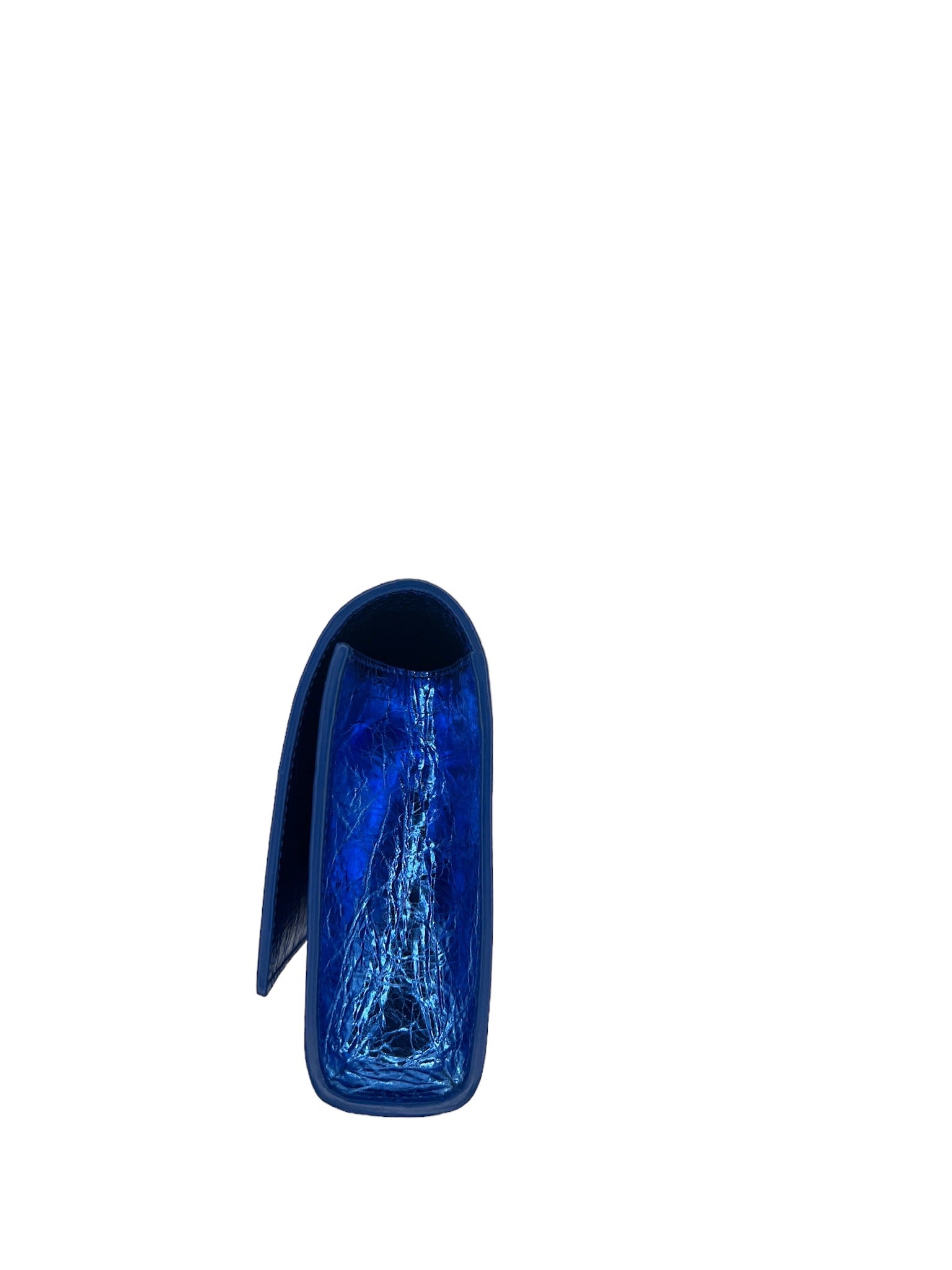 Este clutch azul metalizado de SAINT LAURENT usado es un bolso con asa superior que agregará un toque elegante a tu atuendo. Este bolso, elaborado con cuero de alta calidad, tiene un color azul impresionante y herrajes azules que lo hacen destacar.
