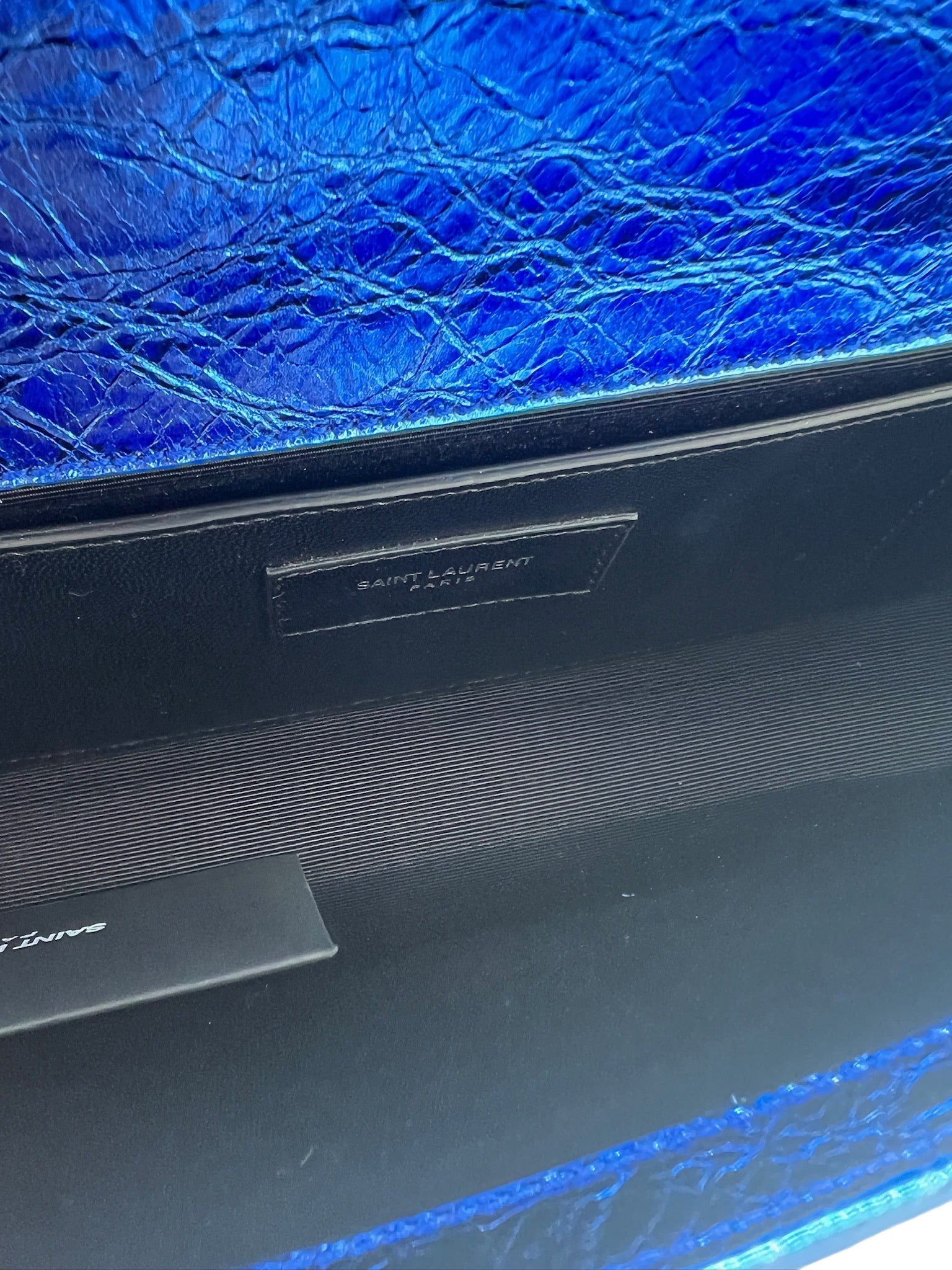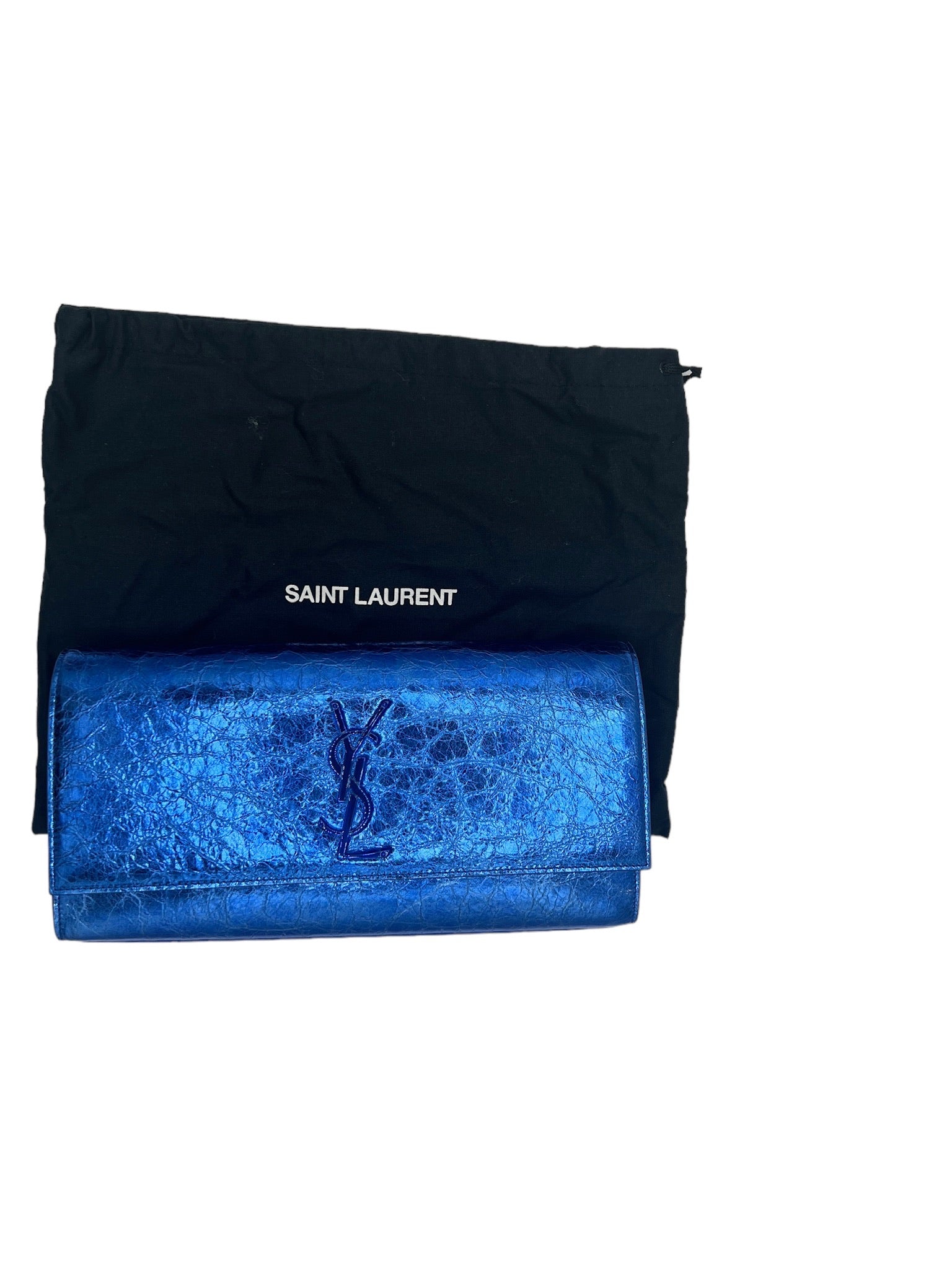 - Este clutch azul metalizado de SAINT LAURENT usado está en excelentes condiciones, lo que garantiza que podrá usarlo durante muchos años. El producto ha sido autenticado por entrupy, lo que le brinda la tranquilidad de estar comprando un artículo de lujo auténtico.