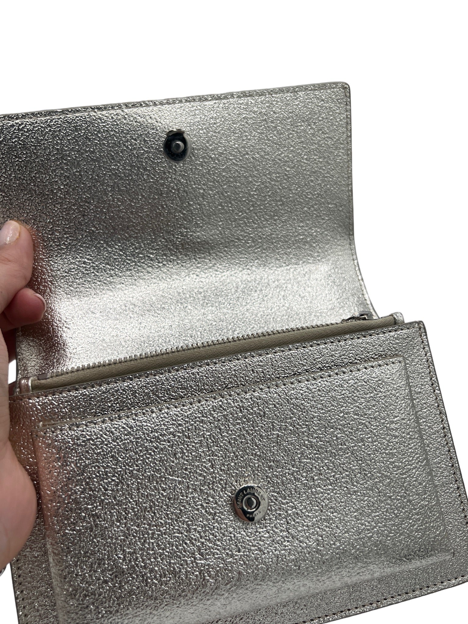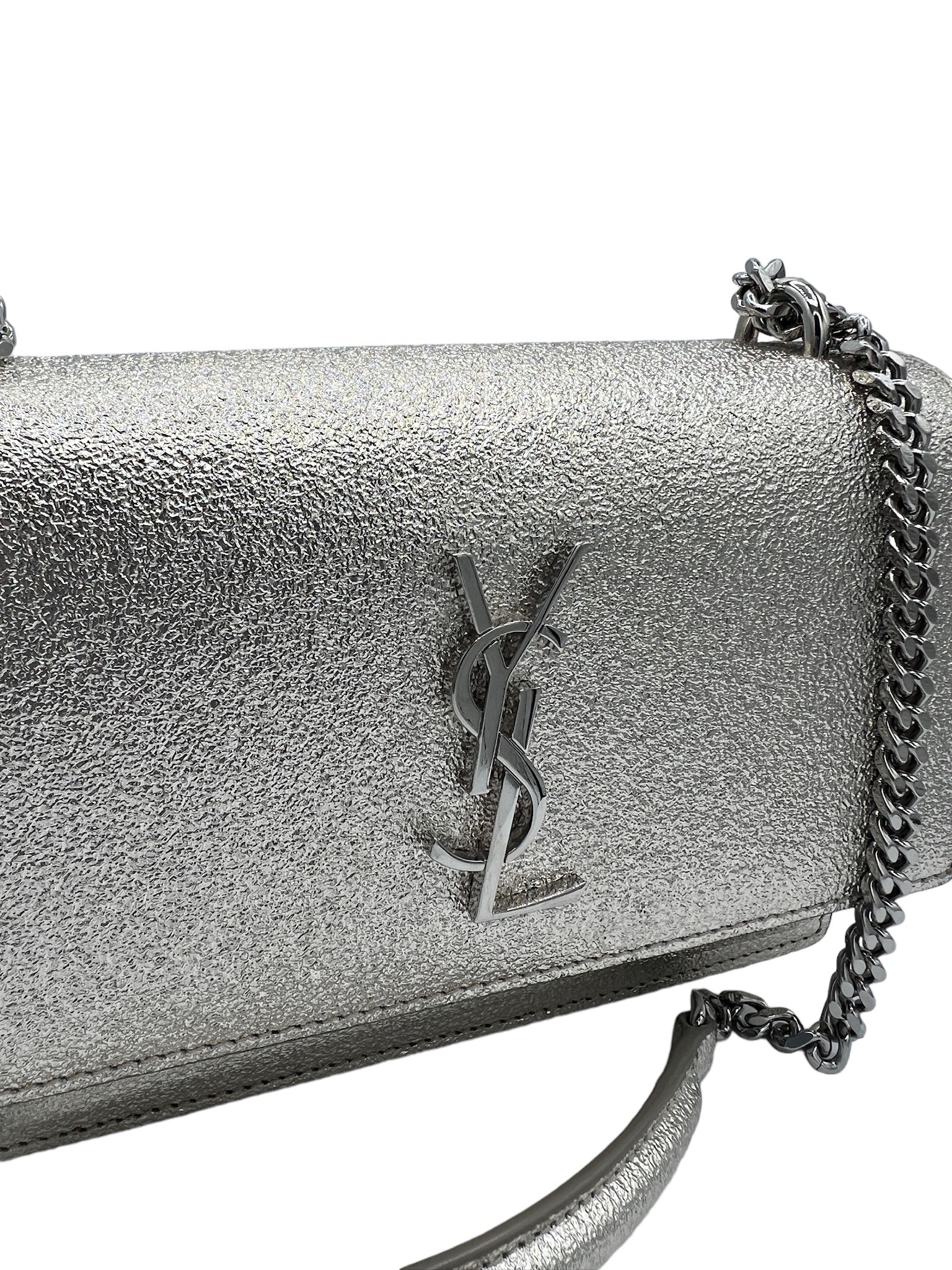 Este bolso bandolera SAINT LAURENT usado es una opción hermosa y elegante para cualquier atuendo. La piel de becerro craquelada metalizada agrega un toque de brillo a tu look diario.