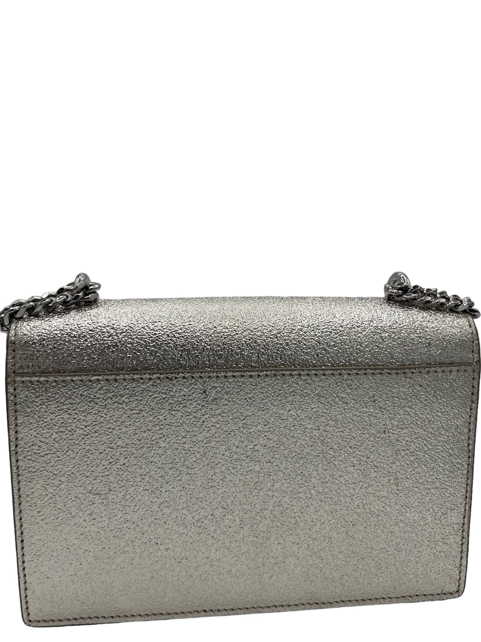 Este bolso cuenta con herrajes en tono plateado, que complementan maravillosamente el acabado metálico del material de piel de becerro.