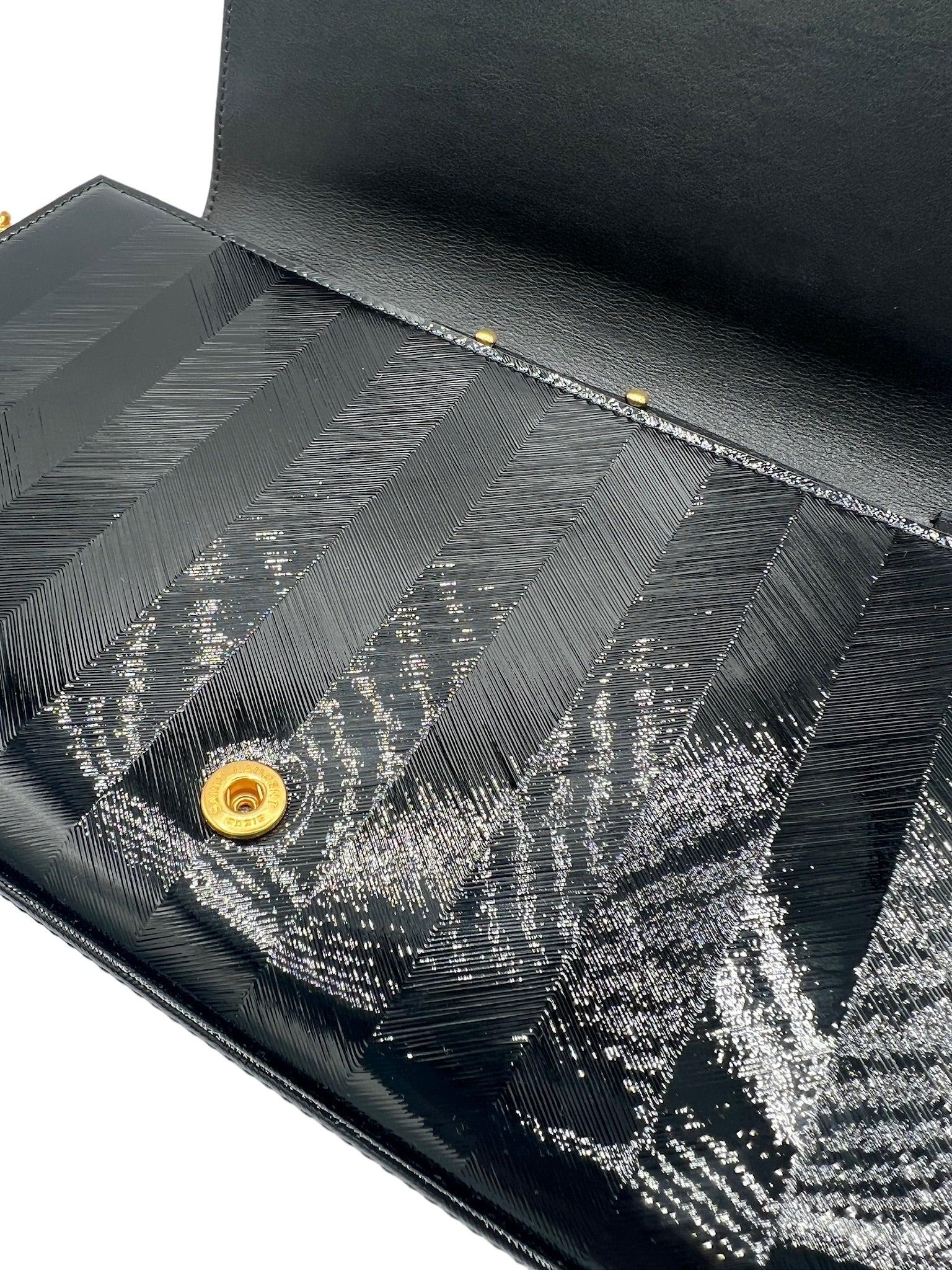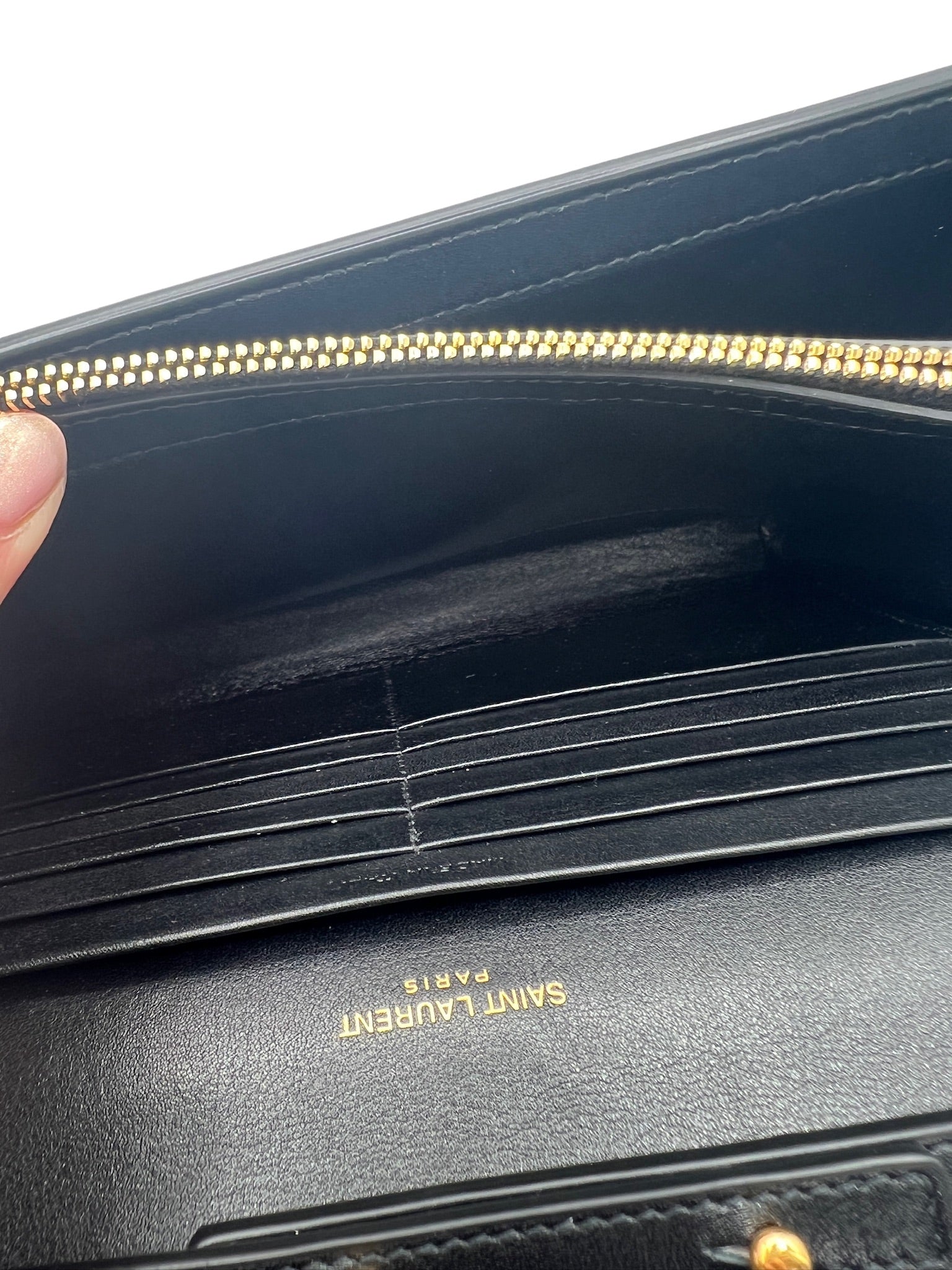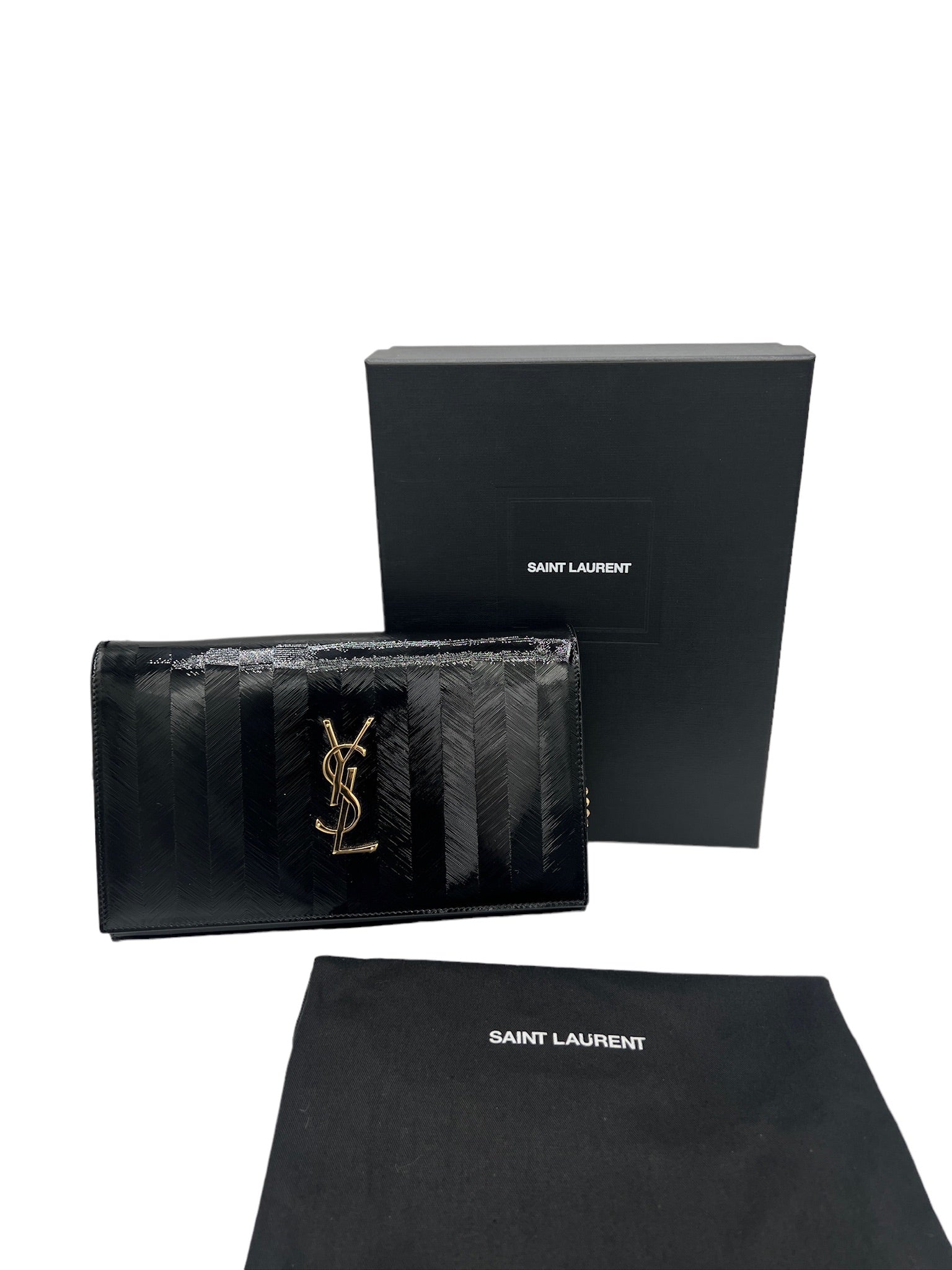 Verificado por el autenticador/agencia entrupy para que puedas comprar con confianza sabiendo que este bolso tipo billetera con cadena de patente y monograma de SAINT LAURENT usado es una pieza auténtica que te durará por muchos años.