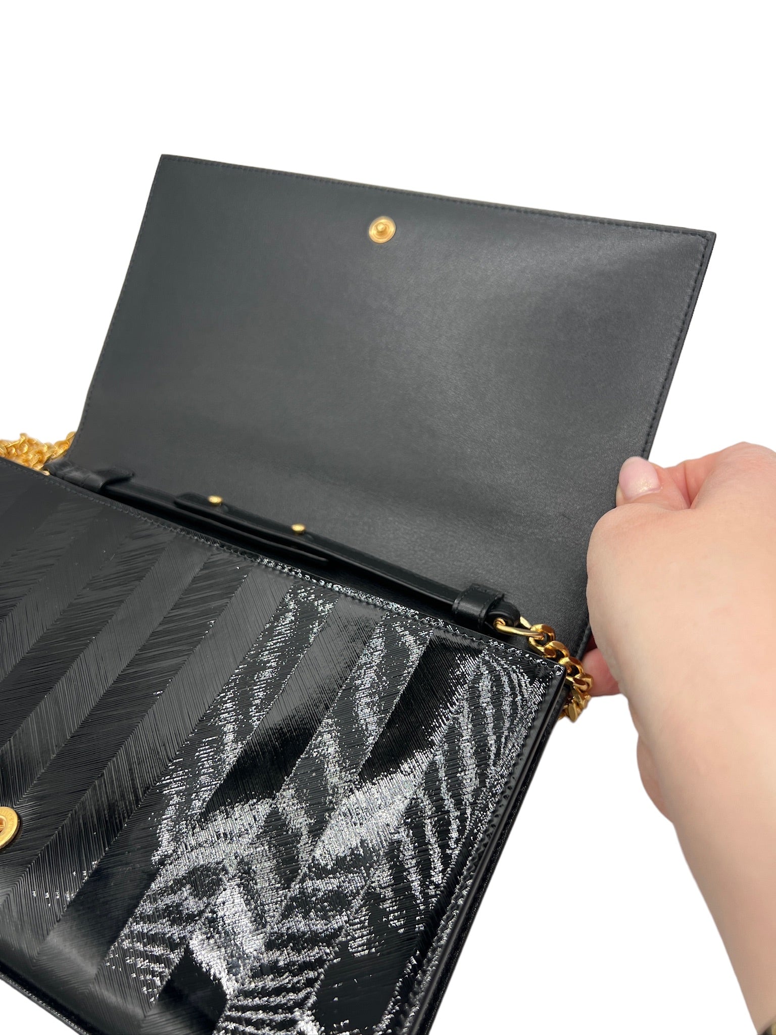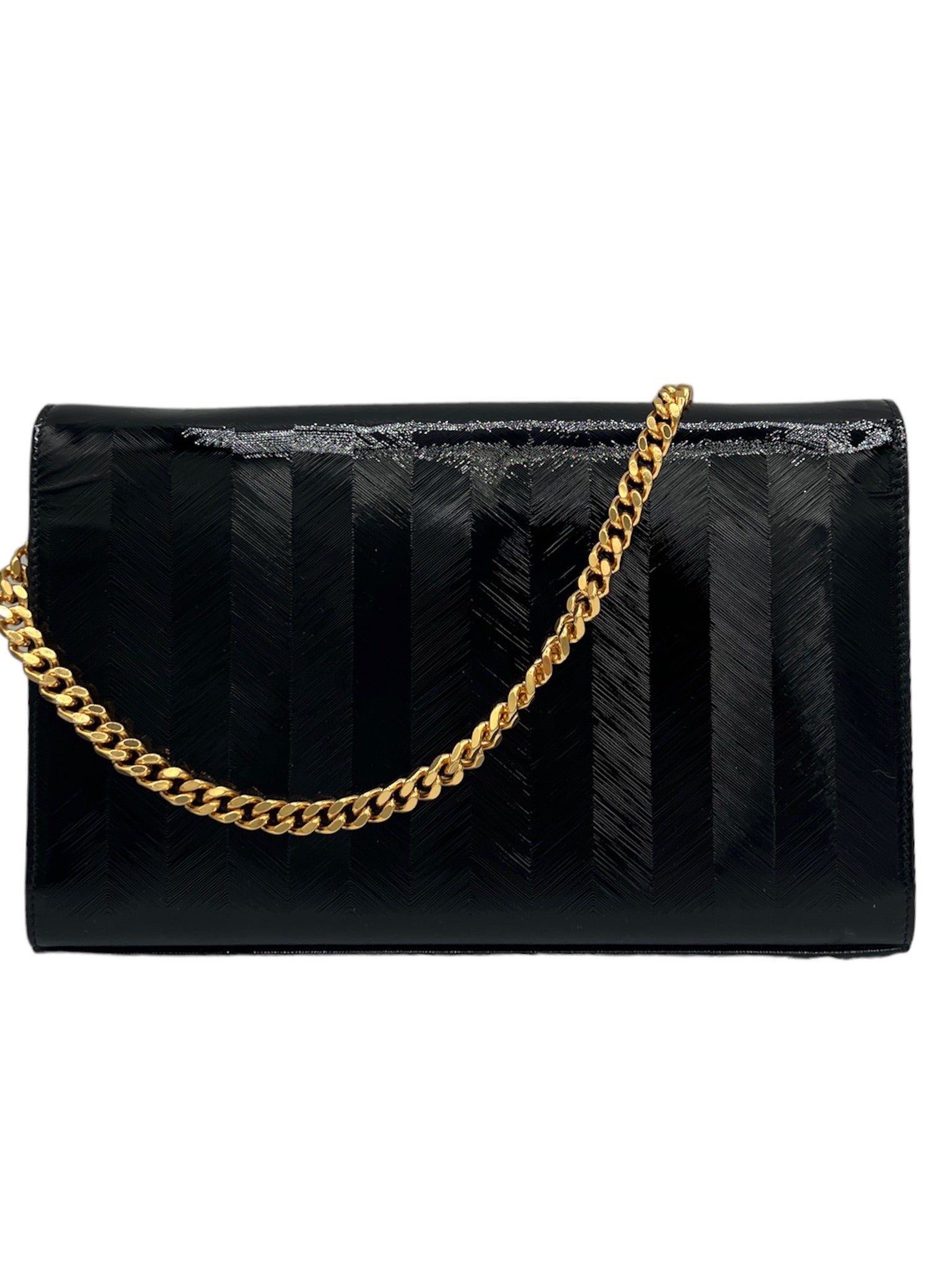 Este bolso de mano con cadena y monograma de charol de SAINT LAURENT usado es el complemento perfecto para tu colección. Este bolso, confeccionado en Italia con charol de alta calidad, cuenta con un forro de piel suave y herrajes en tono dorado.