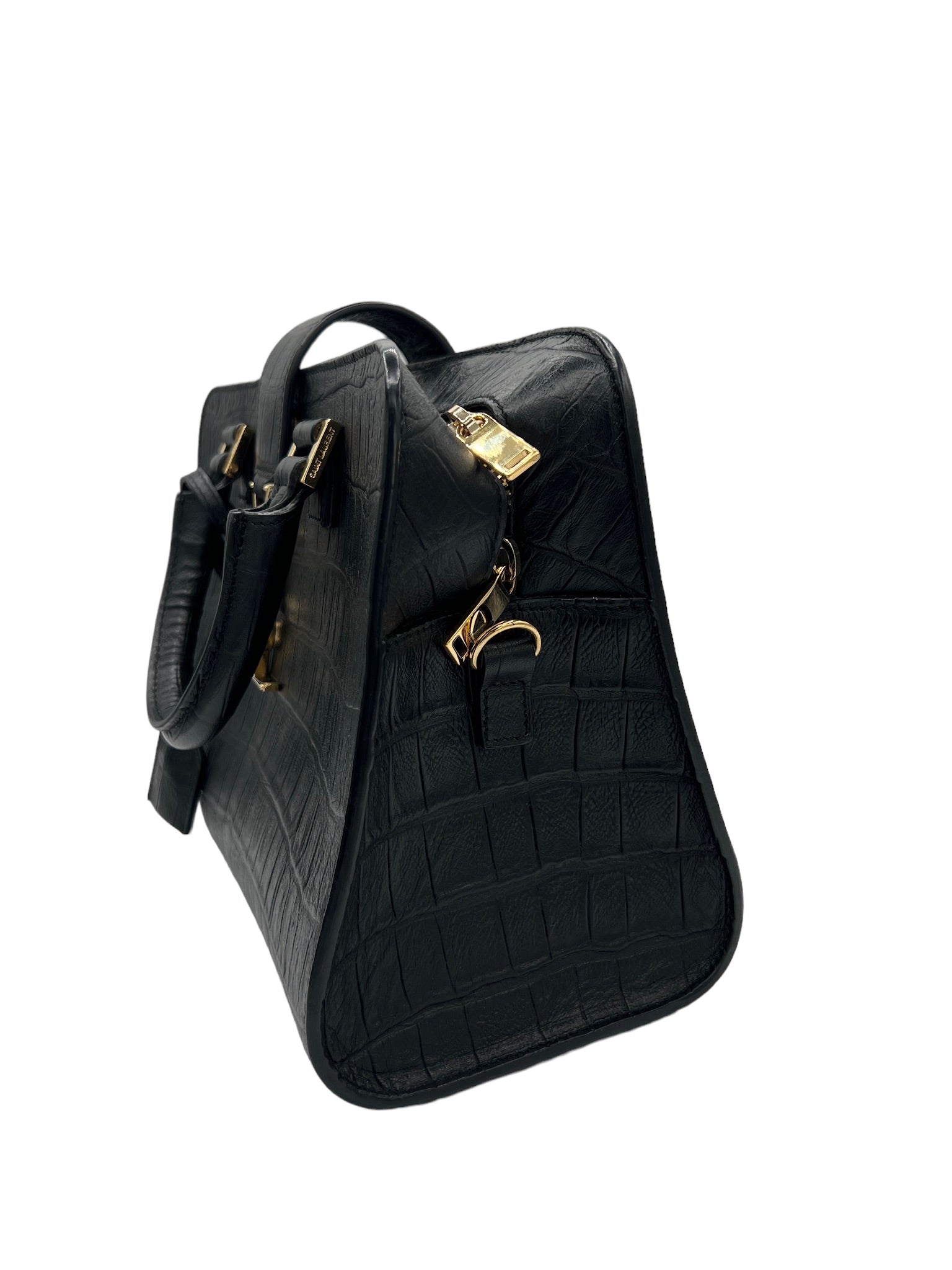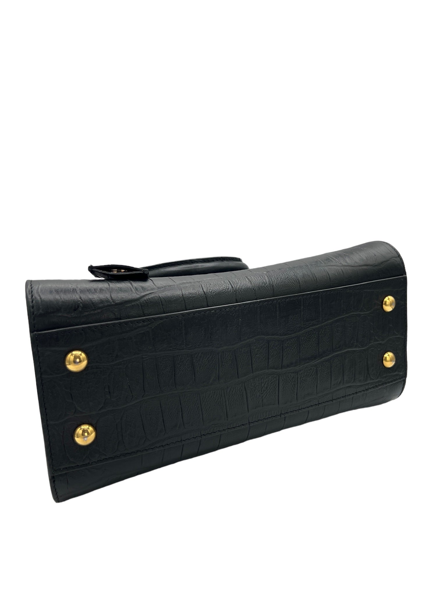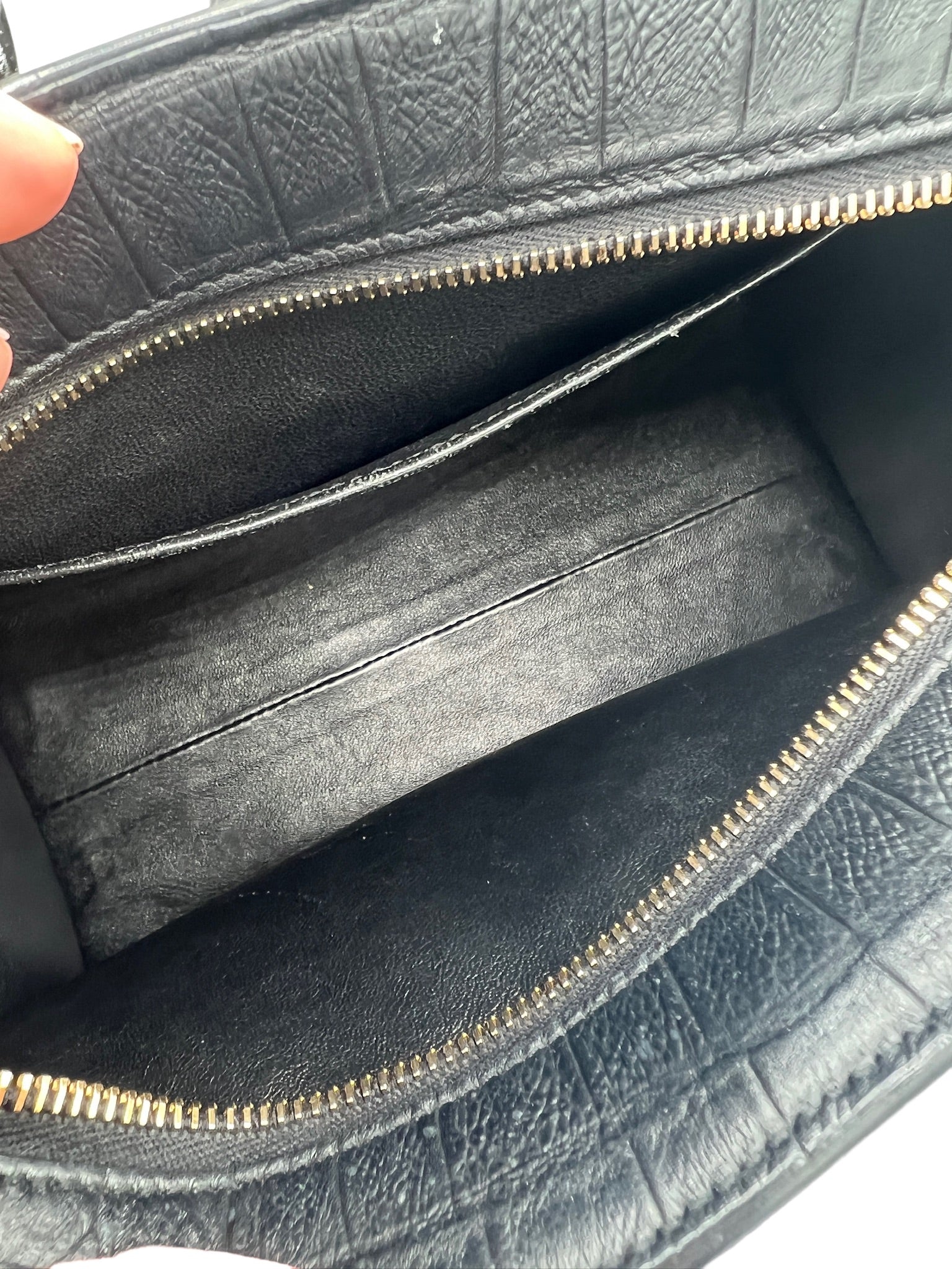 Este bolso de mano Baby Cabas de SAINT LAURENT - PARIS usado es el complemento perfecto para su colección de bolsos con asa superior. Este bolso de mano, confeccionado en piel negra, incluye un accesorio clochette y está en muy buenas condiciones.