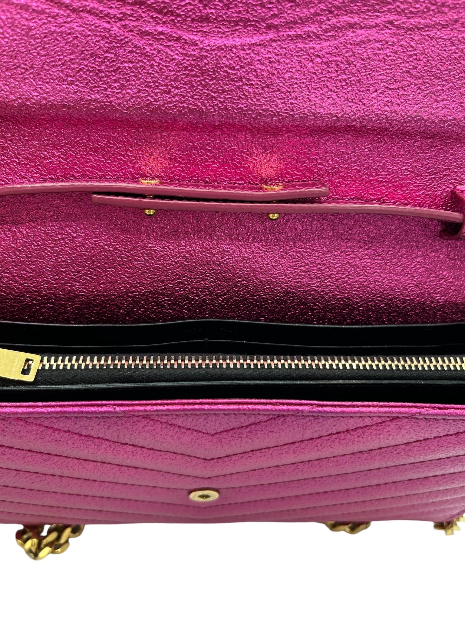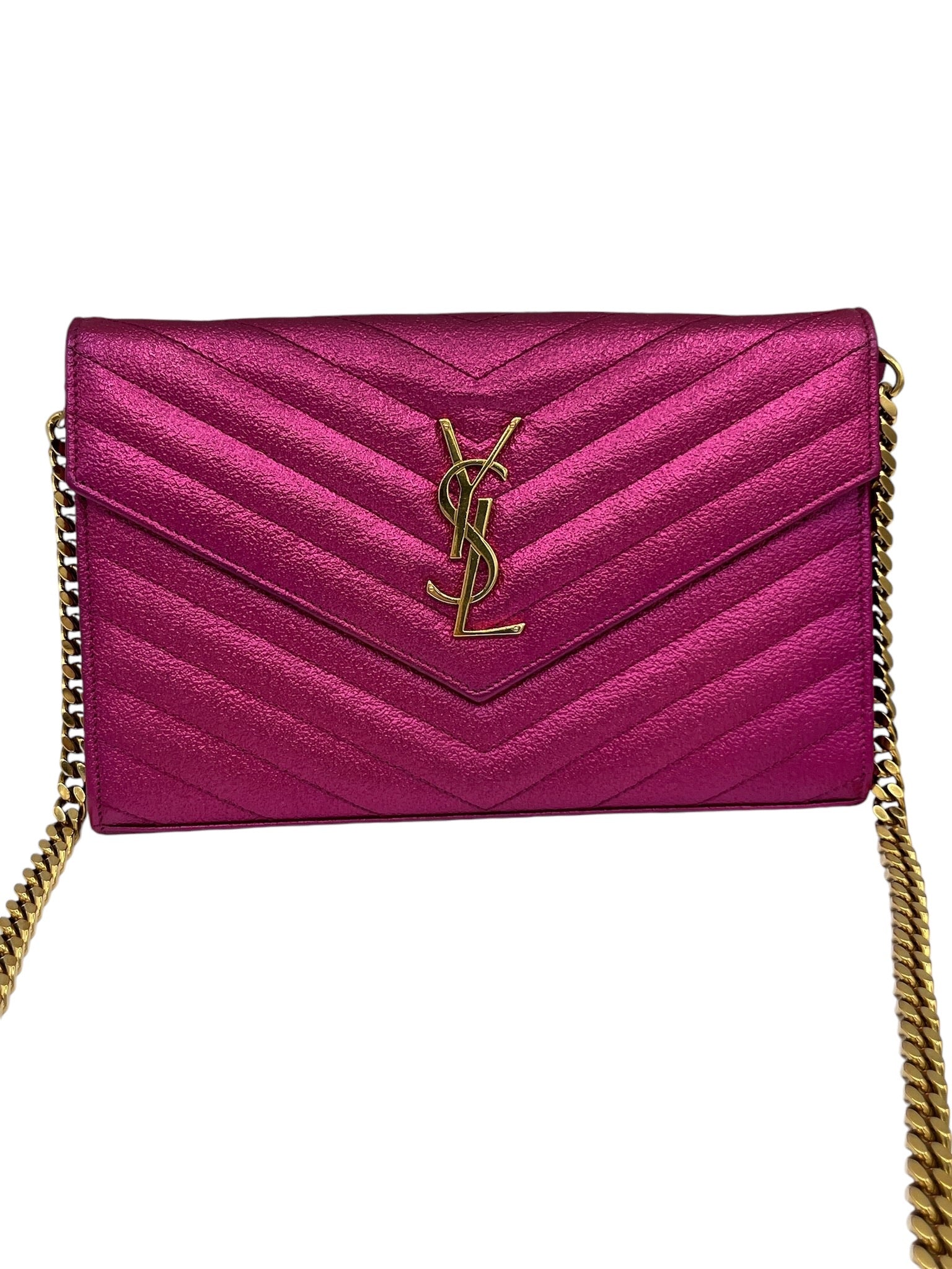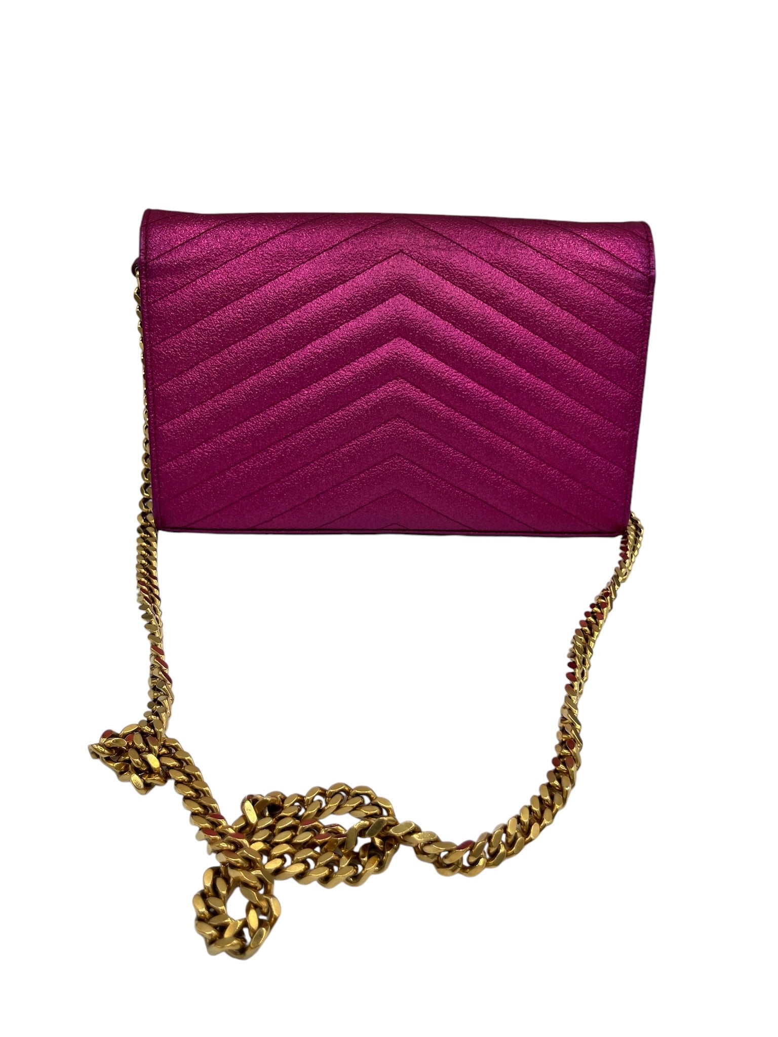 Este bolso bandolera con cadena y diseño de chevron metalizado rosa de SAINT LAURENT es un accesorio elegante y versátil en muy buenas condiciones.