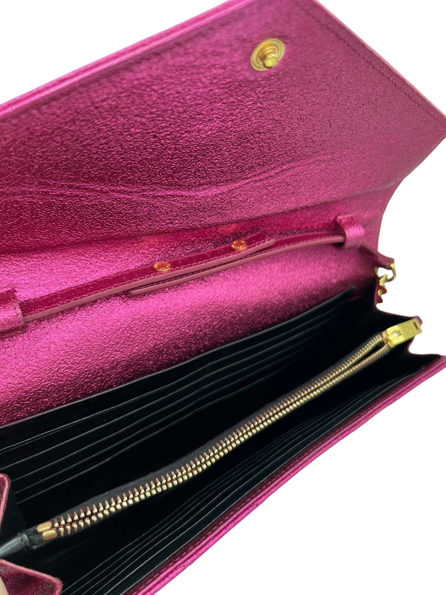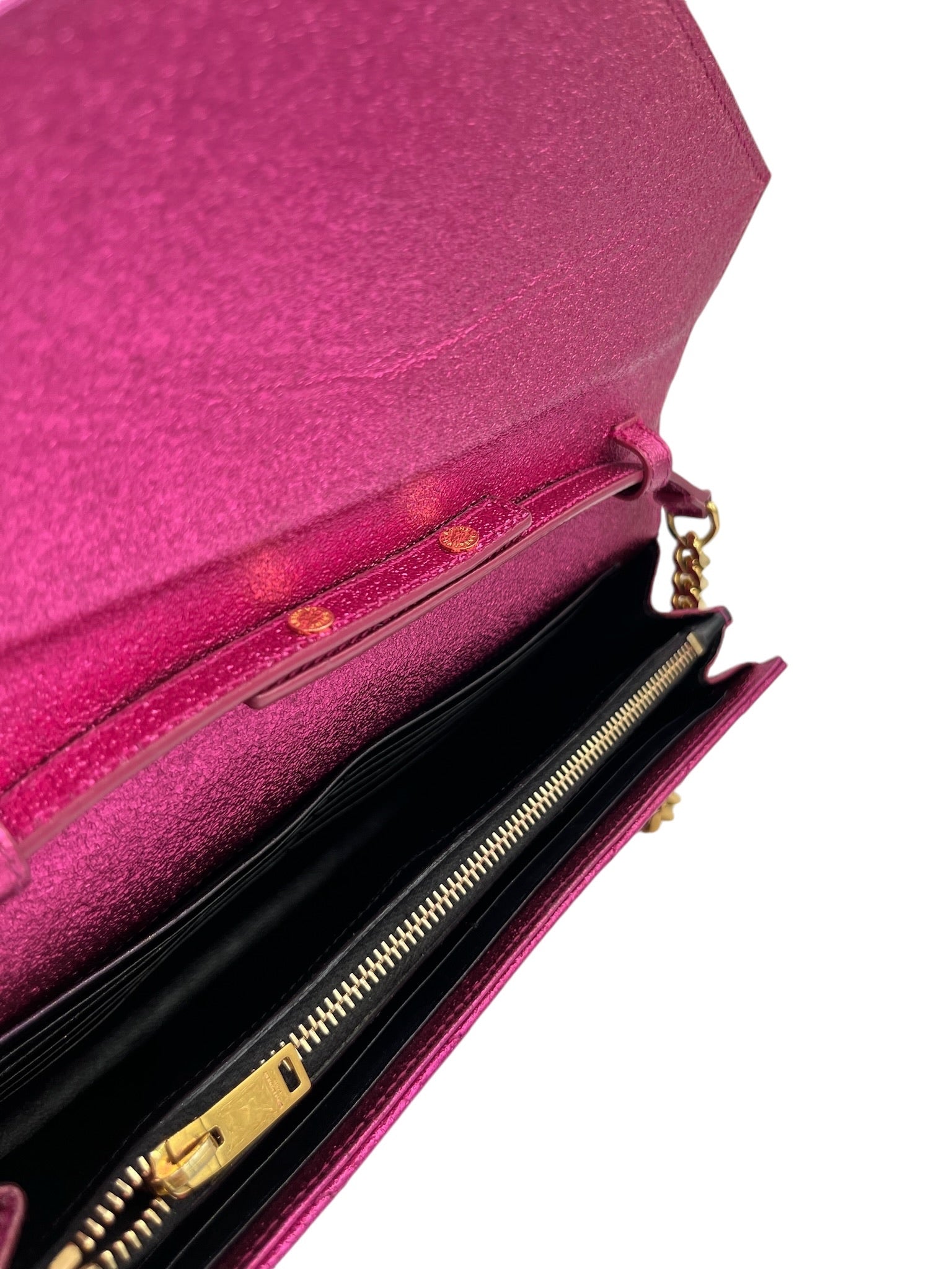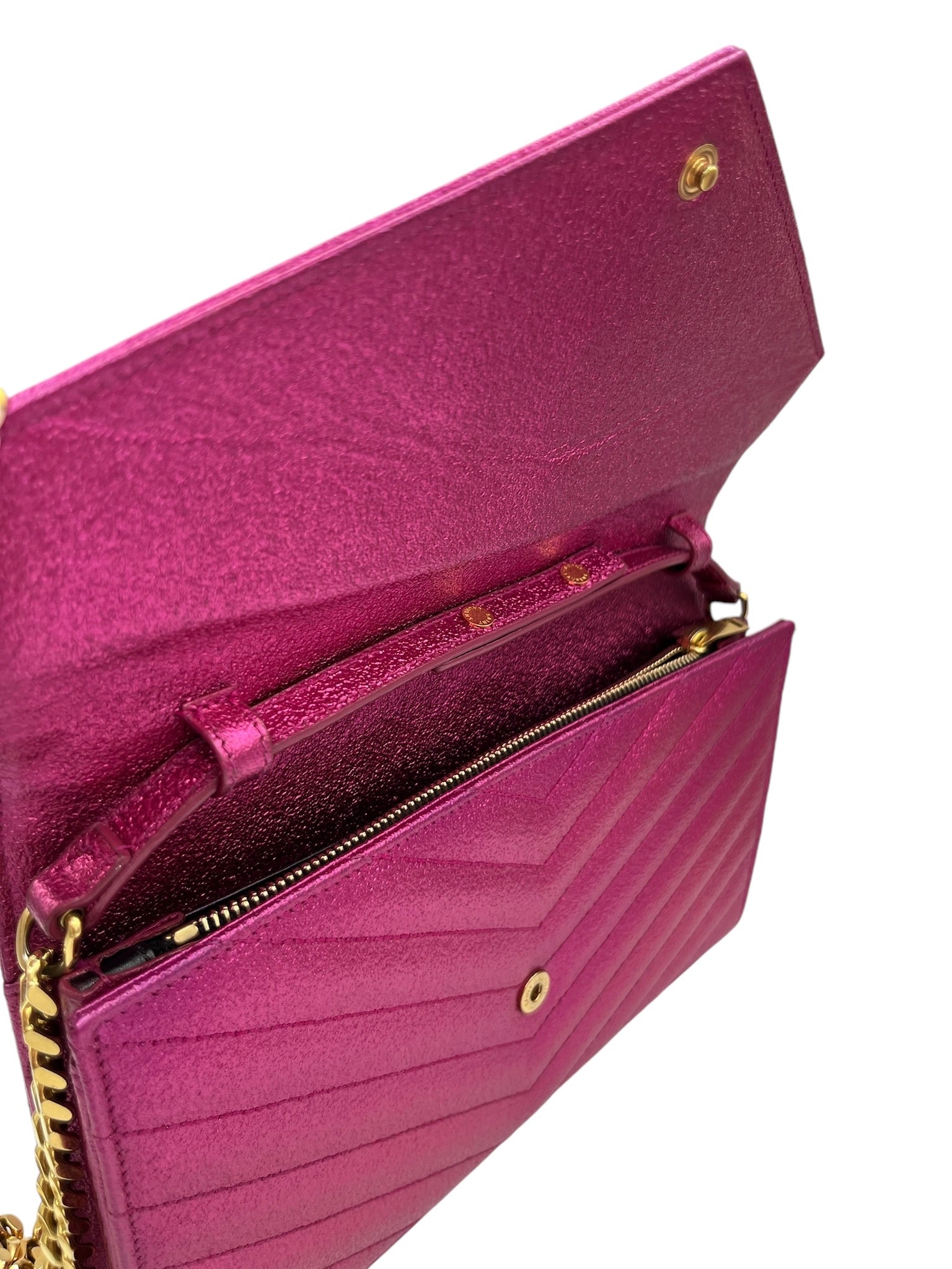 Este bolso bandolera con cadena y diseño de chevron metalizado rosa de SAINT LAURENT es un accesorio elegante y versátil en muy buenas condiciones.