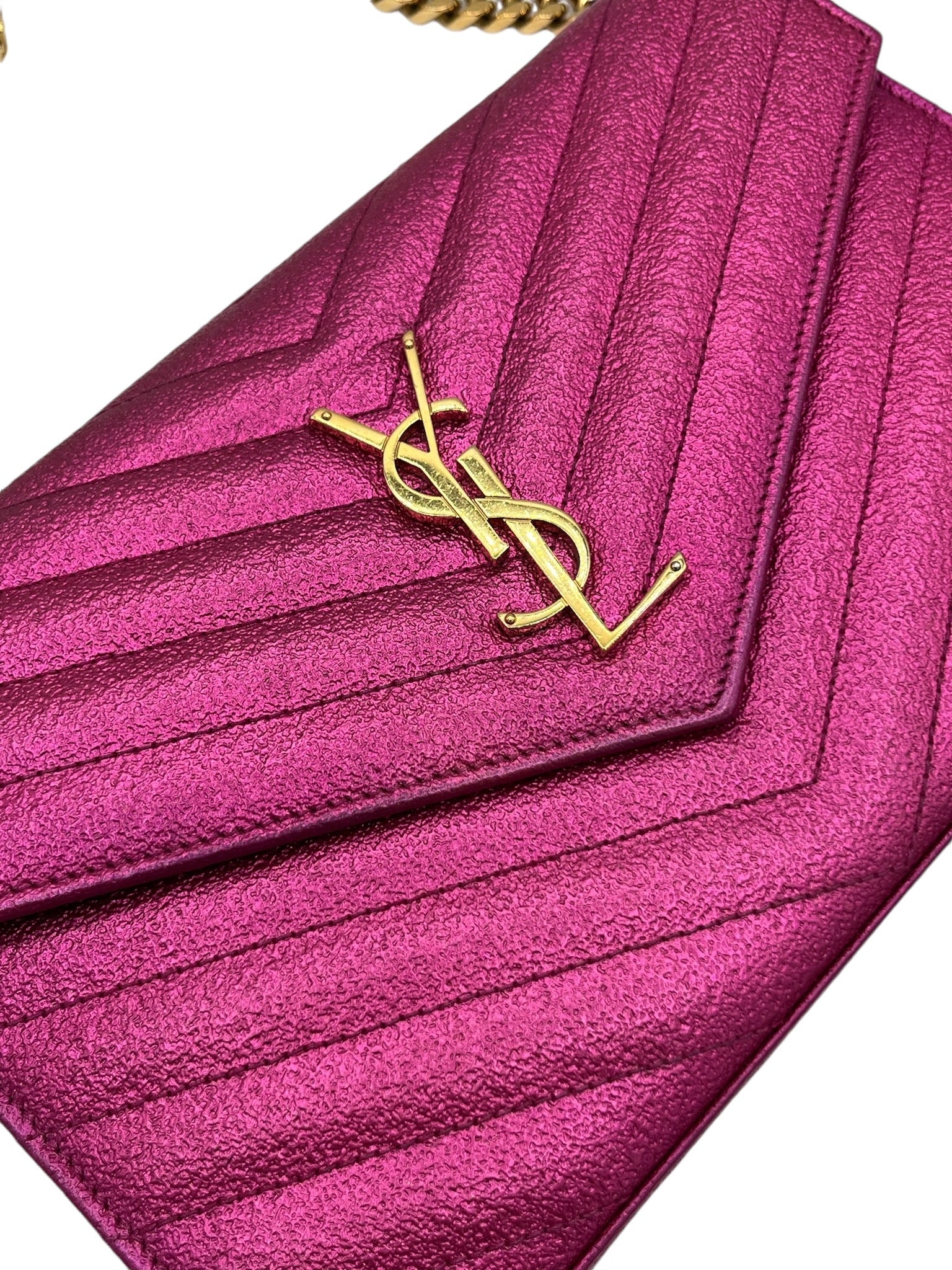 SAINT LAURENT - Cartera con cadena y acolchado matelasse granulado en color rosa metalizado con diseño de chevron