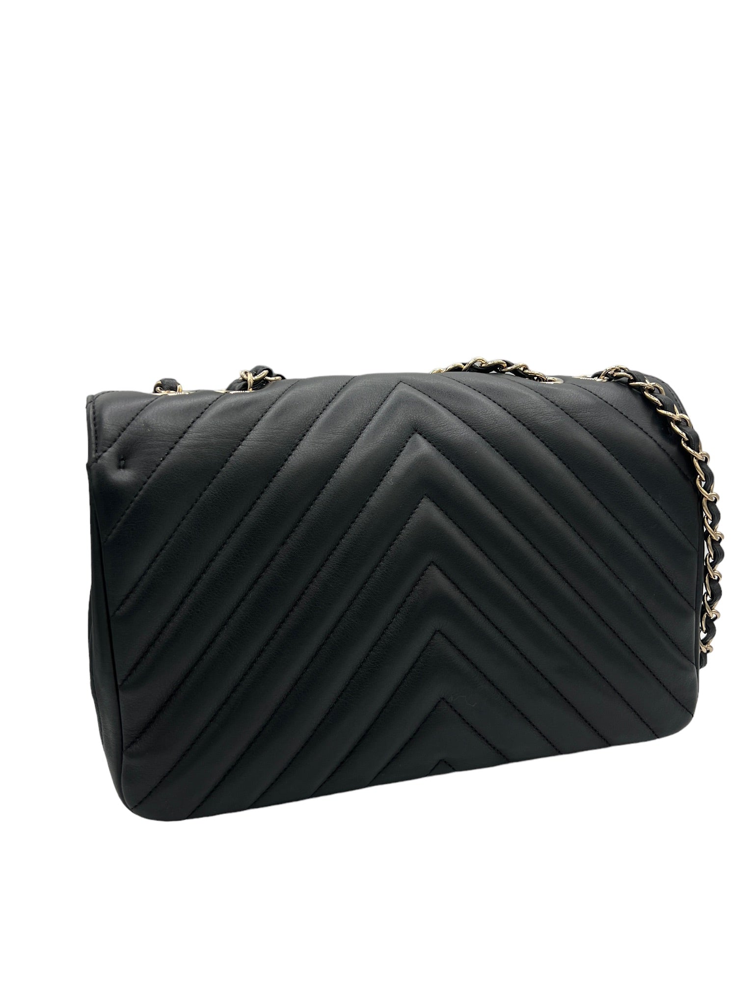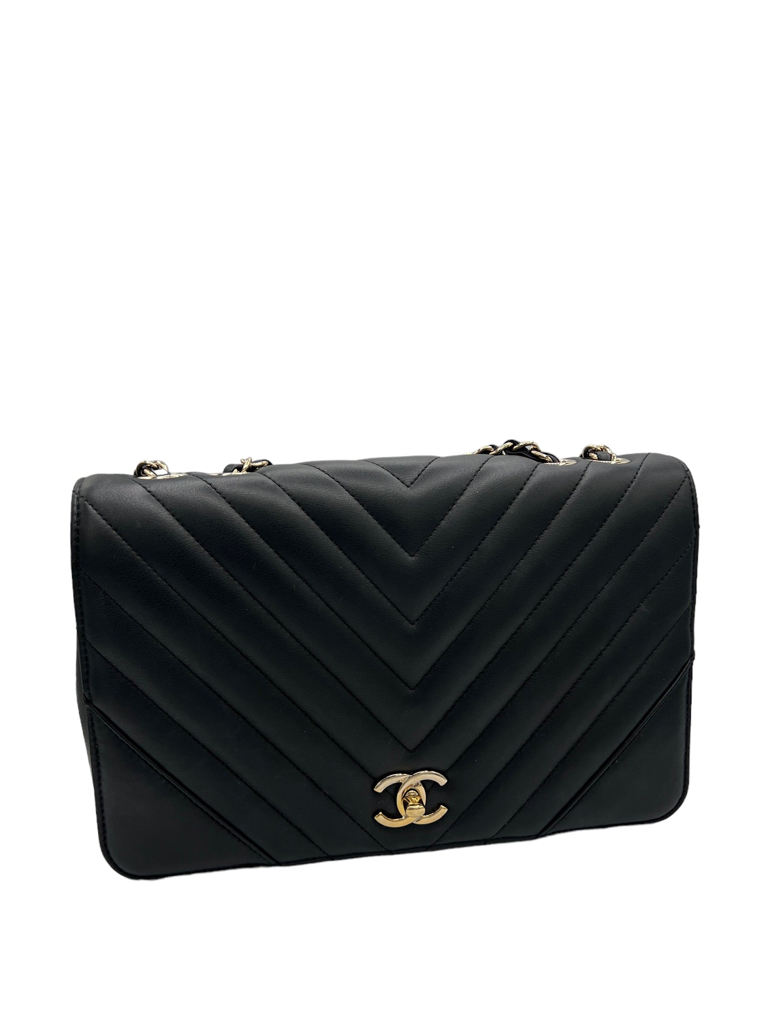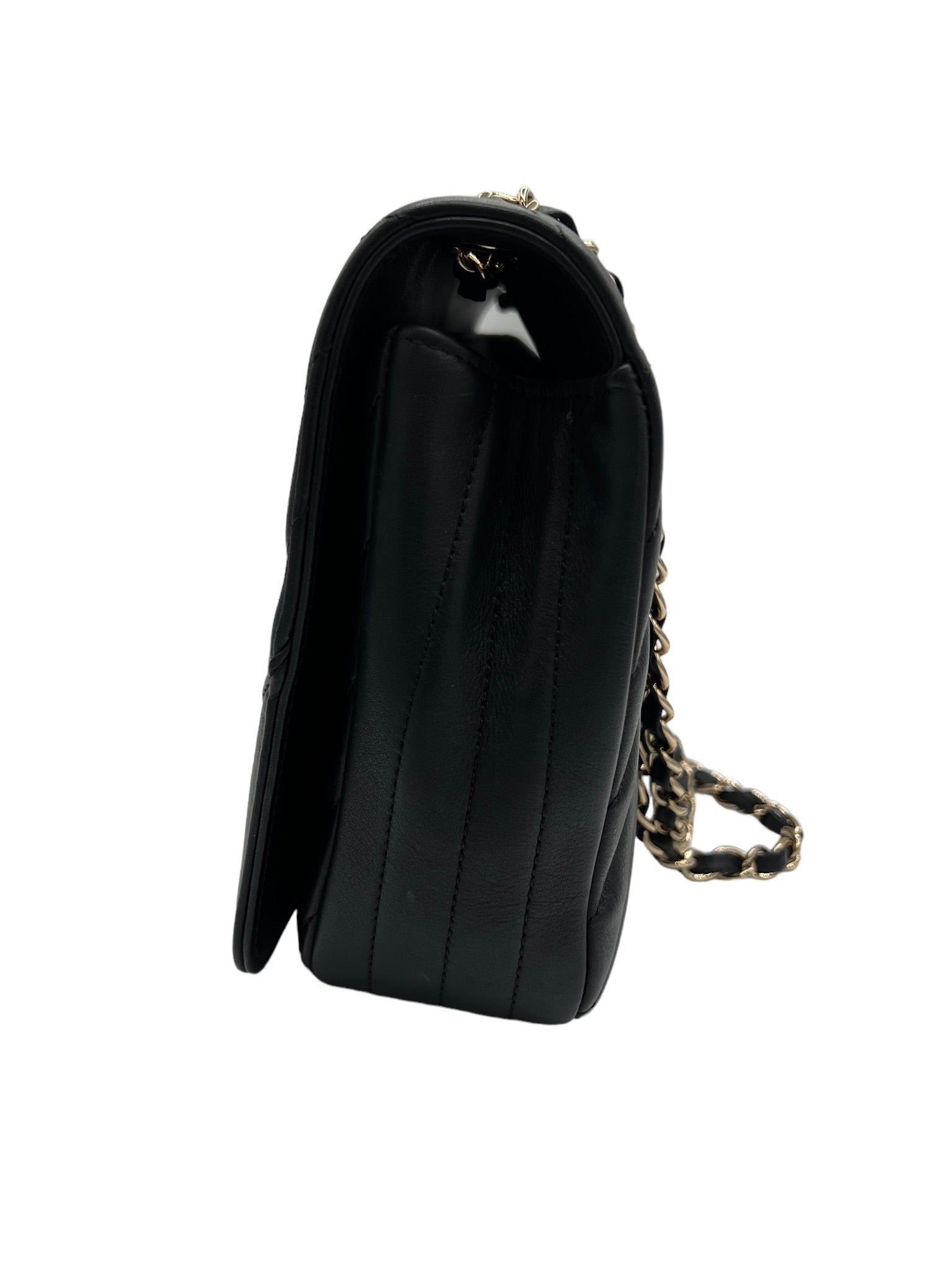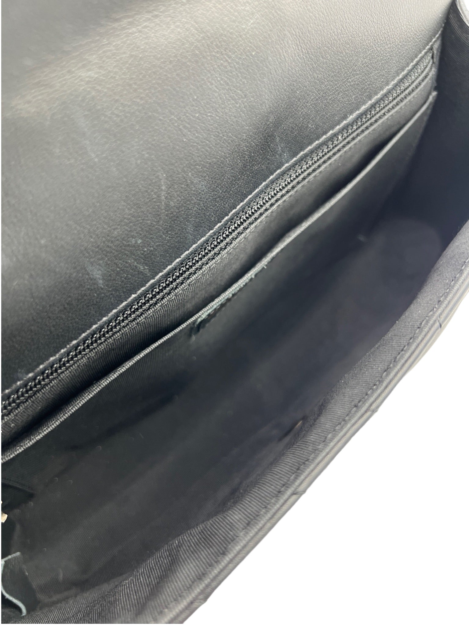 This Pre-Owned Calfskin Shoulder Bag is a stylish accessory that offers a touch of sophistication to any outfit. The bag's black color and golden toned hardware make it a classic piece that can be paired with many different looks.