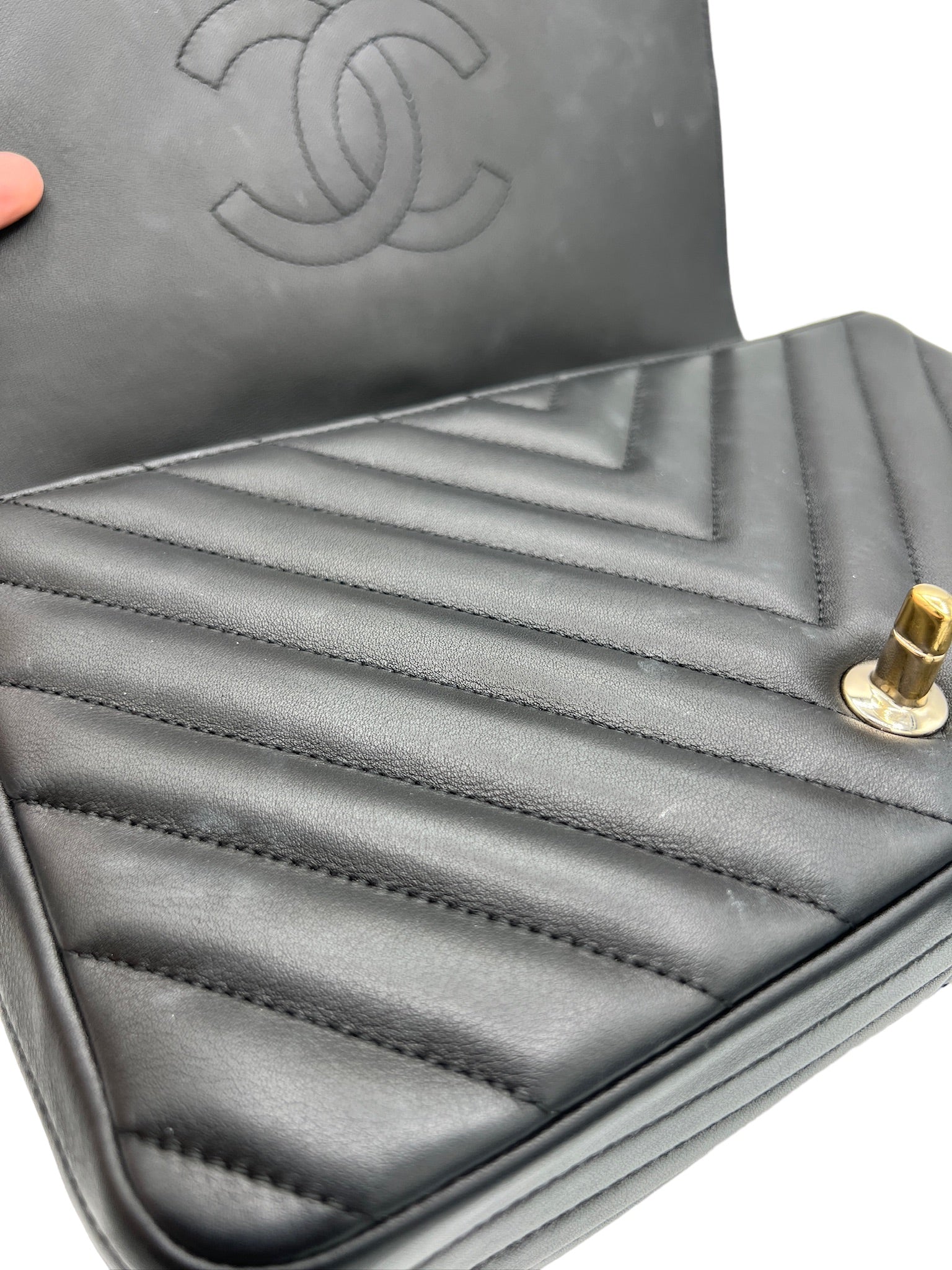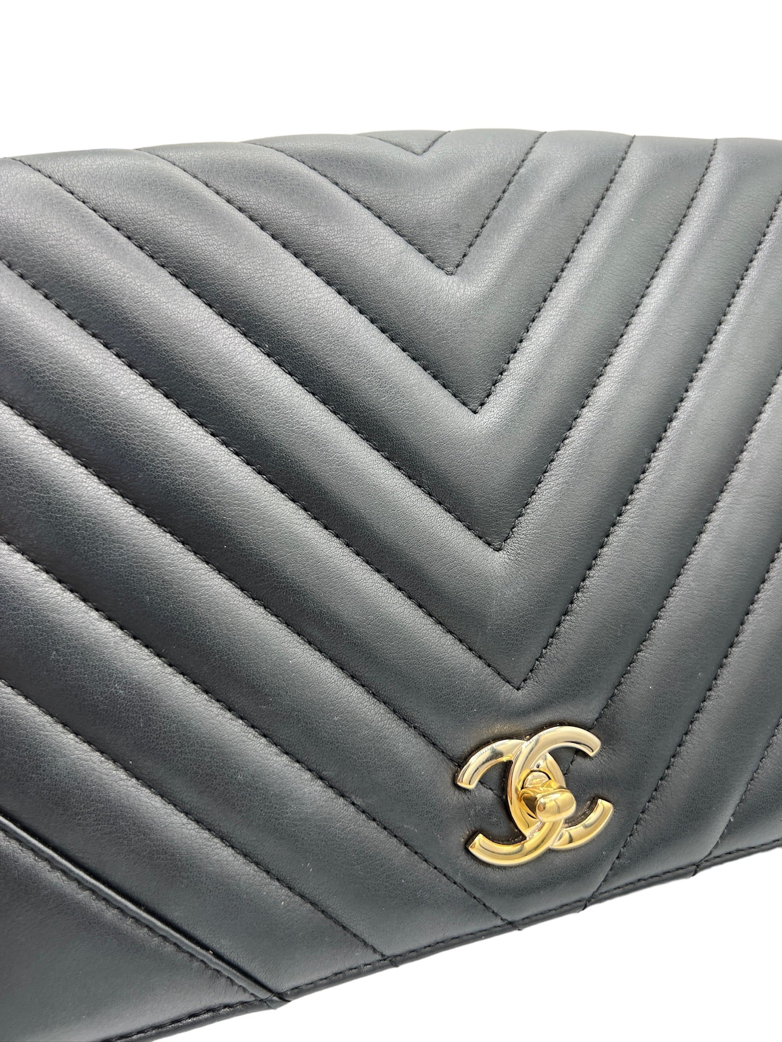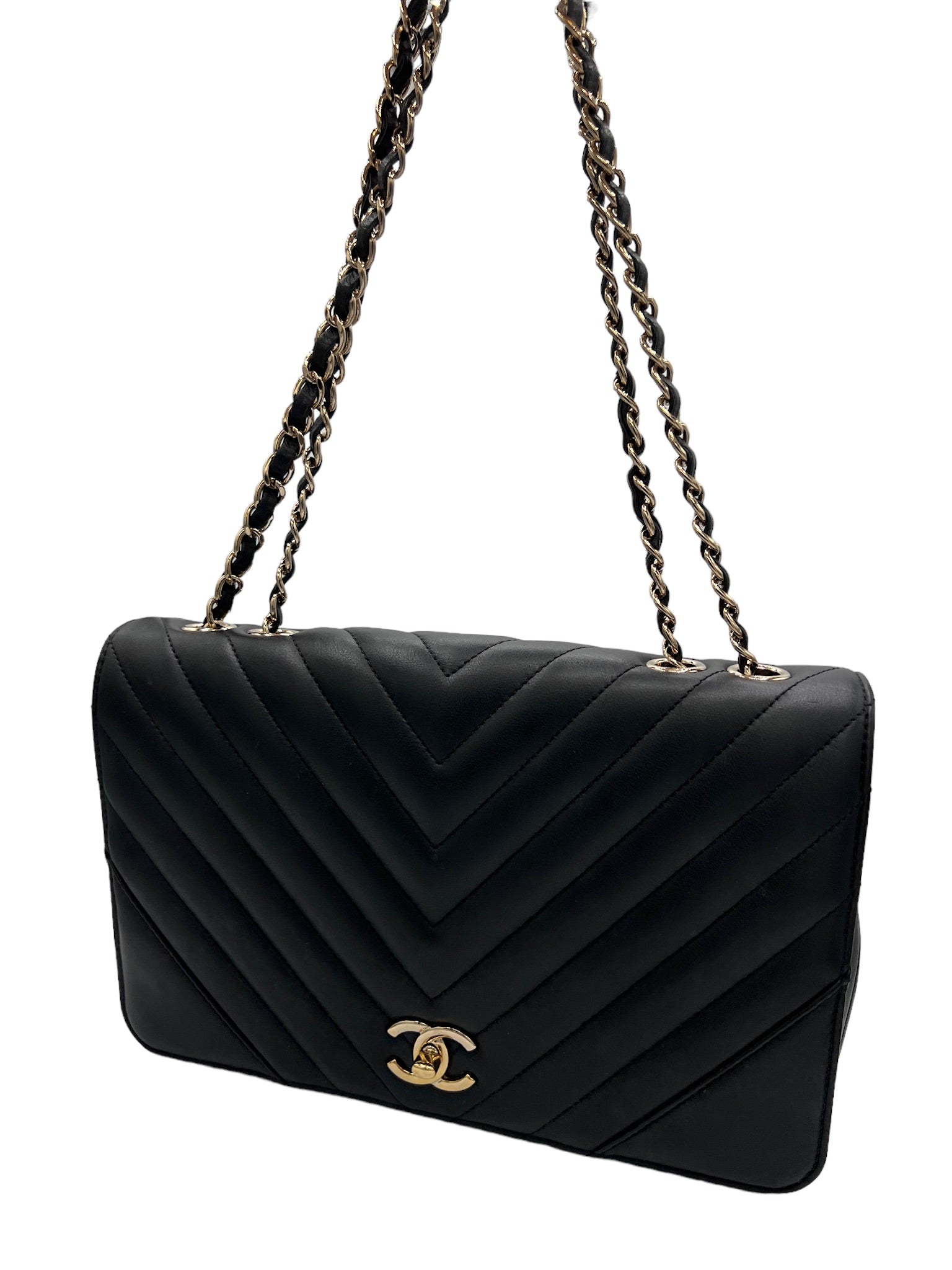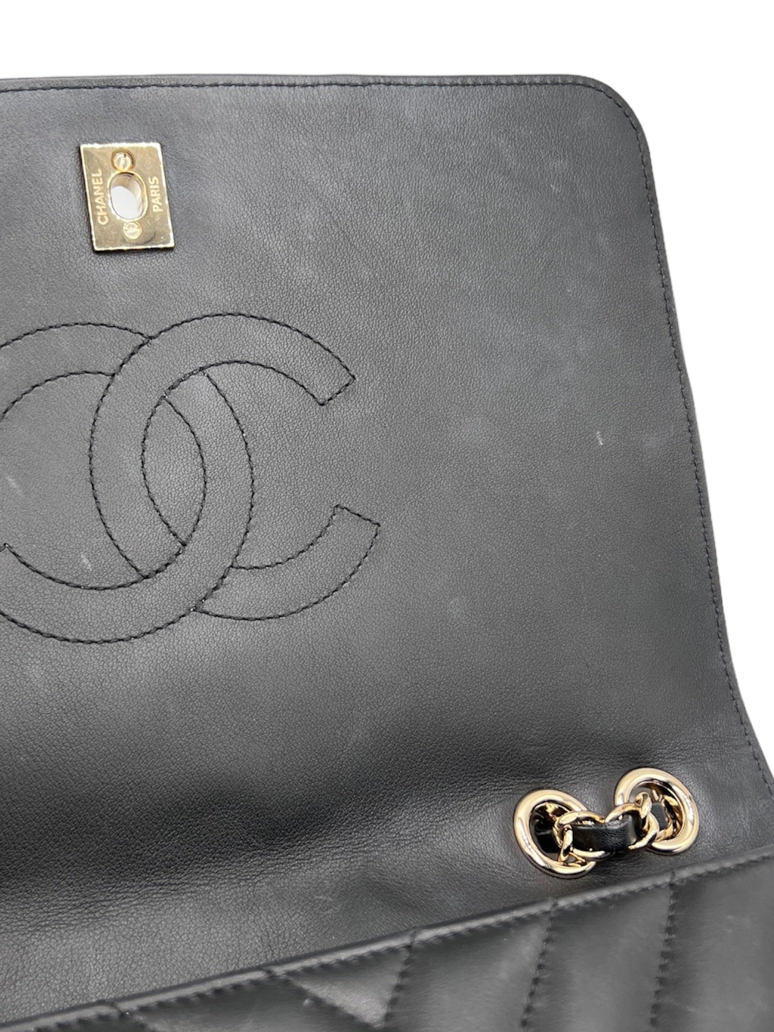 This Pre-Owned Calfskin Shoulder Bag is a stylish accessory that offers a touch of sophistication to any outfit. The bag's black color and golden toned hardware make it a classic piece that can be paired with many different looks.
