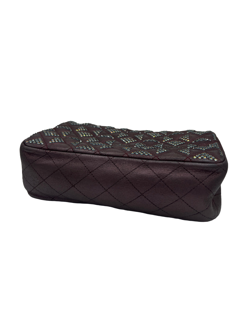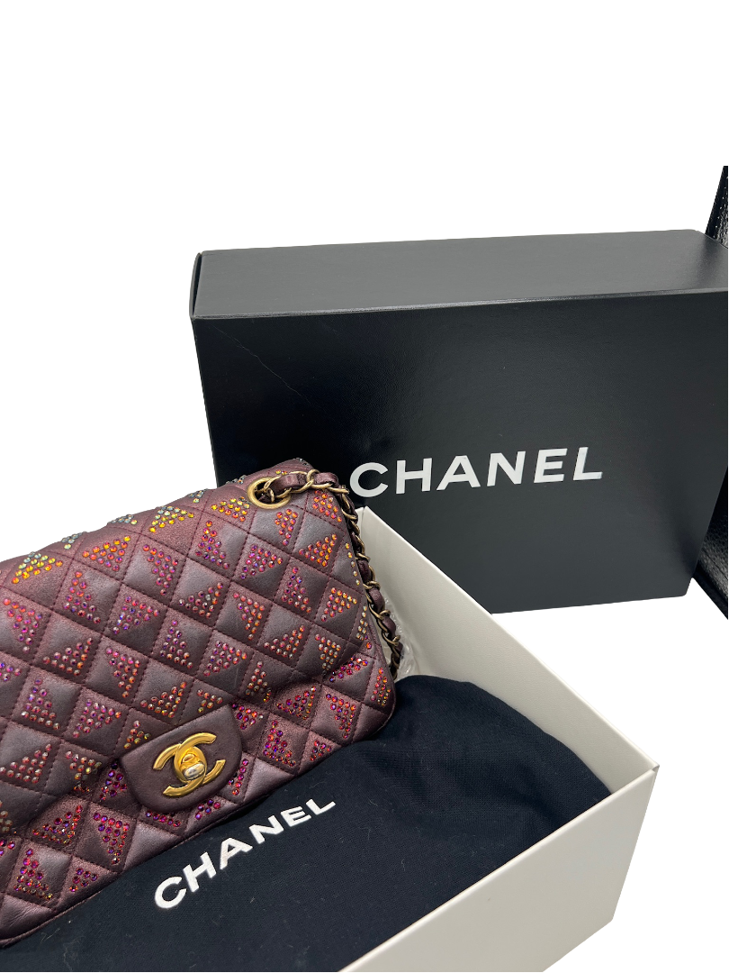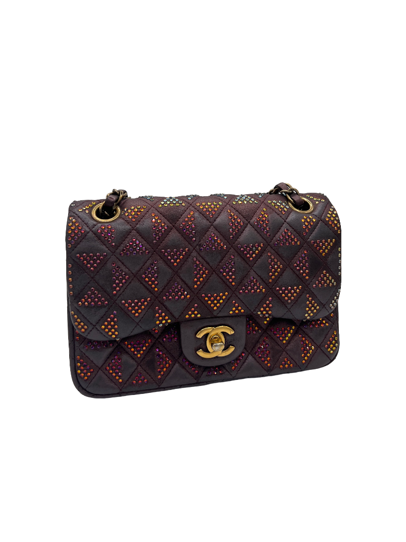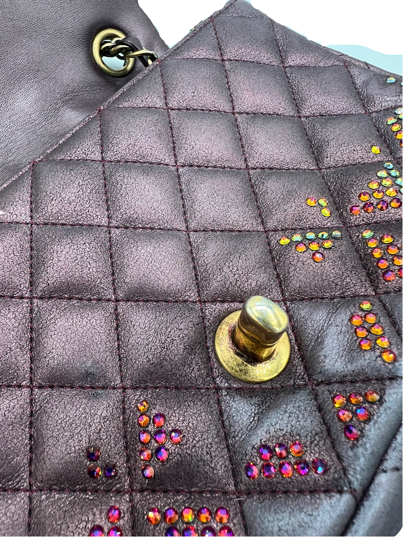 Introducing the CHANEL Purple Rhinestone Shoulder Bag, a stunning accessory that will elevate any outfit! This gorgeous bag features golden hardware that adds a touch of luxury to the already glamorous design. With this bag, you'll turn heads and make a statement wherever you go.