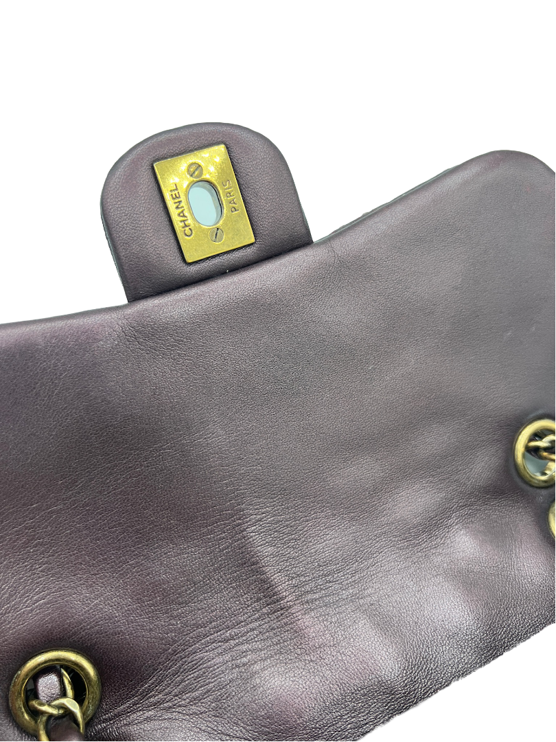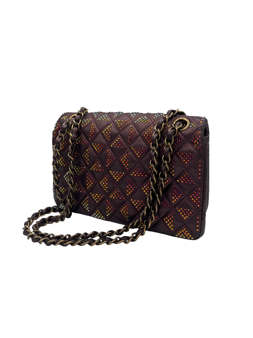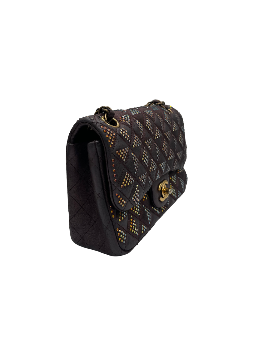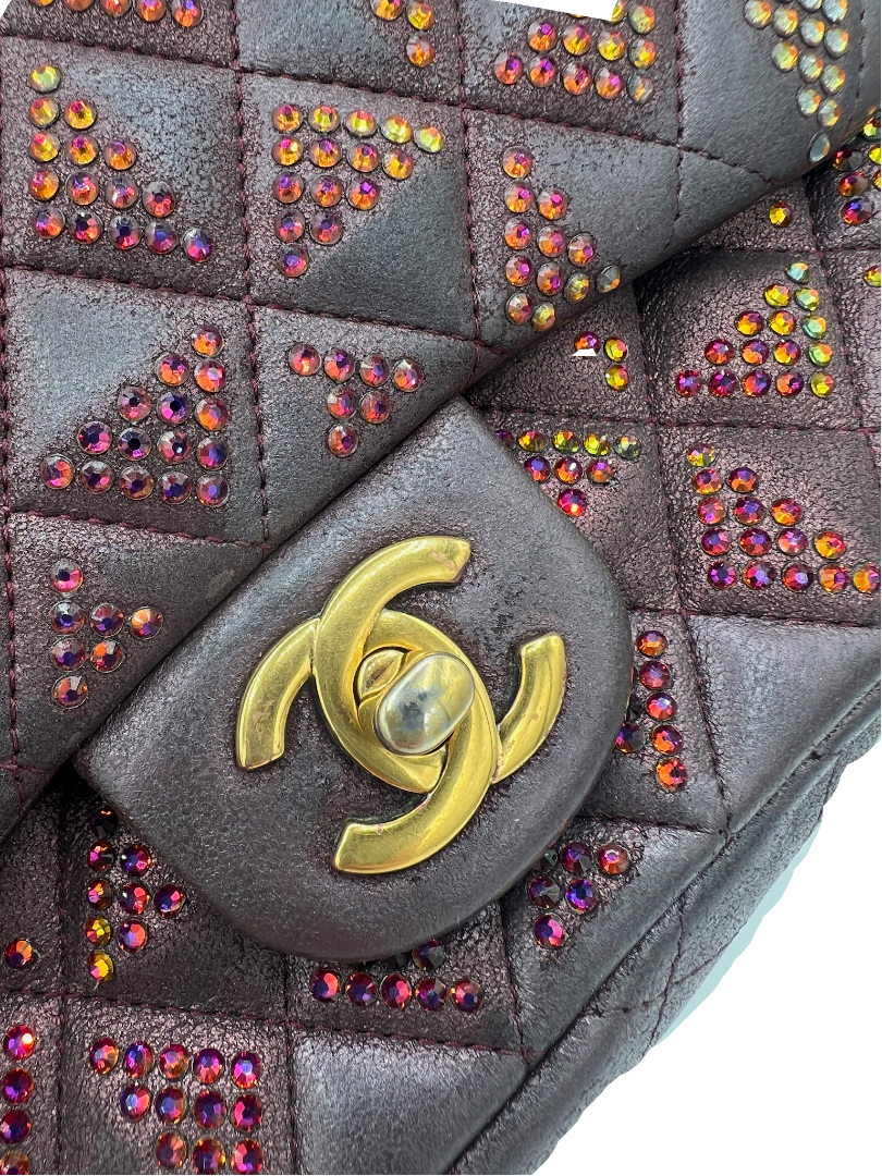 Introducing the CHANEL Purple Rhinestone Shoulder Bag, a stunning accessory that will elevate any outfit! This gorgeous bag features golden hardware that adds a touch of luxury to the already glamorous design. With this bag, you'll turn heads and make a statement wherever you go.