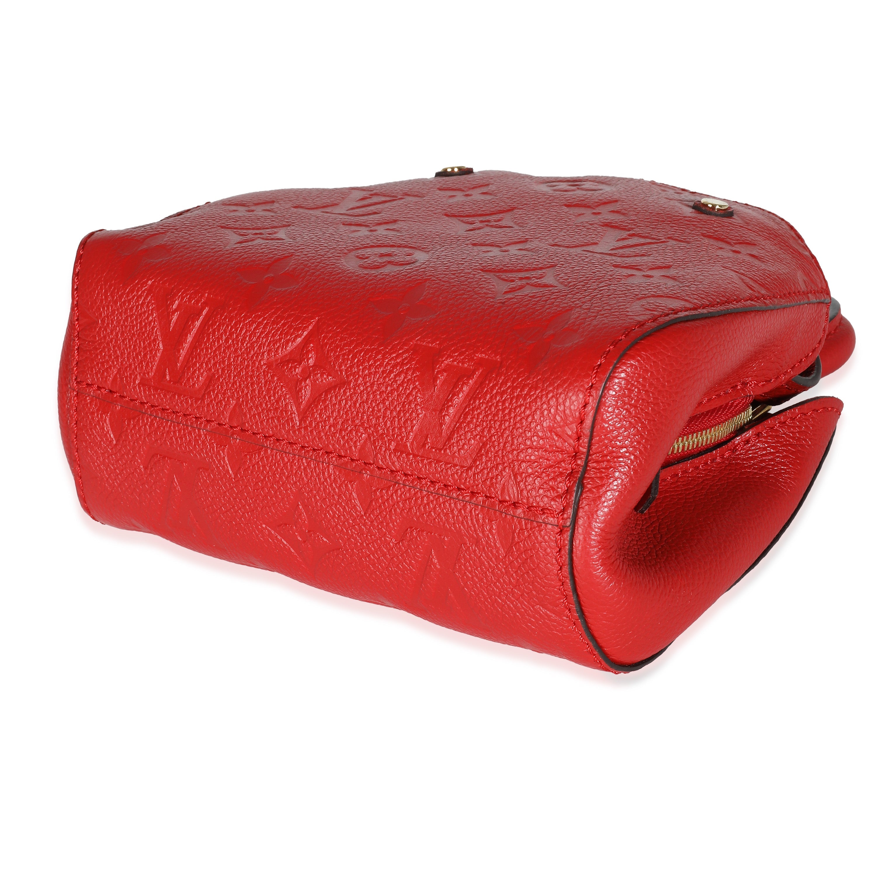 Experience luxury at its finest with the LOUIS VUITTON Cherry Monogram Empreinte Nano Montaigne Crossbody Bag. Crafted from luxurious Empreinte leather, this 2015 bag is in excellent condition and comes with a box and dustbag. Its vibrant red color and versatile strap make it a statement piece for any occasion. Made in France, its compact size is perfect for on-the-go style.