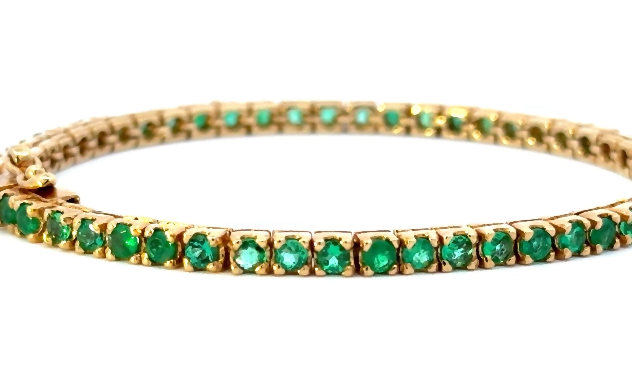 Indulge in luxury with our Colombian Emerald Tennis Bracelet. Exquisitely crafted in 18K yellow gold, this stunning piece features 7 points each of brilliant Colombian emeralds, for a total of 4 carats. Adorn your wrist with the timeless elegance and vibrant beauty of these precious gems.