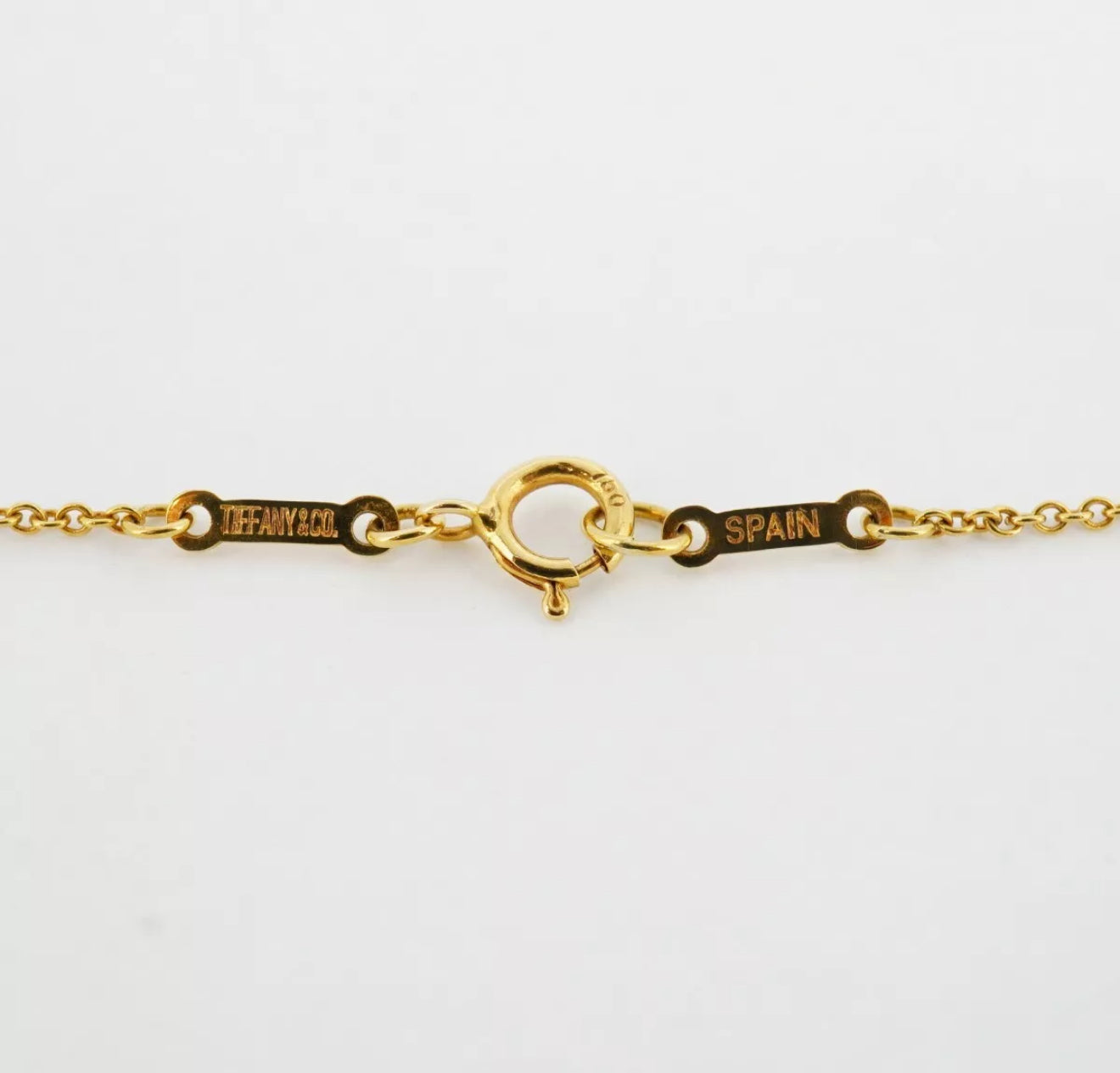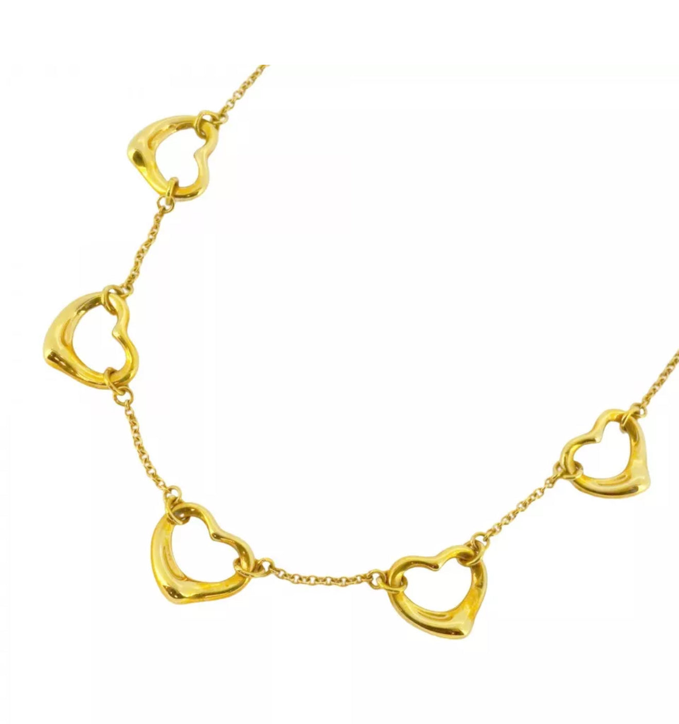 Indulge in luxury with our pre-owned Tiffany & Co. 18K Yellow Gold Elsa Peretti 5 Motifs Open Heart Necklace. Enjoy the excellent condition and moderate wear throughout for a unique touch. At a length of 14.75 inches, this necklace will add elegance to any outfit. Treat yourself or a loved one today!