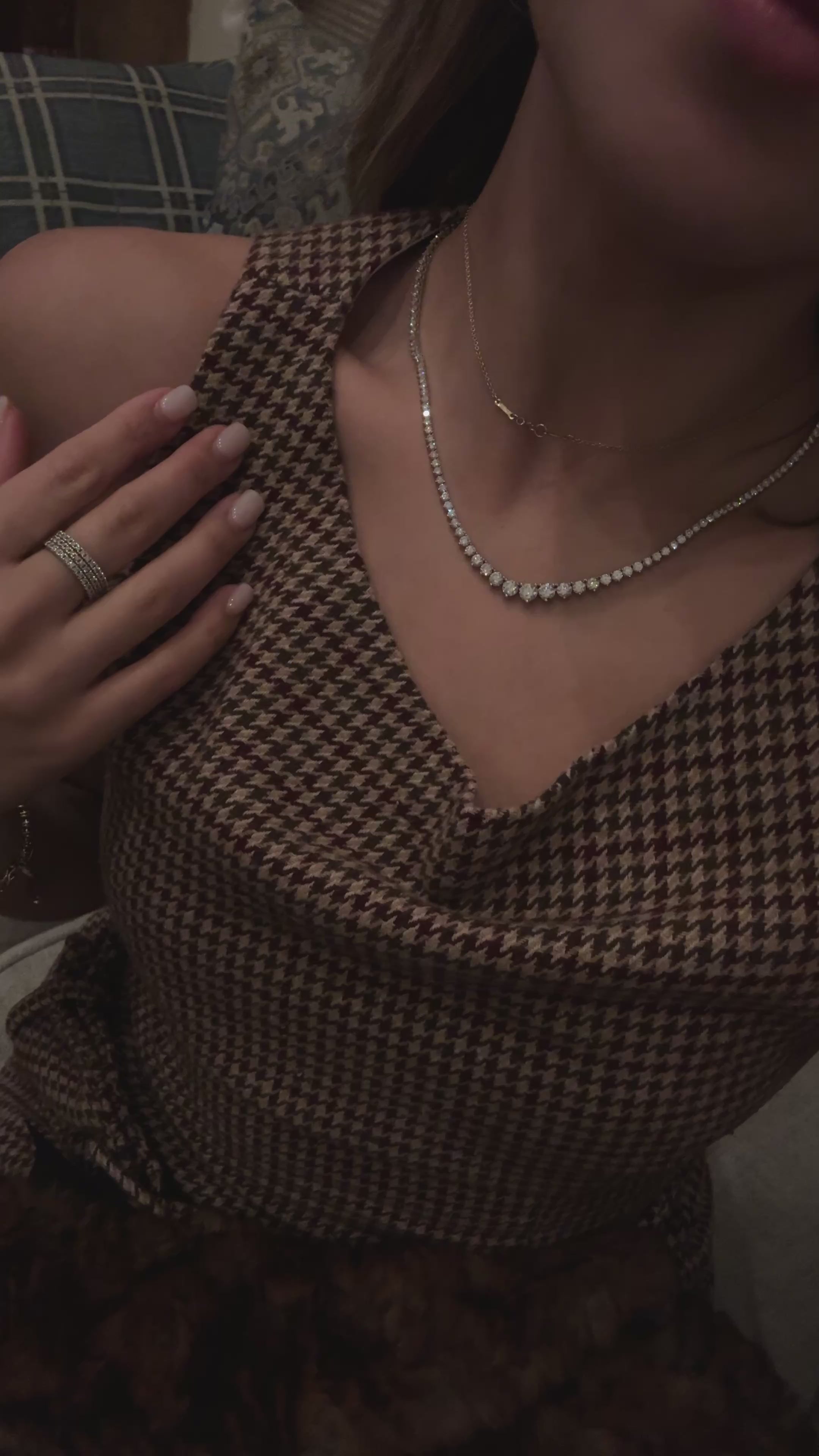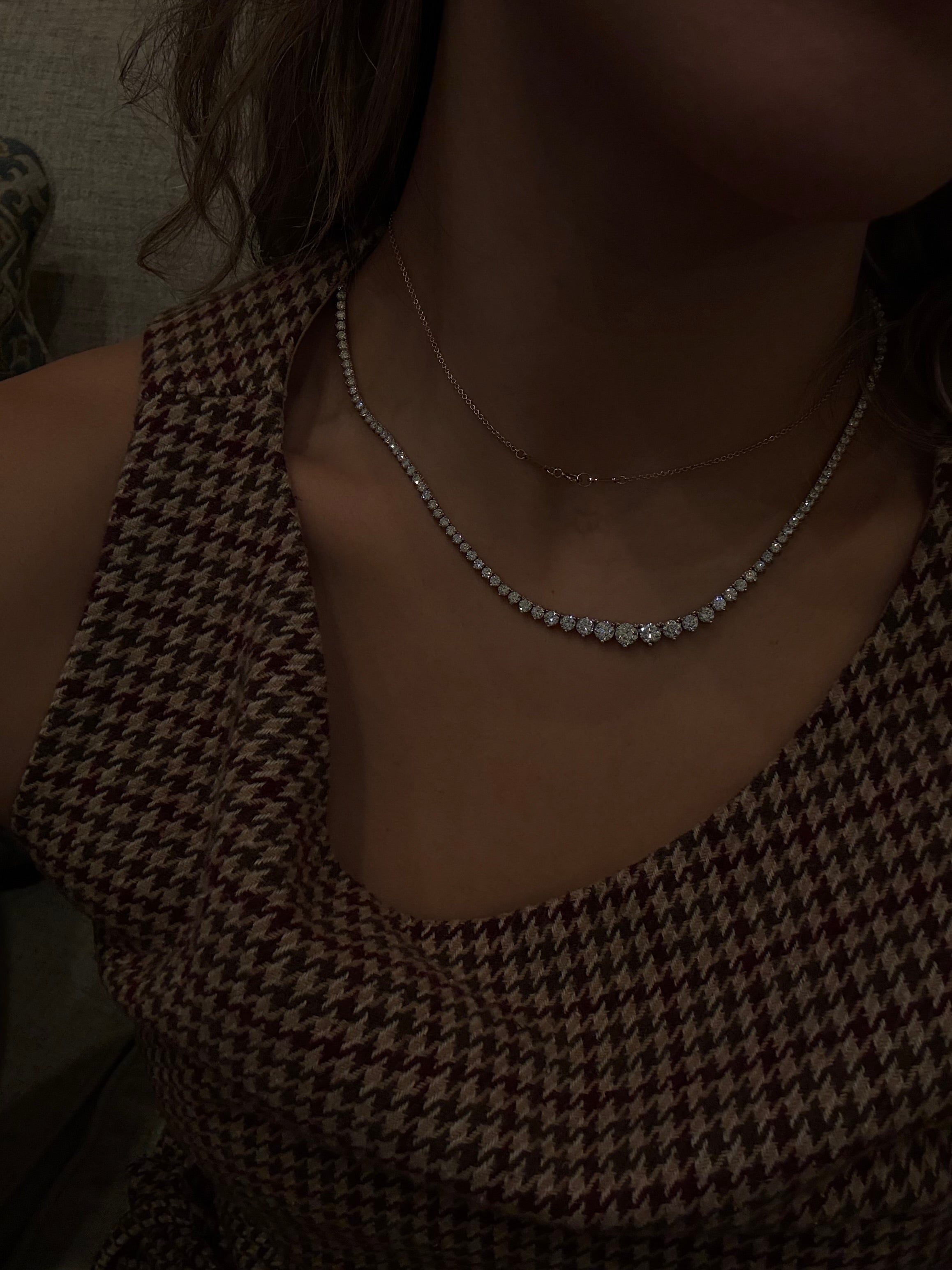 This stunning graduated tennis necklace features brilliant lab-grown diamonds that start with a half-carat center stone and gradually taper in size, creating an elegant, eye-catching sparkle.