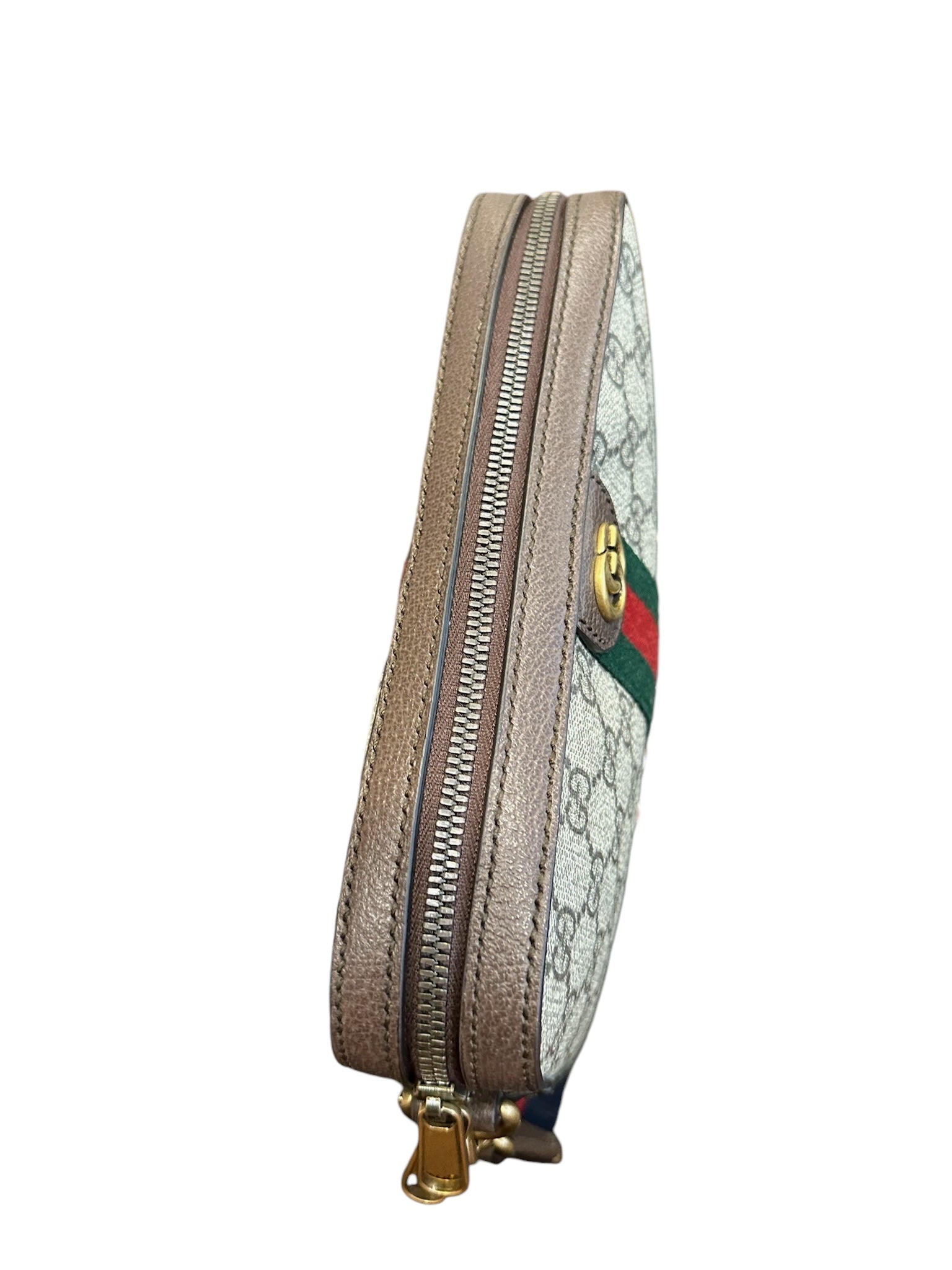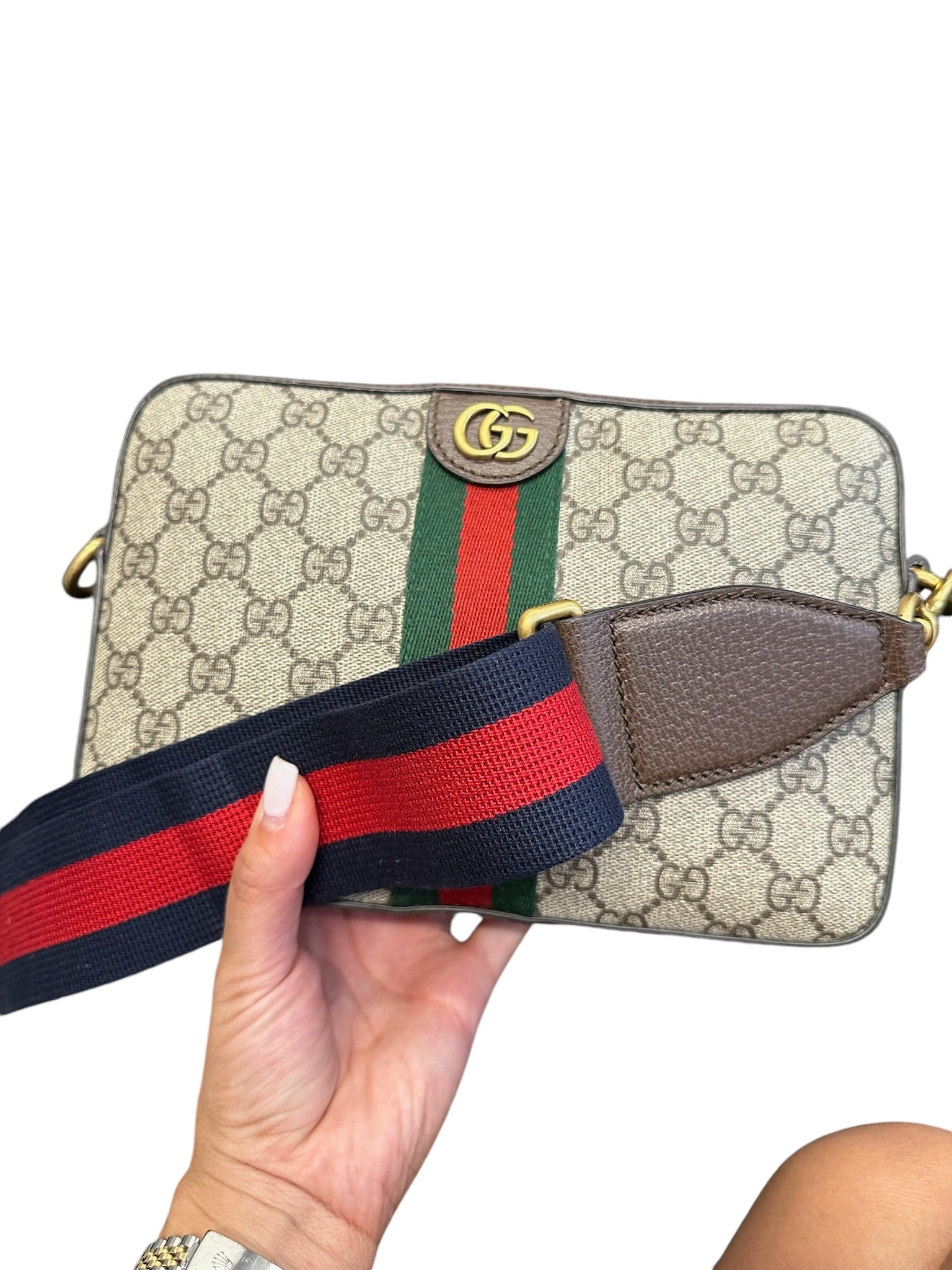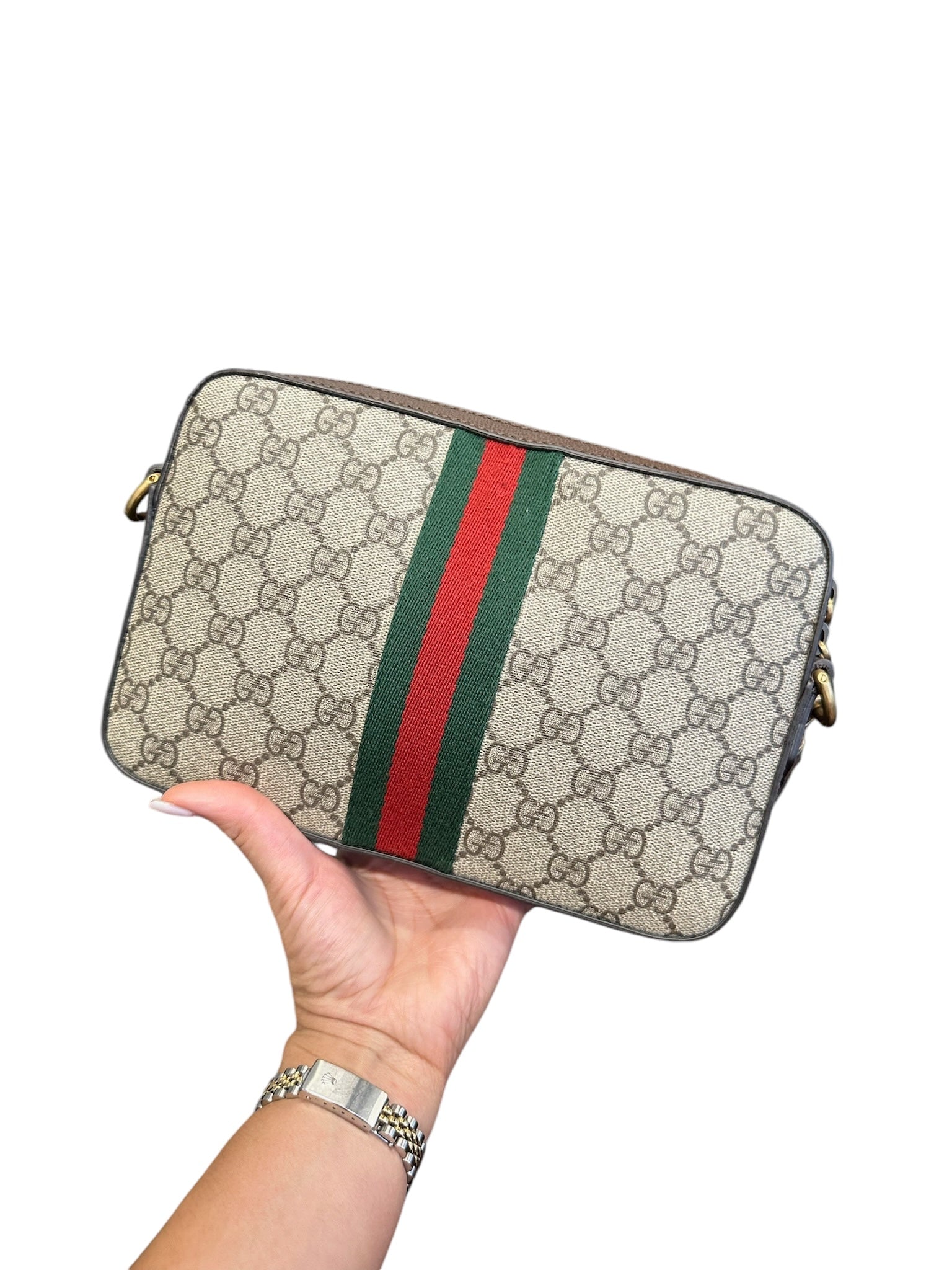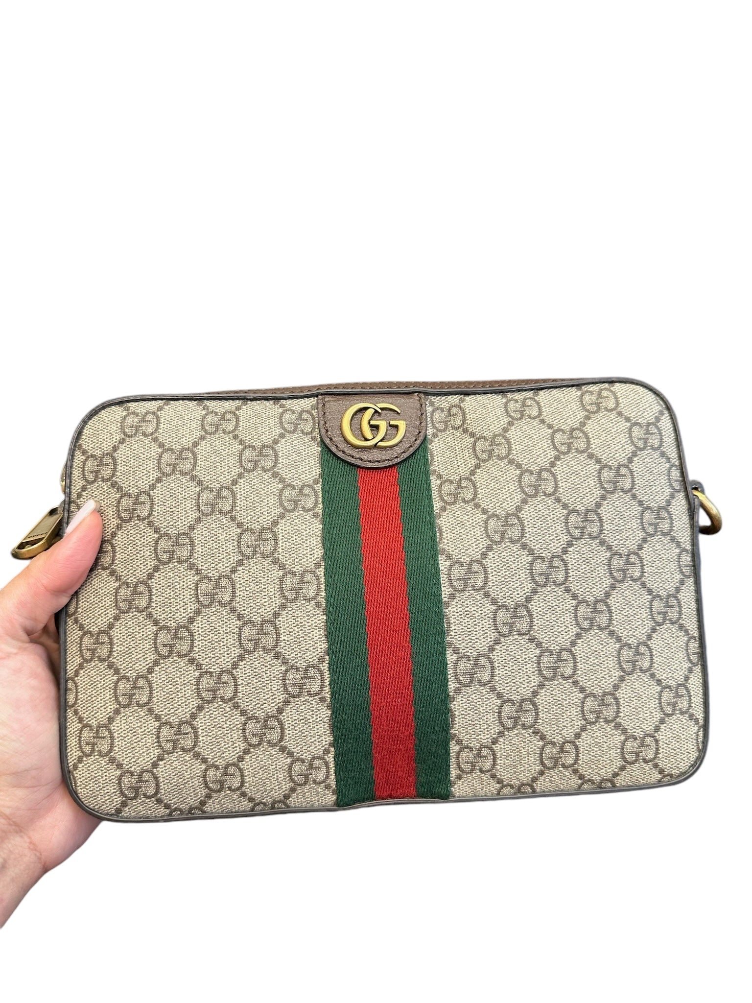 Introducing the GUCCI Beige Ebony GG Supreme Canvas Web Ophidia GG Crossbody Bag. Featuring luxurious golden toned hardware, this bag exudes elegance and sophistication with a touch of shine. Complete your look and elevate your style with this must-have accessory.