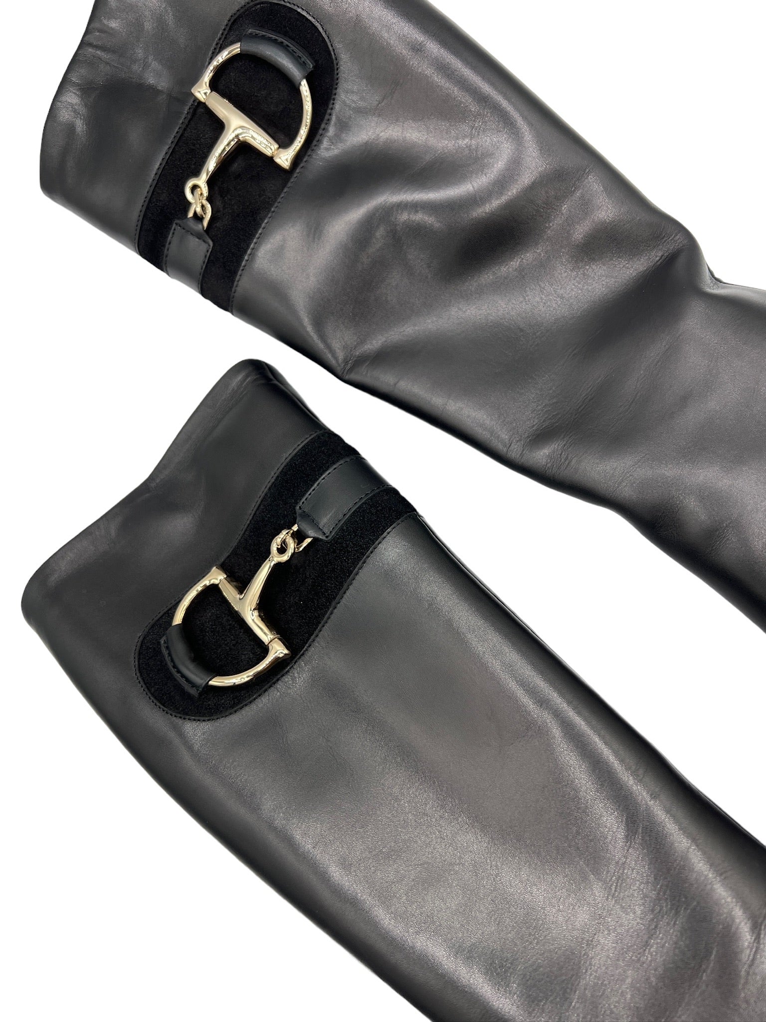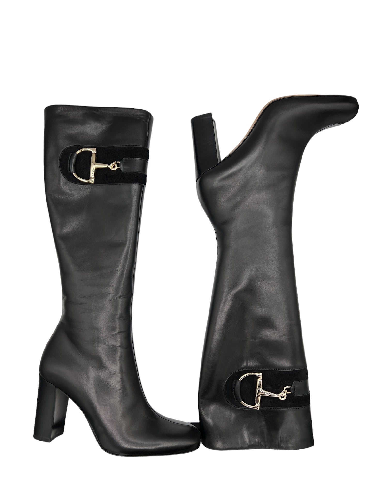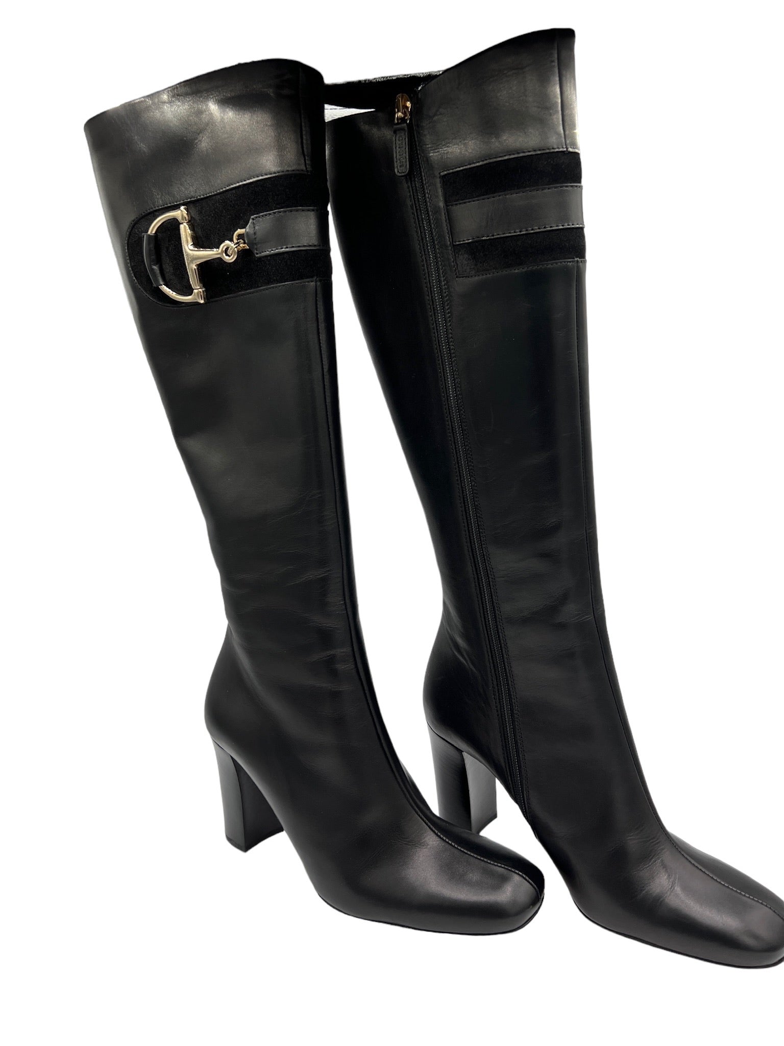 Elevate your shoe game with these GUCCI black leather boots. Crafted with high-quality black leather and accompanied by a box and dust bag, these boots are both stylish and functional. From the renowned fashion house GUCCI, these boots exude elegance and sophistication. Available in women's size 37.