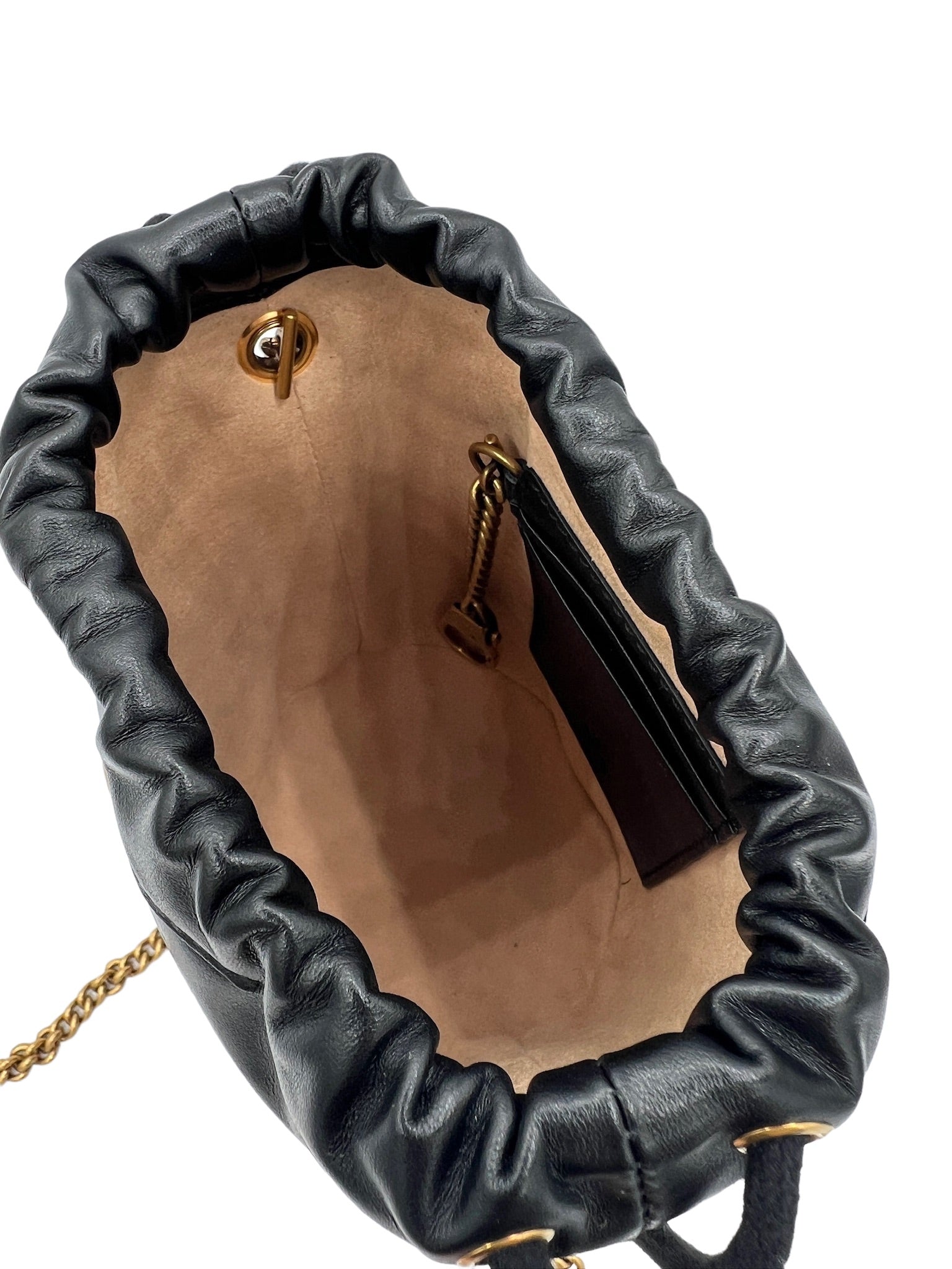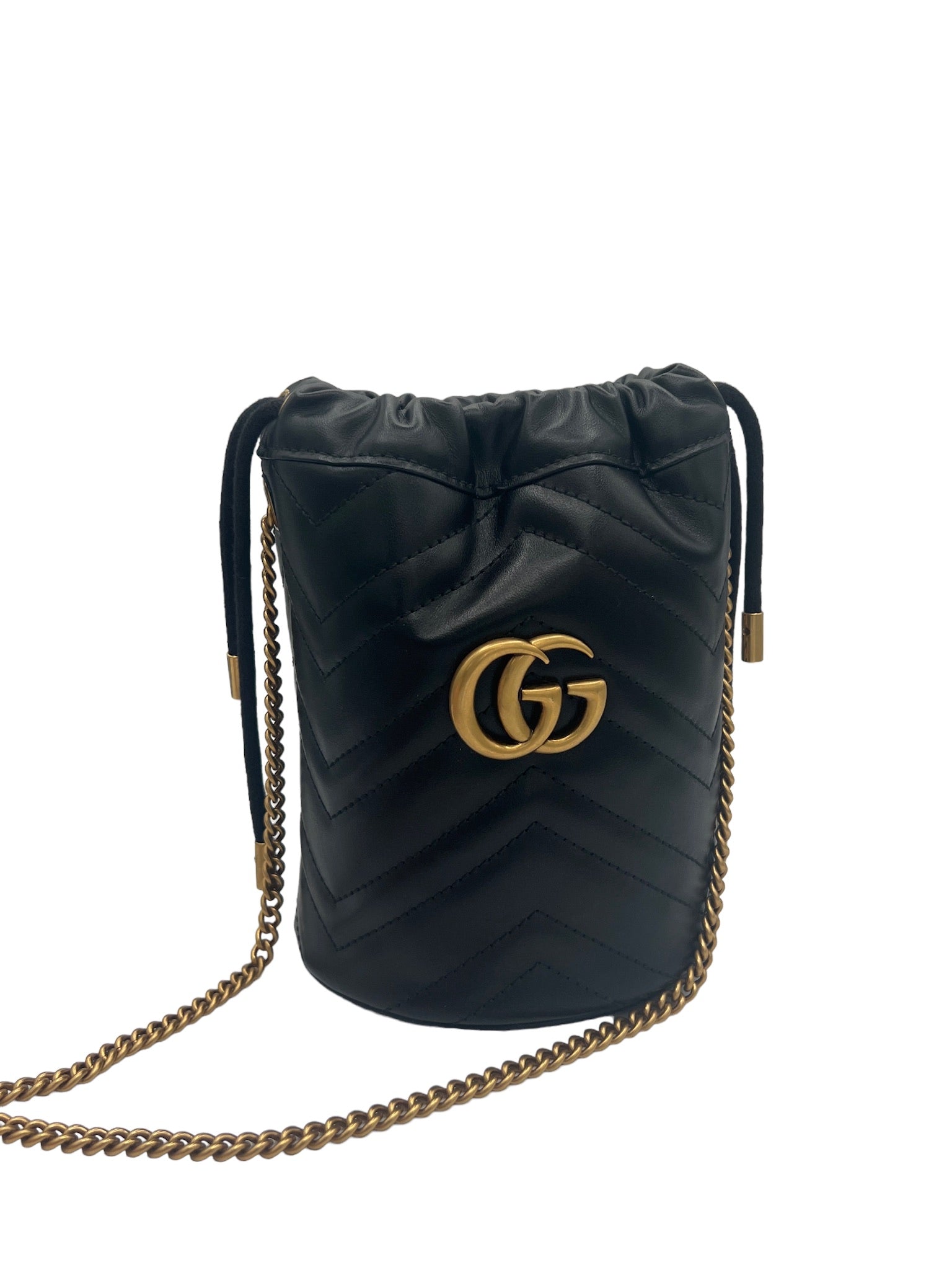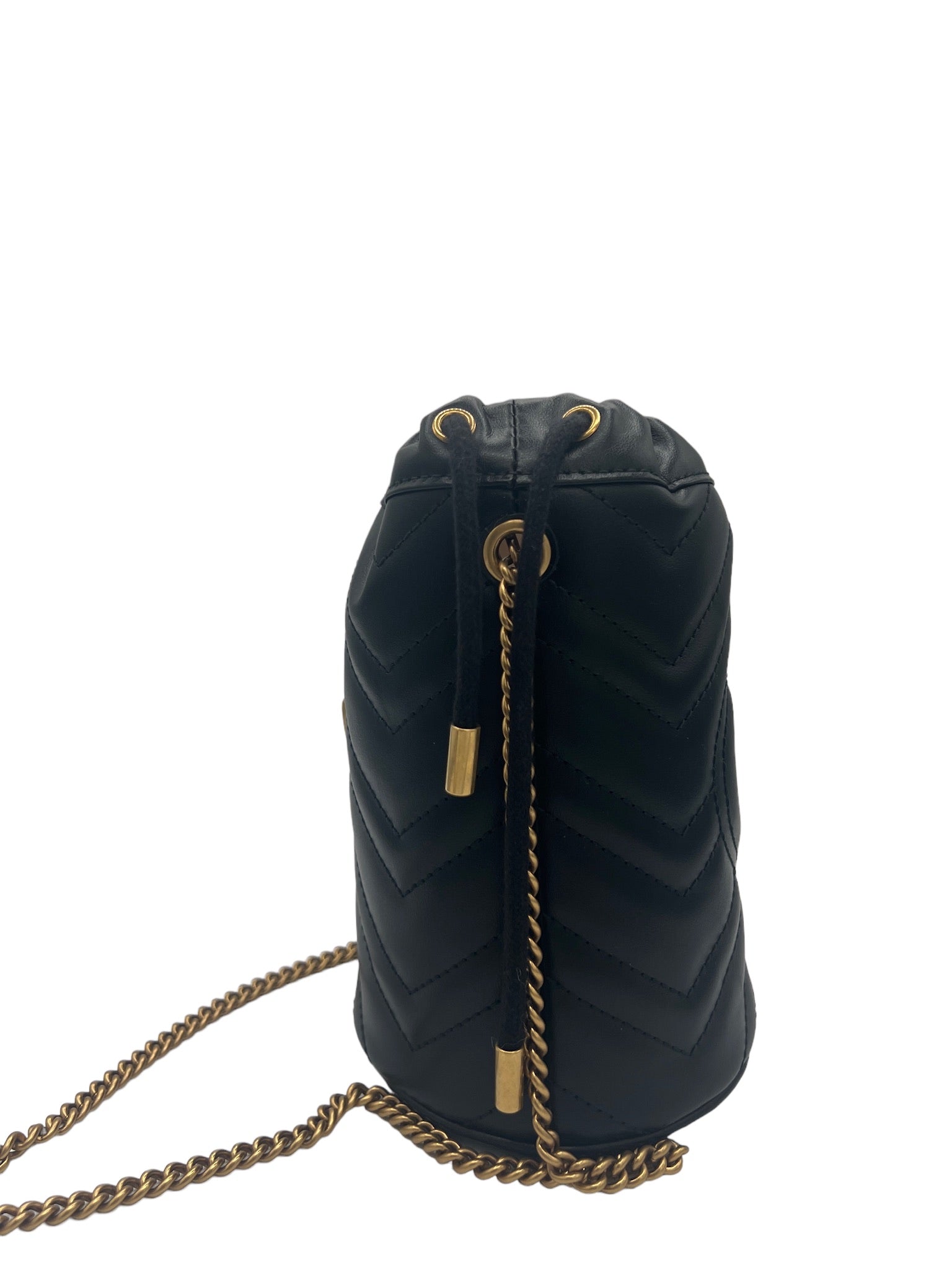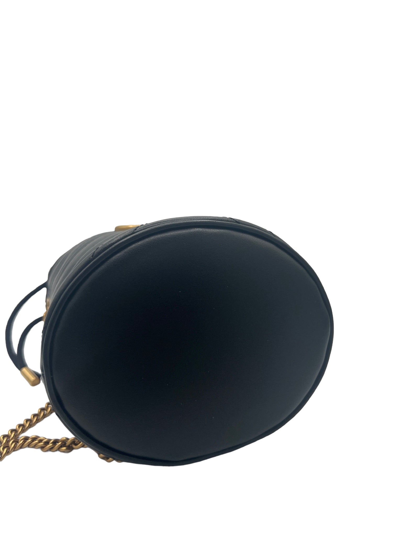 This pre-owned Gucci Black Matelasse Leather Mini GG Marmont Bucket Bag is a stunning addition to any outfit. The small signs of wear outside the bag give it character and show it has been loved.