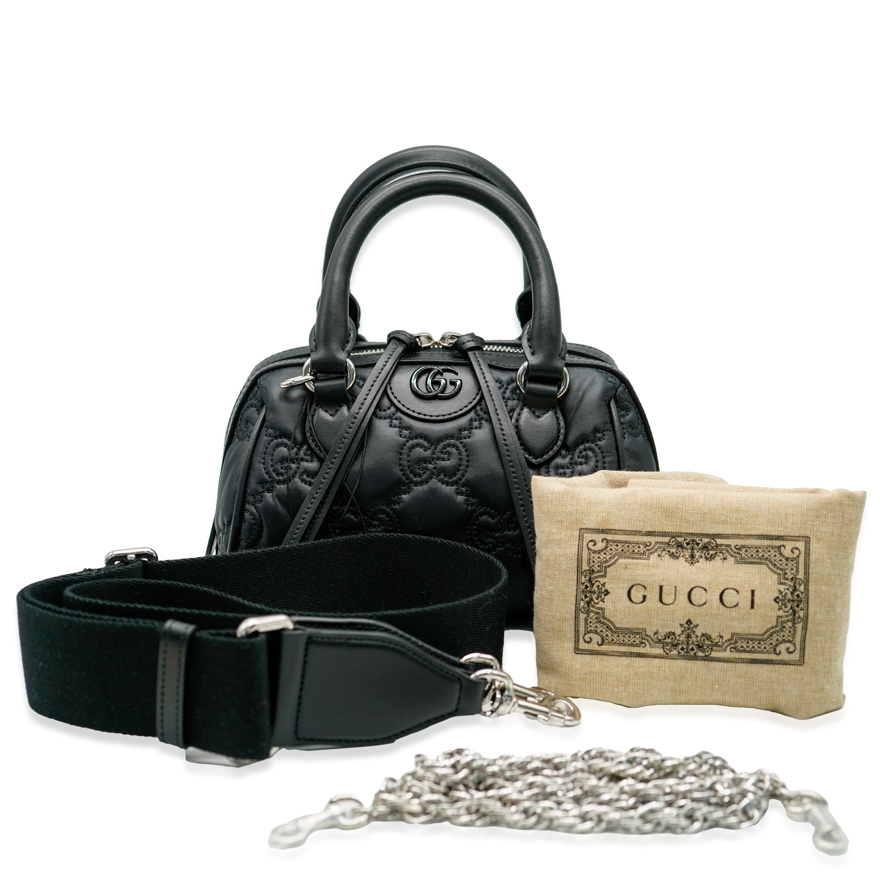 Expertly crafted in Italy, this GUCCI mini bowler bag boasts a sleek black nylon exterior with a striking GG matelassé pattern. Complete with an additional strap and dustbag, this designer accessory offers versatility and practicality. With a handle drop of 3.5 and strap length of 20, it's the perfect size for everyday use. Great condition and includes care booklet.