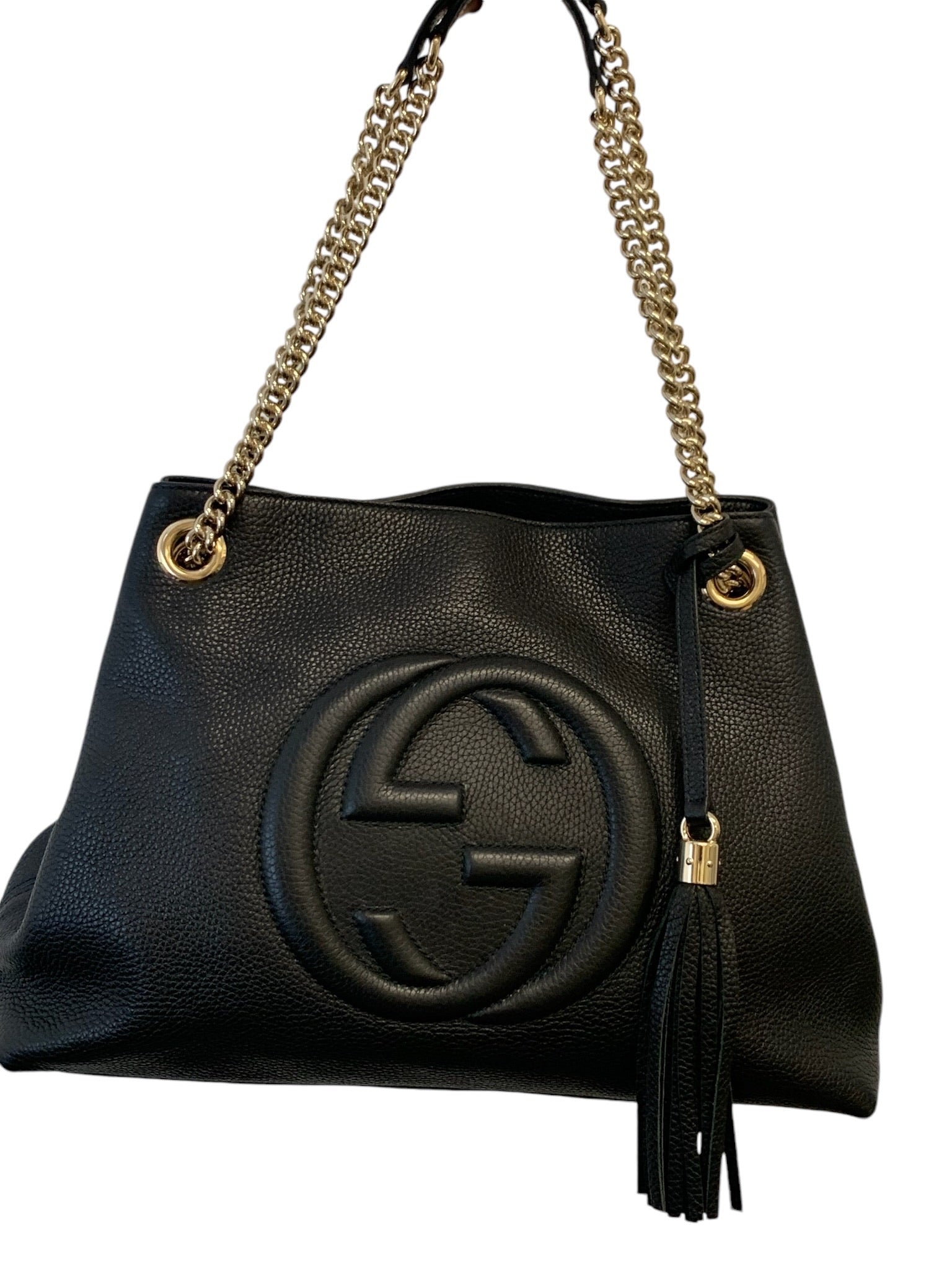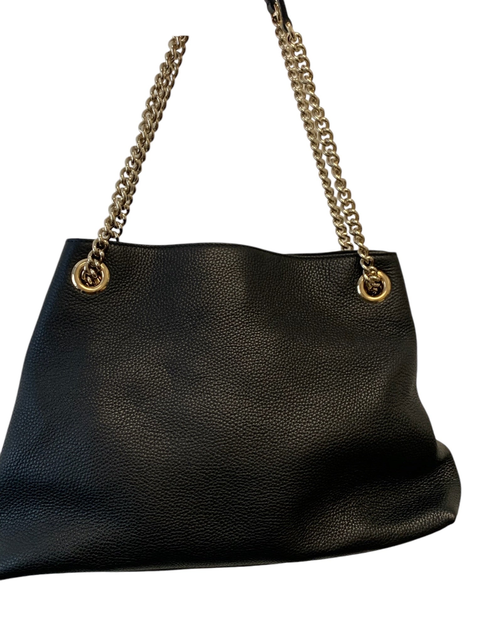 Experience luxury with the GUCCI Soho Disco Chain Tote! Crafted from high-quality pebbled leather, this bag is in like new condition. The versatile black color can complement any outfit and the chain shoulder strap adds a touch of edge. Perfect for any fashion lover looking to elevate their style!
