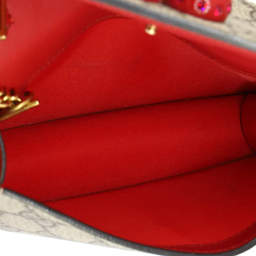 This GUCCI Cherries Wallet on Chain is crafted with GG coated canvas and features an exterior color of brown and interior color of red. The aged gold hardware adds a touch of luxury to the mini design. The fabric interior and detachable strap make this wallet both stylish and functional.