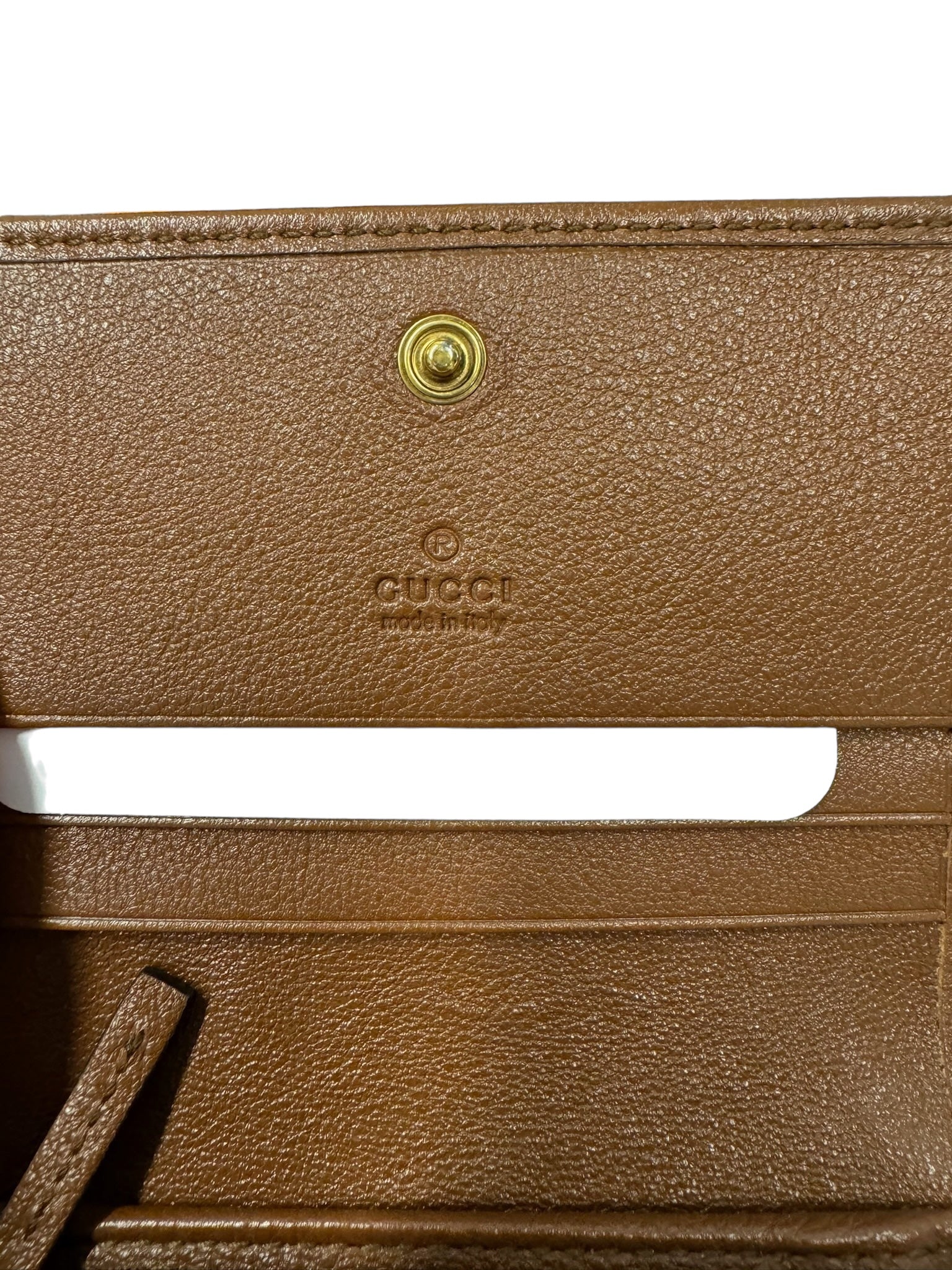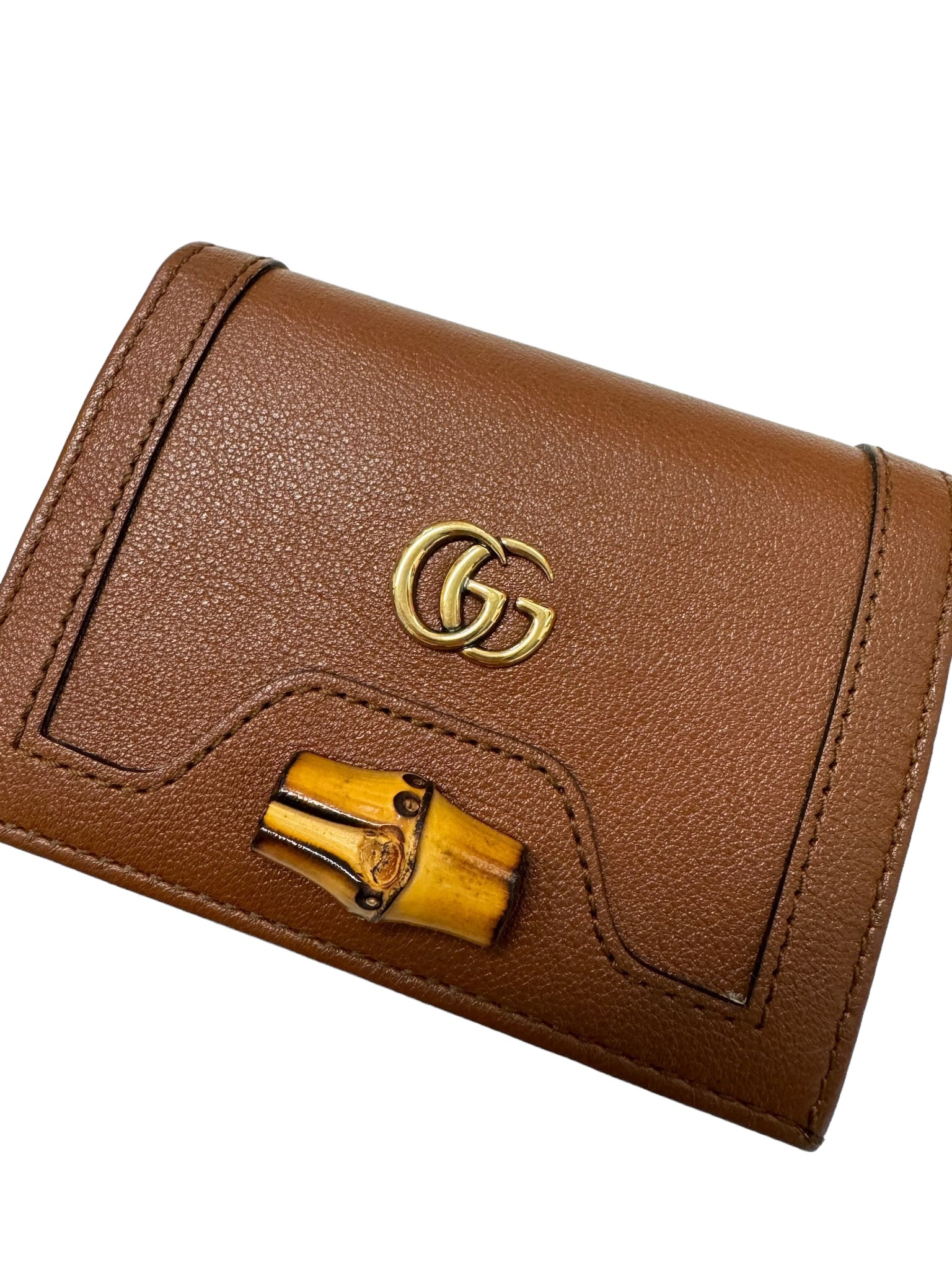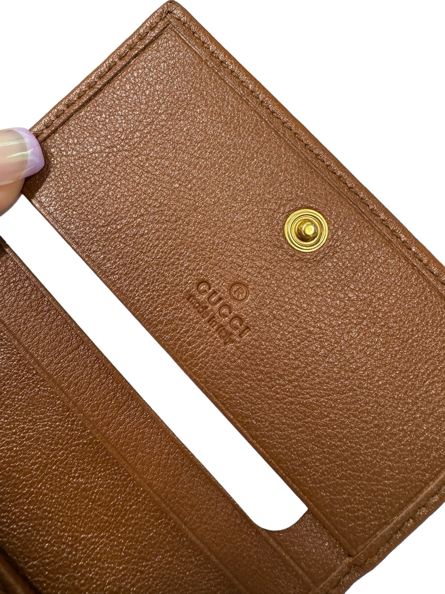 Experience luxury with the GUCCI Cuir Wonka Grain Diana Card Case Wallet. Adorned with golden toned hardware, this wallet radiates elegance and style. Keep your cards secure and organized while making a statement with this high-end accessory.