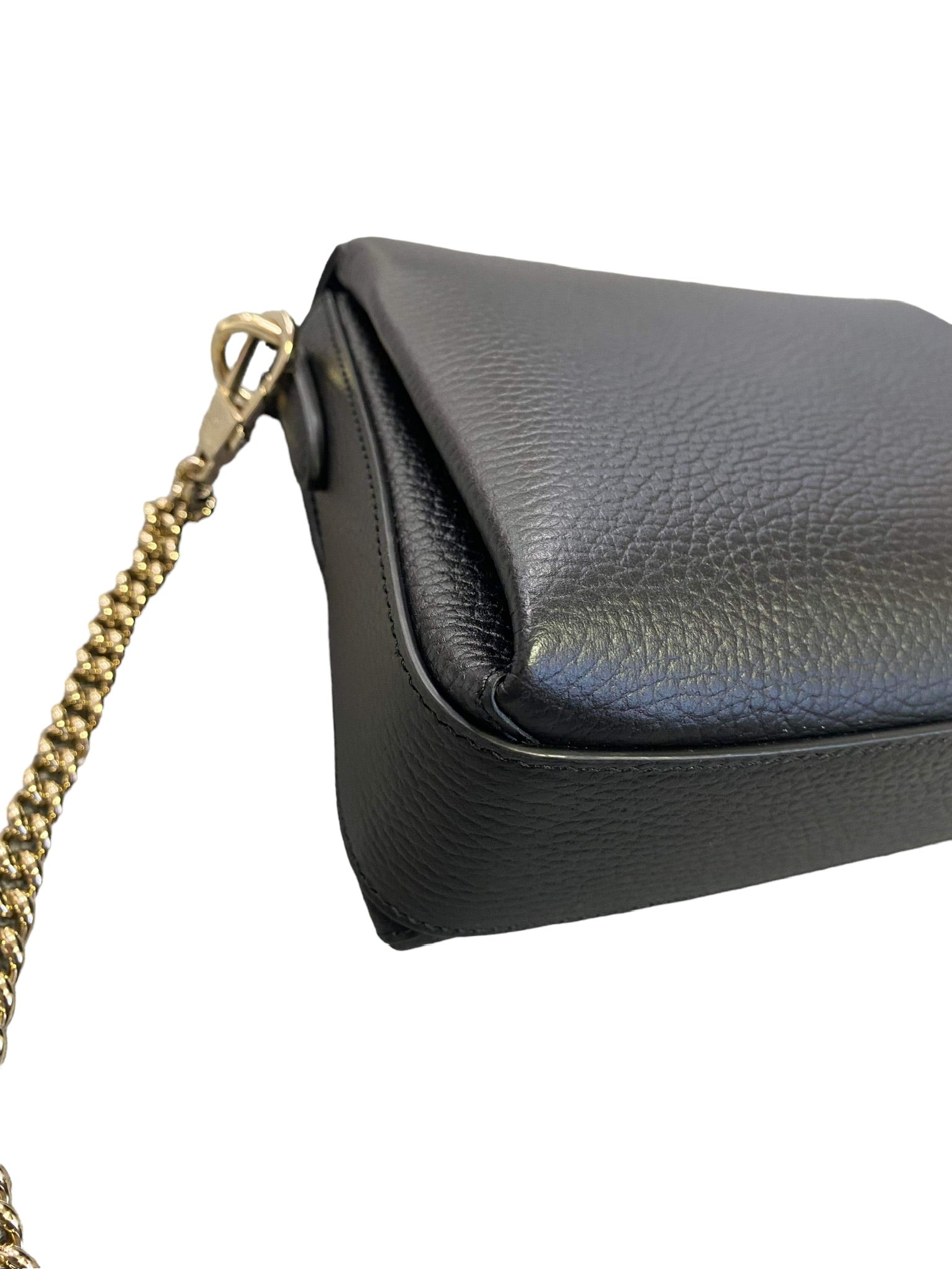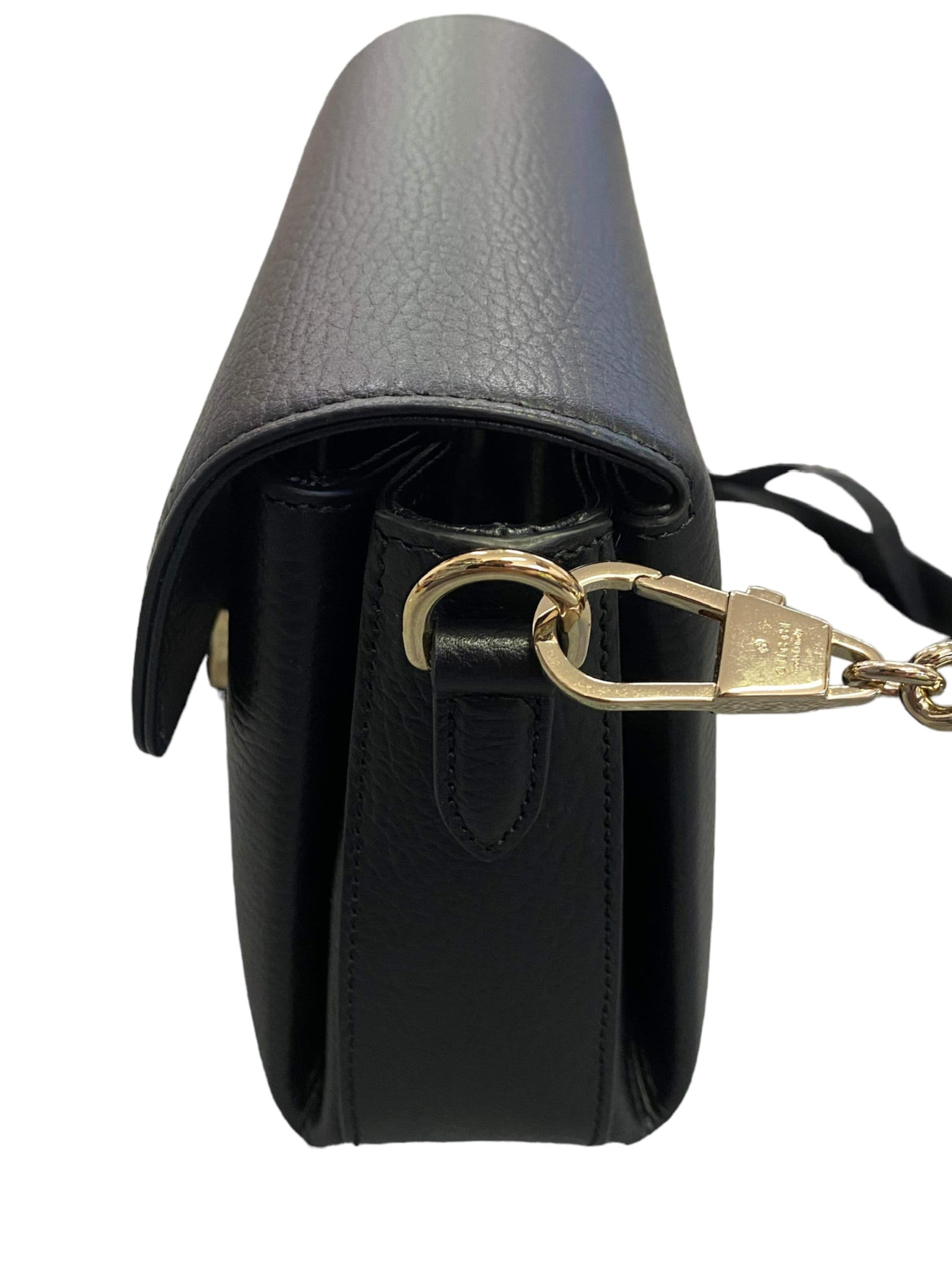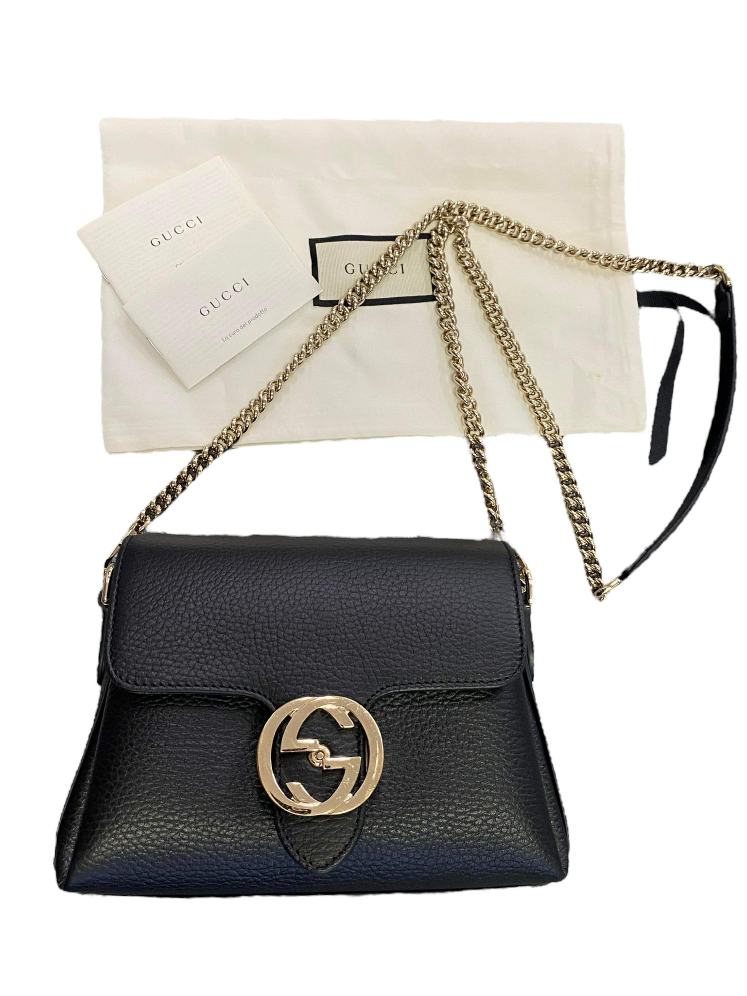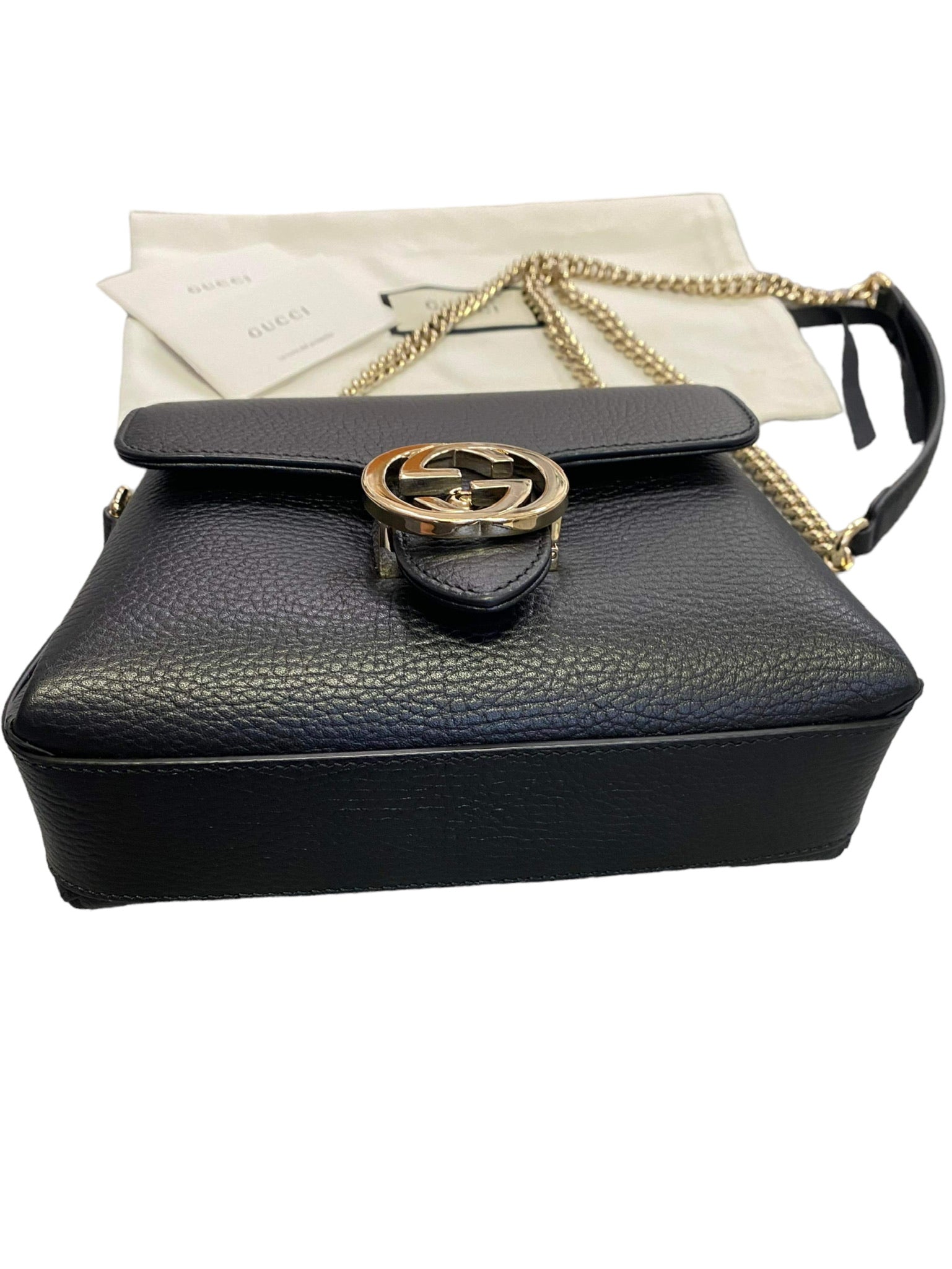 This GUCCI Crossbody Bag is an elegant piece crafted from supple calfskin and embellished with golden hardware. It features an iconic Interlocking G motif, and comes with a dustbag for secure storage. Quality craftsmanship and timeless style make it an ideal accessory for any stylish wardrobe.