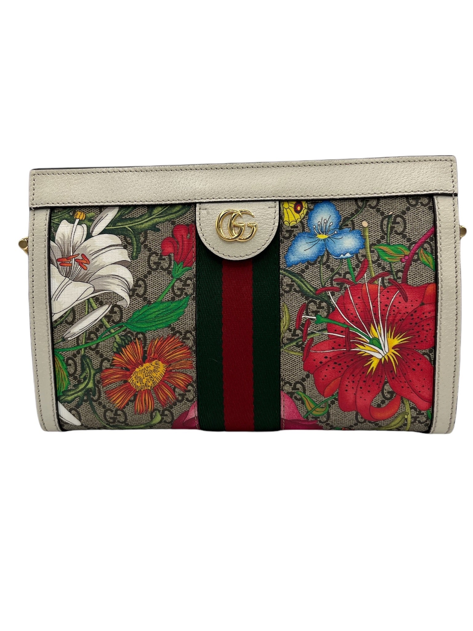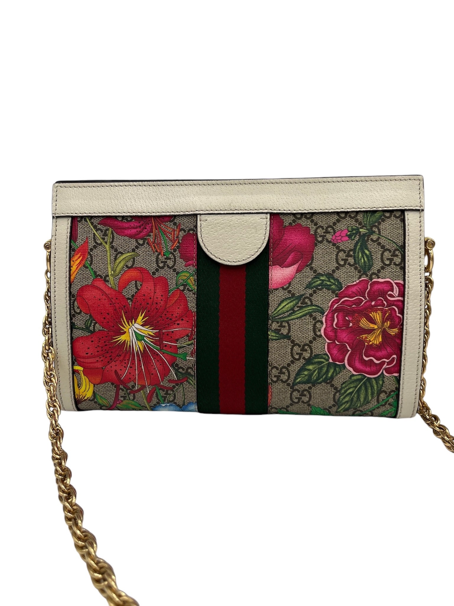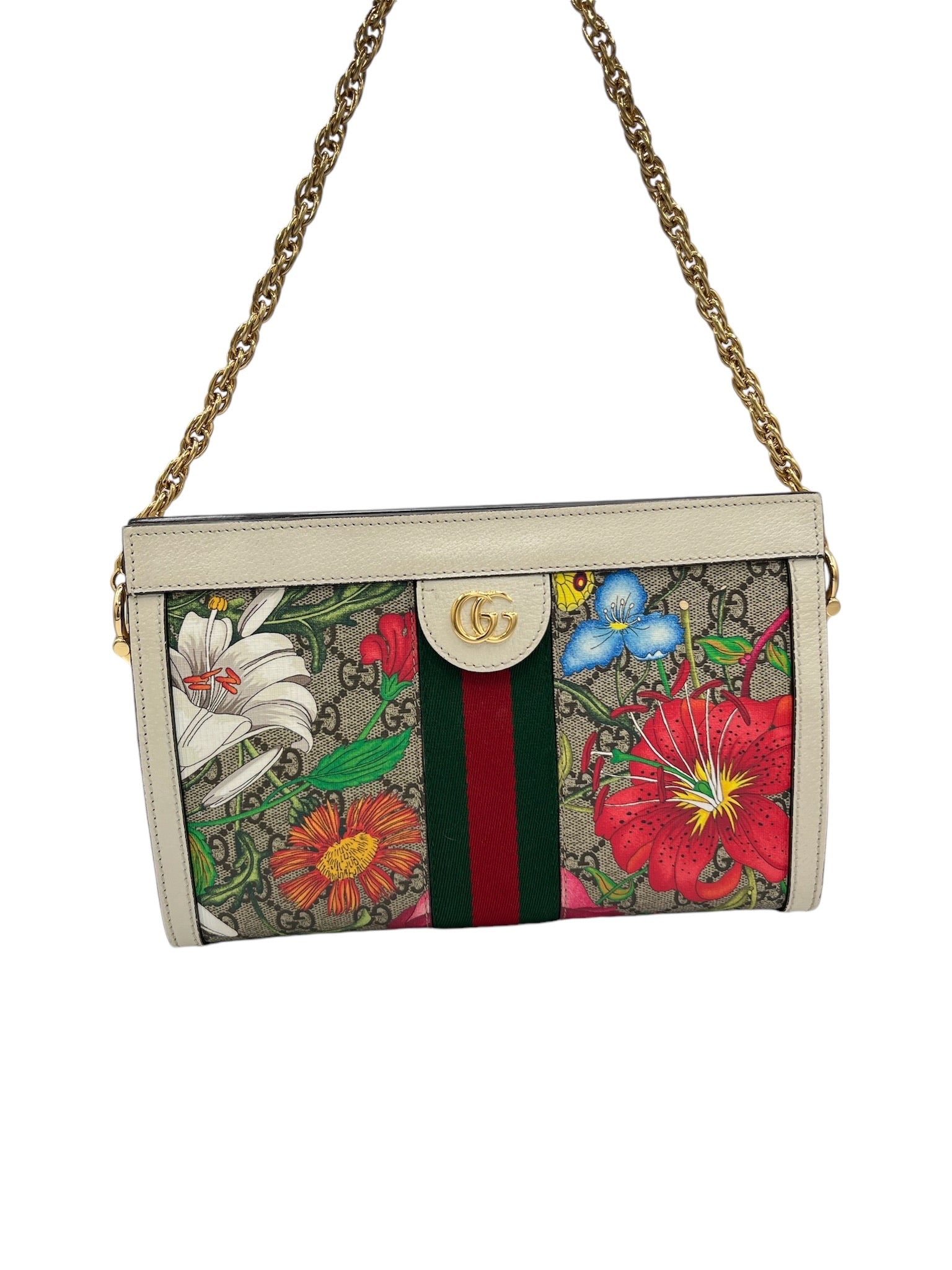 This pre-owned Gucci GG Supreme Monogram Flora Web Small Ophidia Chain Shoulder Bag features golden toned hardware and a stylish multicolor design.