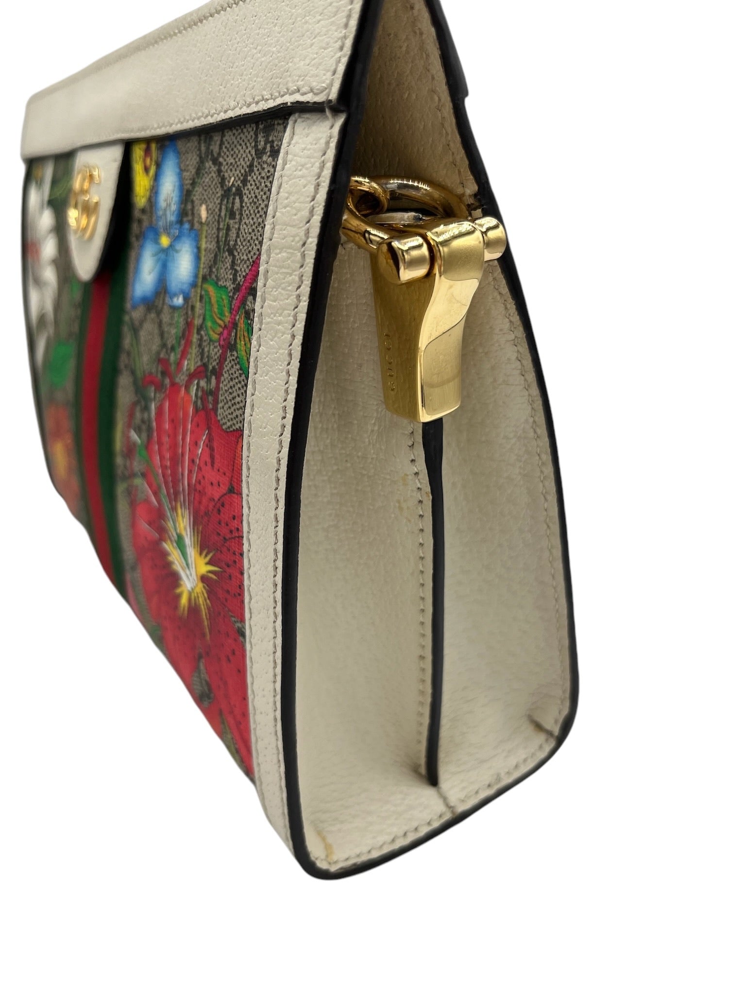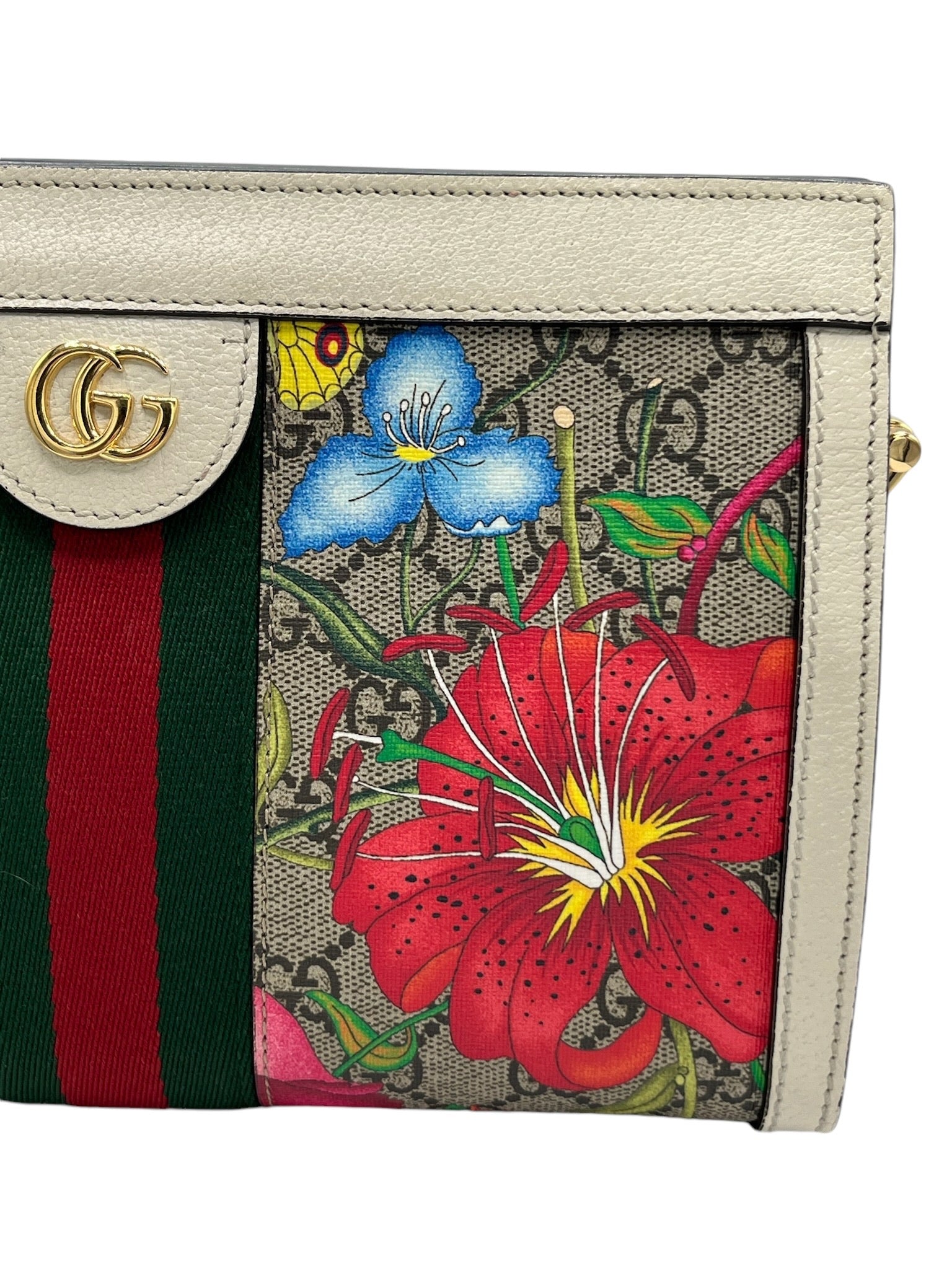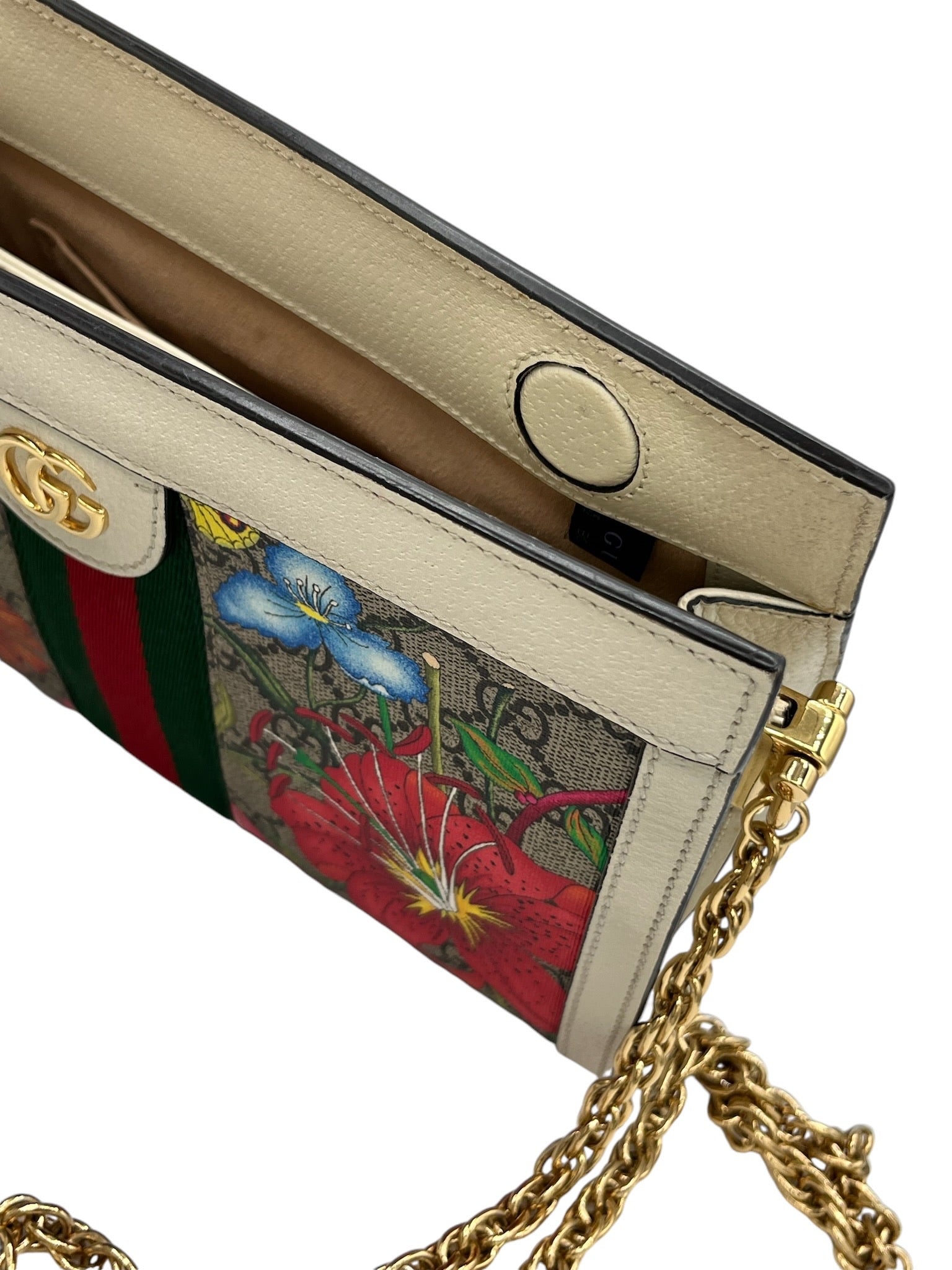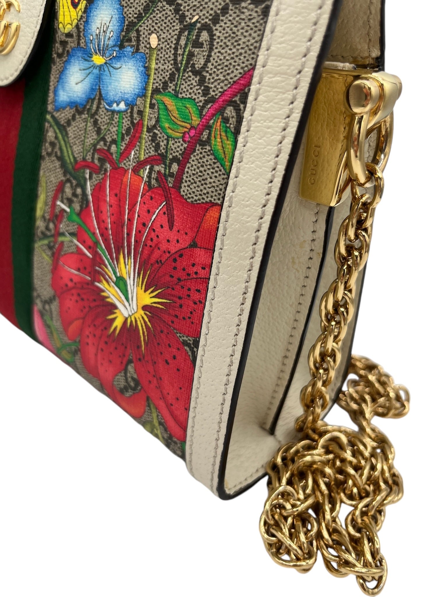 This pre-owned Gucci GG Supreme Monogram Flora Web Small Ophidia Chain Shoulder Bag features golden toned hardware and a stylish multicolor design.