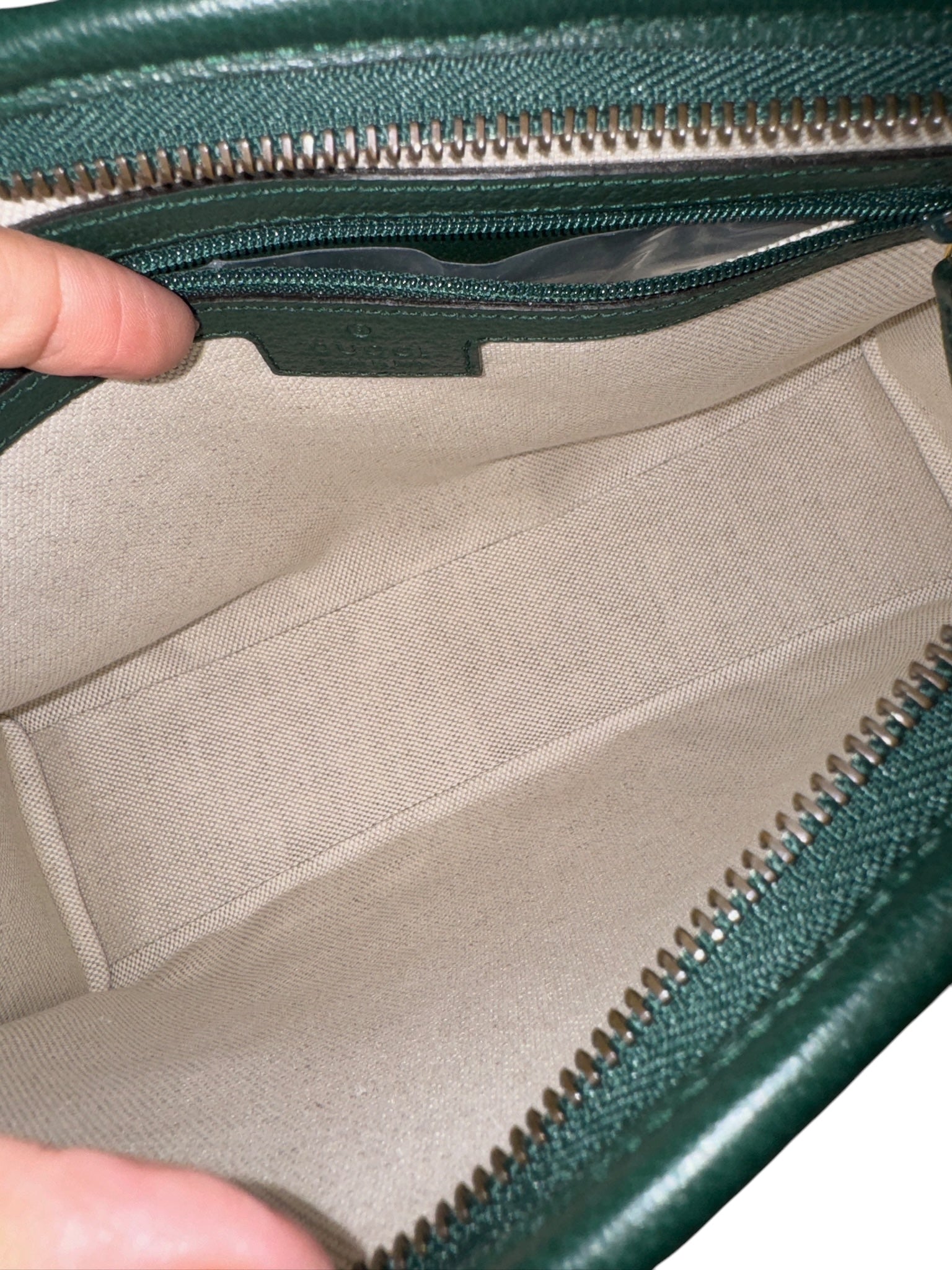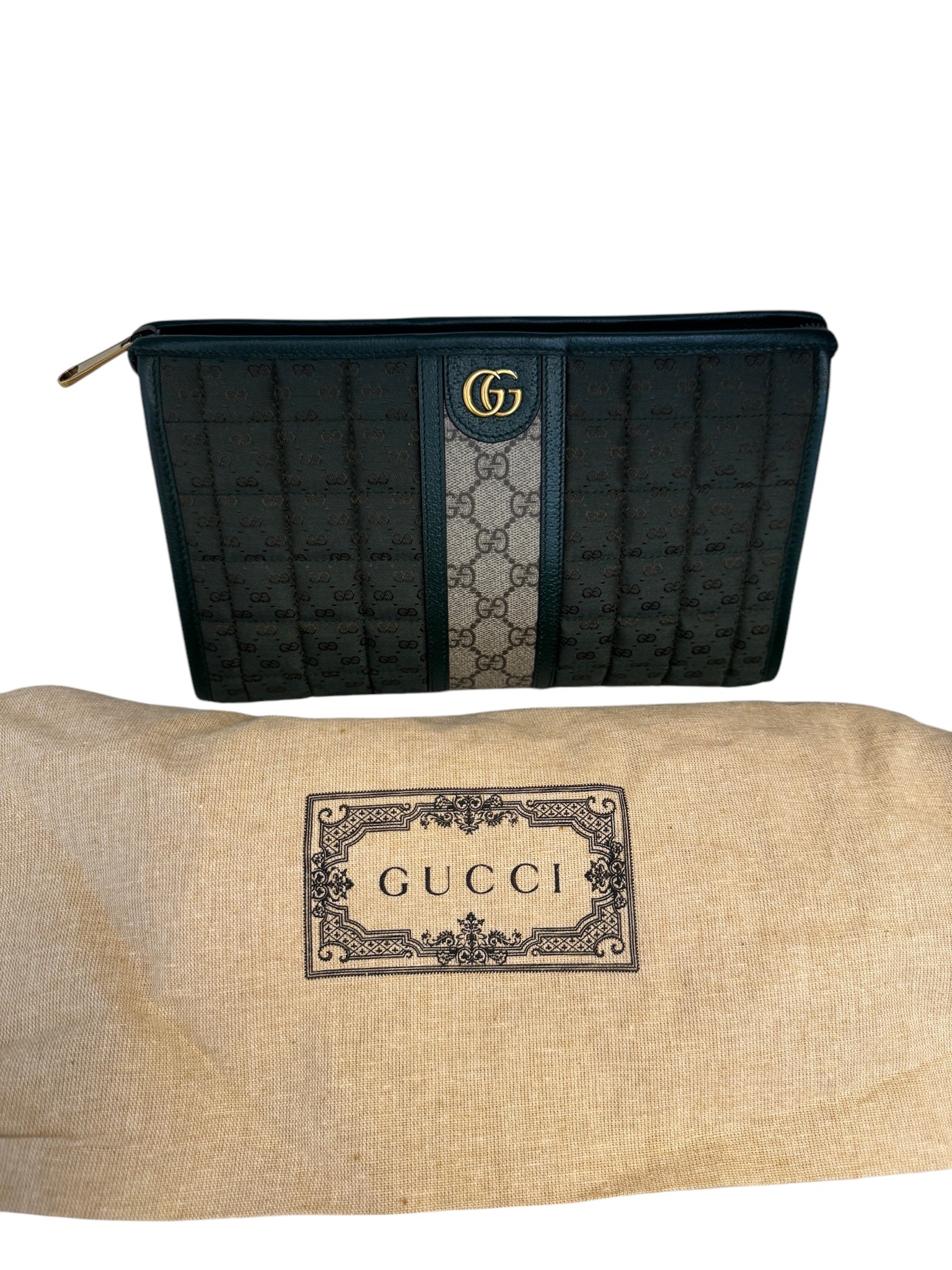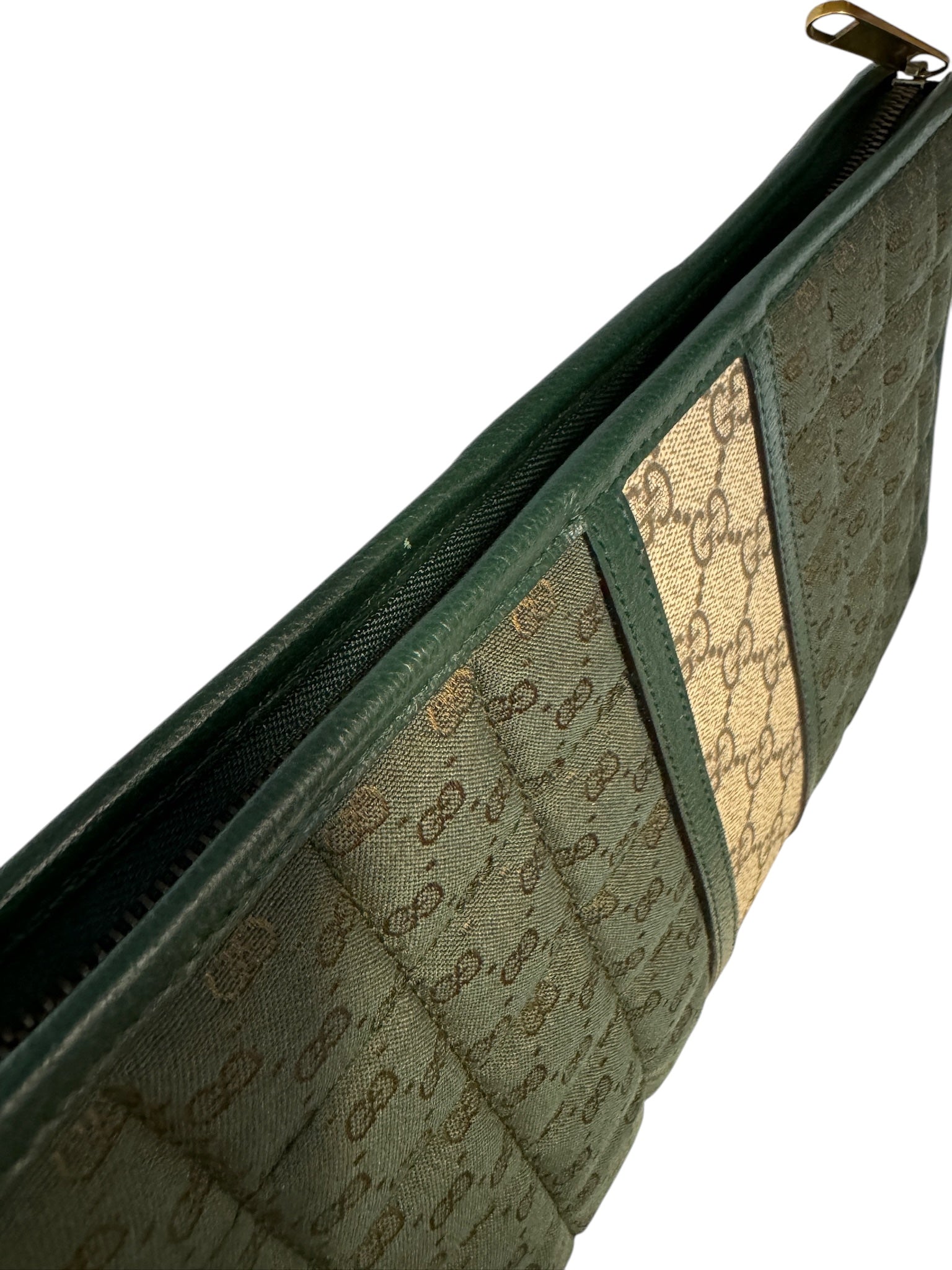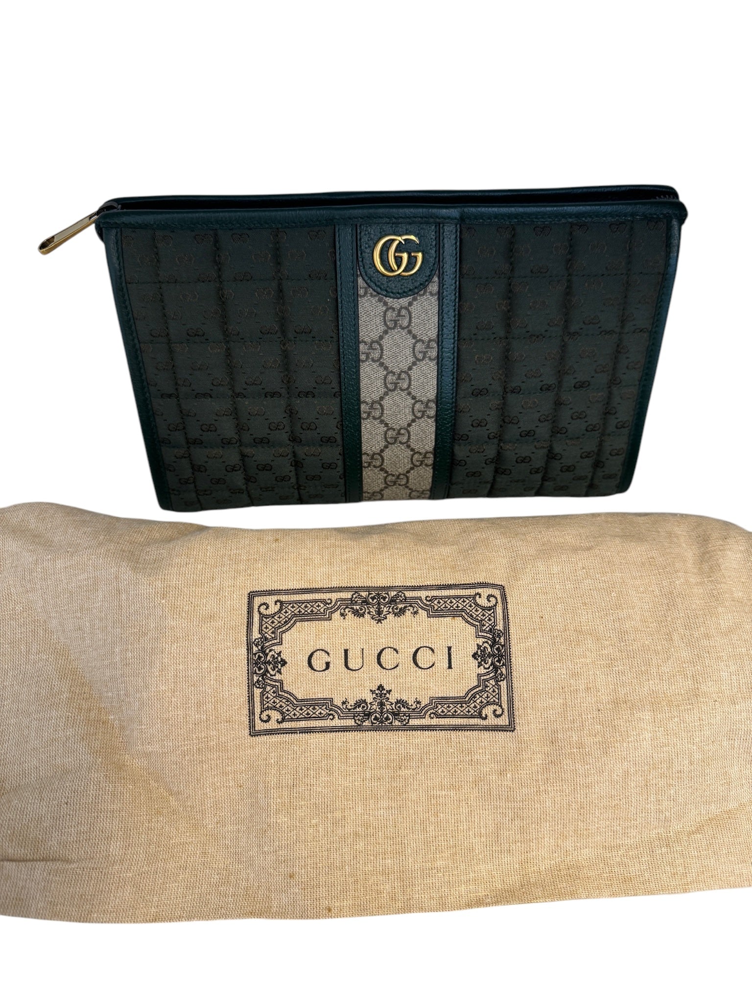 Elevate your style with the GUCCI Green GG Supreme Canvas Microguccissima Canvas Mini Pouch. Adorned with luxurious golden toned hardware, this mini pouch adds a touch of glamour to any outfit. Perfect for carrying small essentials while you're on-the-go. Make a statement with this sleek and stylish accessory.