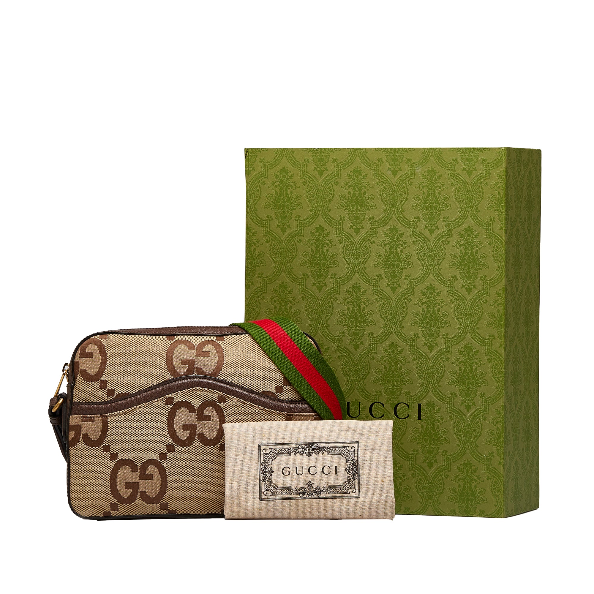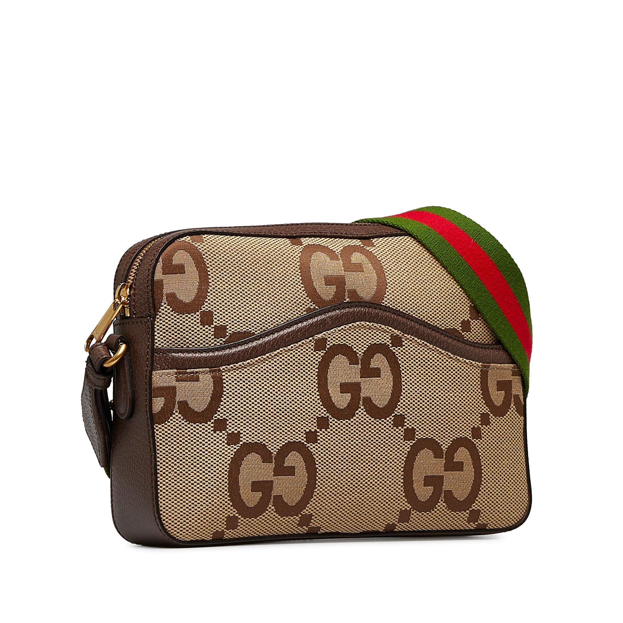 The GUCCI Jumbo GG Canvas Crossbody Bag is a stylish and practical choice. Crafted from canvas, this bag features a top zip closure, exterior slip pocket, flat web strap, and interior zip pocket for all your essentials. Carry this chic bag with you all day for endless style.